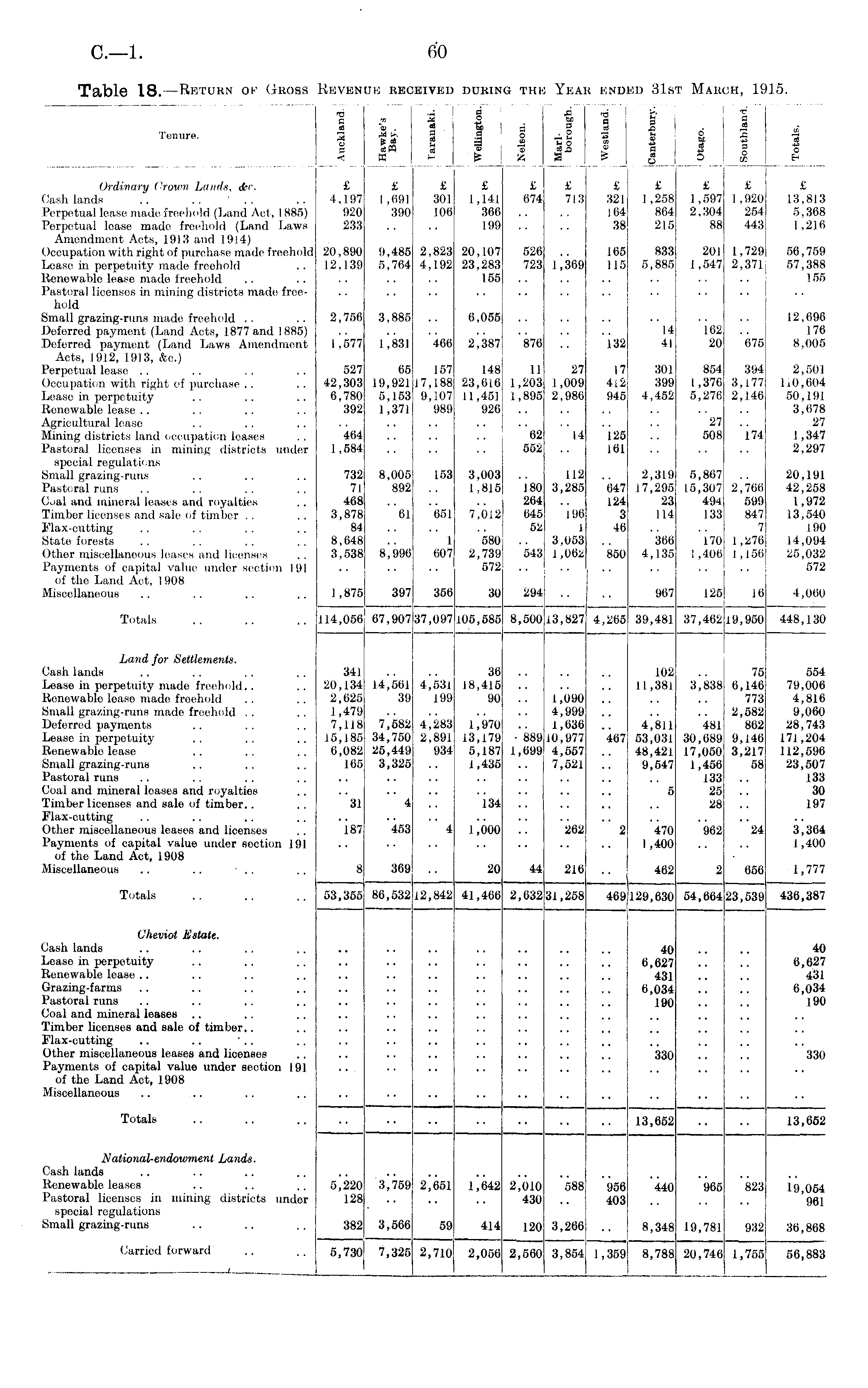Tenure. •c a _ o •3 a § a_ 2 St. a _ K H fc _ a o CO % ft _ p , o _ _ _ o MS a •o a „ CO © §7 I 6 I $ 5 s_ _' £ ._ p o /: _ 73 -_ o f Ordinary Crown Lands, <See. Cash lands Perpetual lease made freehold (Land Act, I 885) Perpetual loase made freehold (Land Laws Amendment Acts, 1913 and 1914) Occupation with right of purchase made freehold Lease in perpetuity made freehold Renewable lease made freehold Pastoral licenses in mining districts made freehold Small grazing-runs made freehold Deferred payment (Land Acts, 1877 and 1885) Deferred payment (Land Laws Amendment Acts, 1912, 1913, etc.) Perpetual lease Occupation with right of purchase Lease in perpetuity Renewable lease Agricultural lease Mining districts land occupation leases Pastoral licenses in mining districts under special regulations Small grazing-runs Pastoral runs Cjal and mineral leases and royalties Timber licenses and sale of timber . . Flax-cutting State forests Other miscellaneous leases and licenses Payments of capital value under section 191 of the Land Act, 1908 Miscellaneous £ 4,197 920 233 £ £ £ 1,691 301 1,141 390 106 366 199 £ 674 £ 713 £ 321 Mil 38 £ £ 1,258 1,597 864 2,304 215 88 £ I .920 254 443 £ 13,813 5,368 1,216 20,890 12,139 9.485 2,823 20,107 5,764 4.192 23,283 165 526 723 526 723 1,369 165 115 833 201 5,885 1,547 1,729 2,371 56,759 57,388 155 2,756 3,885 .. 6,055 132 14 162 41 20 12,696 176 8,005 I . 577 1,831 466 2,387 876 876 132 675 527 42,303 6,780 392 65 157 148 19,921 17,188 23,616 1 5,153 9,107 11,451 I 1,371 989 926 l II 1,203 1,895 11 1,203 1,895 27 1,009 2,986 17 412 945 17 4,2 945 301 854 399 1,376 4,452 5,276 394 3,177 2,146 2,501 110,604 50,191 3,678 27 1,347 2,297 464 1,684 62 552 14 125 125 161 '.'. '27 508 174 62 552 161 732 71 468 3,878 84 8,648 3,538 8,005 153 3,003 892 .. 1,815 "61 651 7,012 180 Oil A 180 264 645 52 264 645 112 3,285 196 1 3,053 I ,062 647 124 3 46 850 647 124 3 46 2,319 5,867 17,295 [5,307 23 49-1 114 133 366 170 4,135 1,406 2,766 599 847 7! 1,276 1,156 20,191 42,258 1,972 13,540 190 14,094 25,032 572 1 5801 8,996 607 2,739 572 52 543 543 850 1 1,875 397! 356 30 294; 294j 967 125 4,060 16 Totals I14,056i 67,907 37,097 105,585 8,500, 13,827 4,265 39,481 37,462 i19,950 448,130 Land for Settlements. ('ash lands Lease in perpetuity made freehold Ronewablo leaso made freehold Small grazing-runs made freehold Deferred payments Lease in perpotuity Renewable lease Small grazing-runs Pastoral runs Coal and mineral leases and royalties Timber licenses and sale of timber. . Flax-cutting Other miscellaneous leases and licenses Payments of capital value under section 191 of the Land Act, 1908 Miscellaneous .. .. • .. 341 20,134 2,625 1,479 7,118 15,185 6,082 165 14,561 39 7,582 34,750 25,449 3,325 4,531 199 4,283 2,891 934 36 .18,415 90 1,970 13,179 5,187 1,435 ■ 889 1,699 1,090 4,999 1,636 10,977 4,557 7,521 102 11,381 4,811 53,031 48,421 9,547 3,838 481 30,689 17,050 1,456 133 25 28 75 6,146 773 2,582 862 9,146 3,217 58 554 79,006 4,816 9,060 28,743 171,204 112,596 23,507 133 30 197 467 31 134 5 4 187 453 4 1,000 262 2 470 1,400 962 "24 1,400 8 369 20 44 216 462 2 656 1,777 Totals 53,355 86,532! |i2,842 41,466 2,632| 31,258 469 429,630 54,664 23,539 436,387 Cheviot Estate. Cash lands Lease in perpetuity Renewable lease Grazing-farms Pastoral runs Coal and mineral leasee Timber licenses and sale of timber.. Flax-cutting .. .. Other miscellaneous leases and licenses Payments of capital value under section 191 of the Land Act, 1908 Miscellaneous 40 6,627 431 6,034 190 40 6,627 431 6,034 190 330 330 Totals 13,652 13,652 National-endowment Lands. Cash lands Renewable leases Pastoral licenses in mining districts under special regulations Small grazing-runs 5,220 128 3,759 2,651 1,642 2,010 430 588 956 403 440 966 823 19,054 961 382 3,566 59 414 120 3,266 8,348 19,781 932 36,868 (Jarried forward 1,359 8,788 5,730 7,325 2,710 2,056 2,560 3,854| 20,746 1,755 50,883