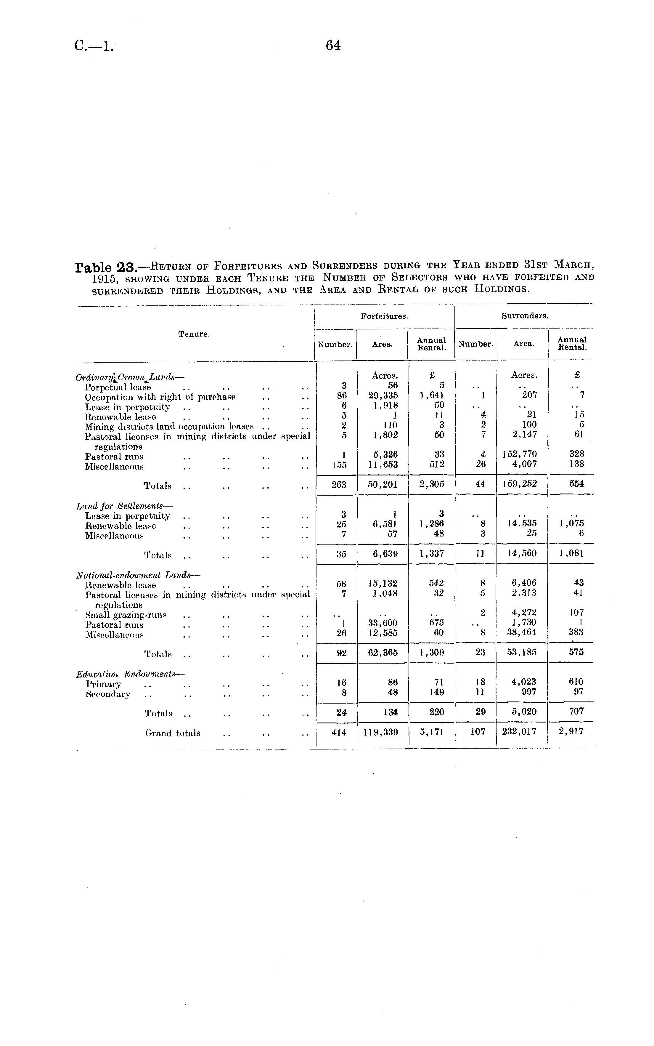 Table 23. —Return of Forfeitures and Surrenders during the Year ended 31st March, 1915, showing under each Tenure the Number of Selectors who have forfeited and surrendered their Holdings, and the Area and Rental of such Holdings.