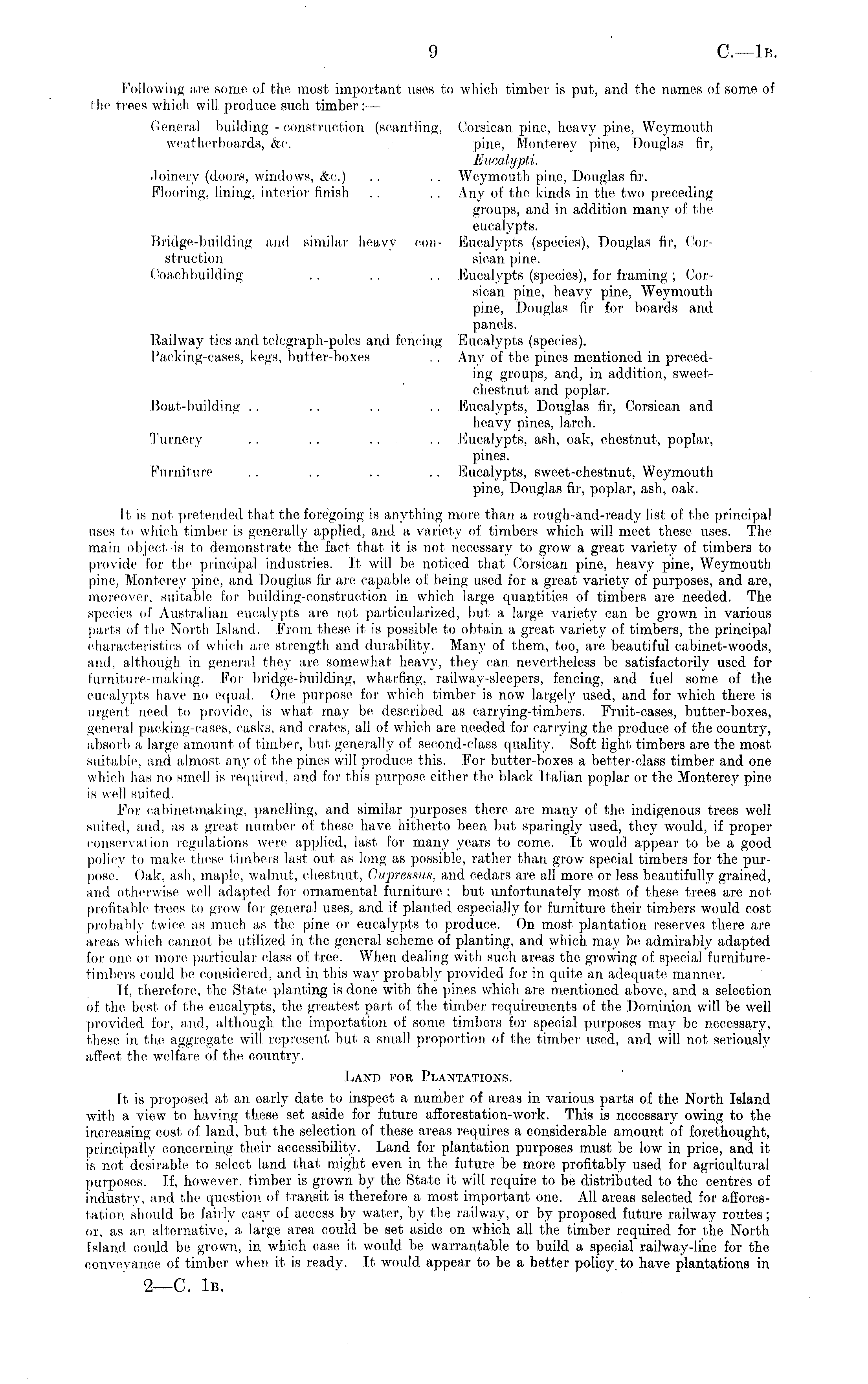 following are some of the most important uses to which timber is put, and the names of some, of the trees which will produce such timber:— Genera] building - construction (scantling, Corsican pine, heavy pine, Weymouth weatherboards, &c. pine, Monterey pine, Douglas fir, Eucalypti. Joinery (doors, windows, &c.) . . . . Weymouth pine, Douglas fir. Flooring, lining, interior finish . . . . Any of the. kinds in the two preceding groups, and in addition many of the eucalypts. Bridge-building and similar heavy con- Eucalypts (species), Douglas fir, Corstruction sican pine. Coach building .. .. .. Eucalypts (species), for framing ; Corsican pine, heavy pine, Weymouth pine, Douglas fir for boards anil panels. Railway ties and telegraph-poles and fencing Eucalypts (species). Packing-cases, kegs, butter-boxes . . Any of the pines mentioned in preceding groups, and, in addition, sweetchestnut and poplar. Boat-building .. .. .. .. Eucalypts, Douglas fir, Corsican and heavy pines, larch. Turnery .. . . . . . . Eucalypts, ash, oak, chestnut, poplar, pines. Furniture .. .. .. . . Eucalypts, sweet-chestnut, Weymouth pine, Douglas fir, poplar, ash, oak. Tt is not pretended that the foregoing is anything more than a rough-and-ready list of the principal uses to which timber is generally applied, and. a variety of timbers which will meet these uses. The main object, is to demonstrate the fact that it is not necessary to grow a great variety of timbers to provide for the principal industries. It will be noticed that Corsican pine, heavy pine, Weymouth pine, Monterey pine, and Douglas fir are capable of being used for a great variety of purposes, and are, moreover, suitable for building-construction in which large quantities of timbers are needed. The species of Australian eucalypts are not particularized, but, a large variety can be grown in various parts of the North Island. From these, it, is possible to obtain a great, variety of timbers, the principal characteristics of which are strength and durability. Man\- of them., too, are beautiful cabinet-woods, and, although in general they are somewhat heavy, they can. nevertheless be satisfactorily used for furniture-making. For bridge-building, wharfktg, railway-sleepers, fencing, and fuel some of the eucalypts have no equal. One purpose for which timber is now largely used, and for which there is urgent need to provide, is what may be described as carrying-timbers. Fruit-cases, butter-boxes, general packing-eases, casks, and crates, all of which are needed for carrying the produce of the country, absorb a large, amount of timber, but generally of second-class quality. Soft light timbers are the most suitable, and almost any of the pines will produce this. For butter-boxes a better-class timber and one which has no smell is required, and for this purpose, either the black Italian poplar or the Monterey pine is well suited. For eabinetmaking, panelling, and similar purposes there are many of the indigenous trees well suited, and, as a great number of these have hitherto been but sparingly used, they would, if proper conservation regulations were applied, last for many years to come. It would appear to be a good policy to make these timbers last out as long as possible, rather than grow special timbers for the purpose. Oak, ash, maple, walnut, chestnut, Cupressus, and cedars are all more or less beautifully grained, and other-wise well adapted for ornamental furniture ; but unfortunately most of these trees arc not profitable, trees to grow for general uses, and if planted especially for furniture their timbers would cost probably twice as much as the pine or eucalypts to produce. On most plantation reserves there are areas which cannot be utilized in the general scheme of planting, and which may be admirably adapted for one or more particular class of tree. When dealing with such areas the, growing of special furnituretimbers could be considered, and in this way probably provided for in quite an adequate manner. If, therefore, the State planting is done with the pines which are mentioned above, and a selection of the best of the eucalypts, the greatest part of the timber requirements of the Dominion will be well provided for, and, although the importation of some timbers for special purposes may be necessary, these in the aggregate will represent, but a small proportion of the timber used, and will not seriously affect, the welfare of the country. Land for Plantations. It is proposed at an early date to inspect a number of areas in various parts of the North Island with a view to having these set aside for future afforestation-work. This is necessary owing to the increasing cost of land, but the selection of these areas requires a considerable amount, of forethought, principally concerning their accessibility. Land for plantation purposes must be low in price, and it is not desirable to select land that might even in the future be more profitably used for agricultural purposes. If, however, timber is grown by the State it will require to be distributed to the centres of industry, and the question of transit is therefore a most important one. AU areas selected for afforestation should be fairly easy of access by water, by the railway, or by proposed future railway routes; or, as an alternative, a large area could be set aside on which all the timber required for the North Island could be grown, in which case it would be warrantable to build a special railway-line for the conveyance of timber when it is ready. It would appear to be a better policy, to have plantations in