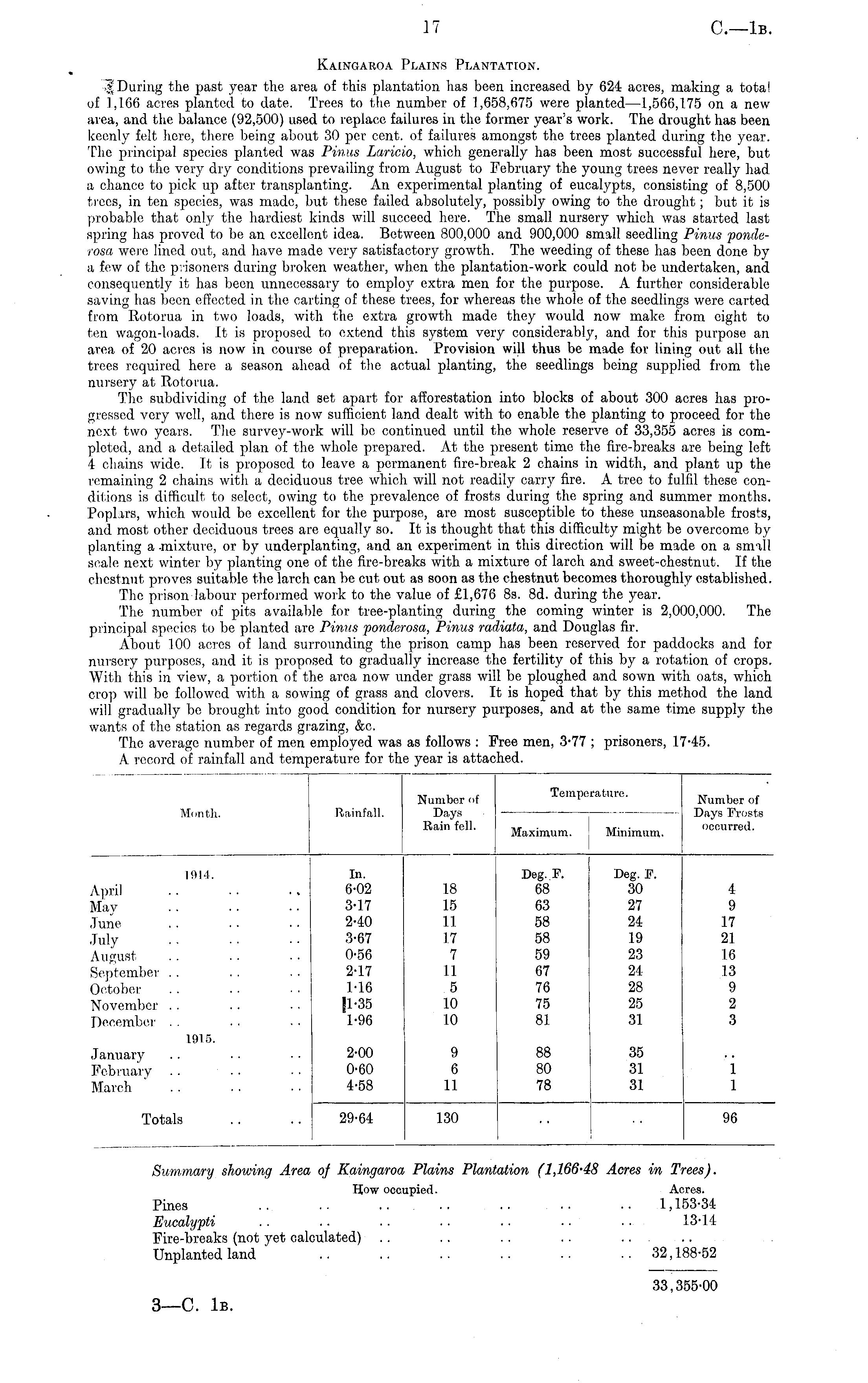 Month. Rainfall. Number of Days Rain fell. Temperature. Number of Days Frosts occurred. Maximum. Minimum, 1914. April May June July August September .. October November . . December . . In. 6-02 3-17 2-40 3-67 0-56 2-17 1-16 |l-35 1-96 18 15 11 17 7 11 5 10 io Deg. F. 68 63 58 58 59 67 76 75 81 Deg. F. 30 27 24 19 23 24 28 25 31 4 9 17 21 16 13 9 2 3 1915. 2-00 0-60 4-58 9 6 II 88 80 78 35 31 31 January February March 1 1 Totals 29-64 130 96