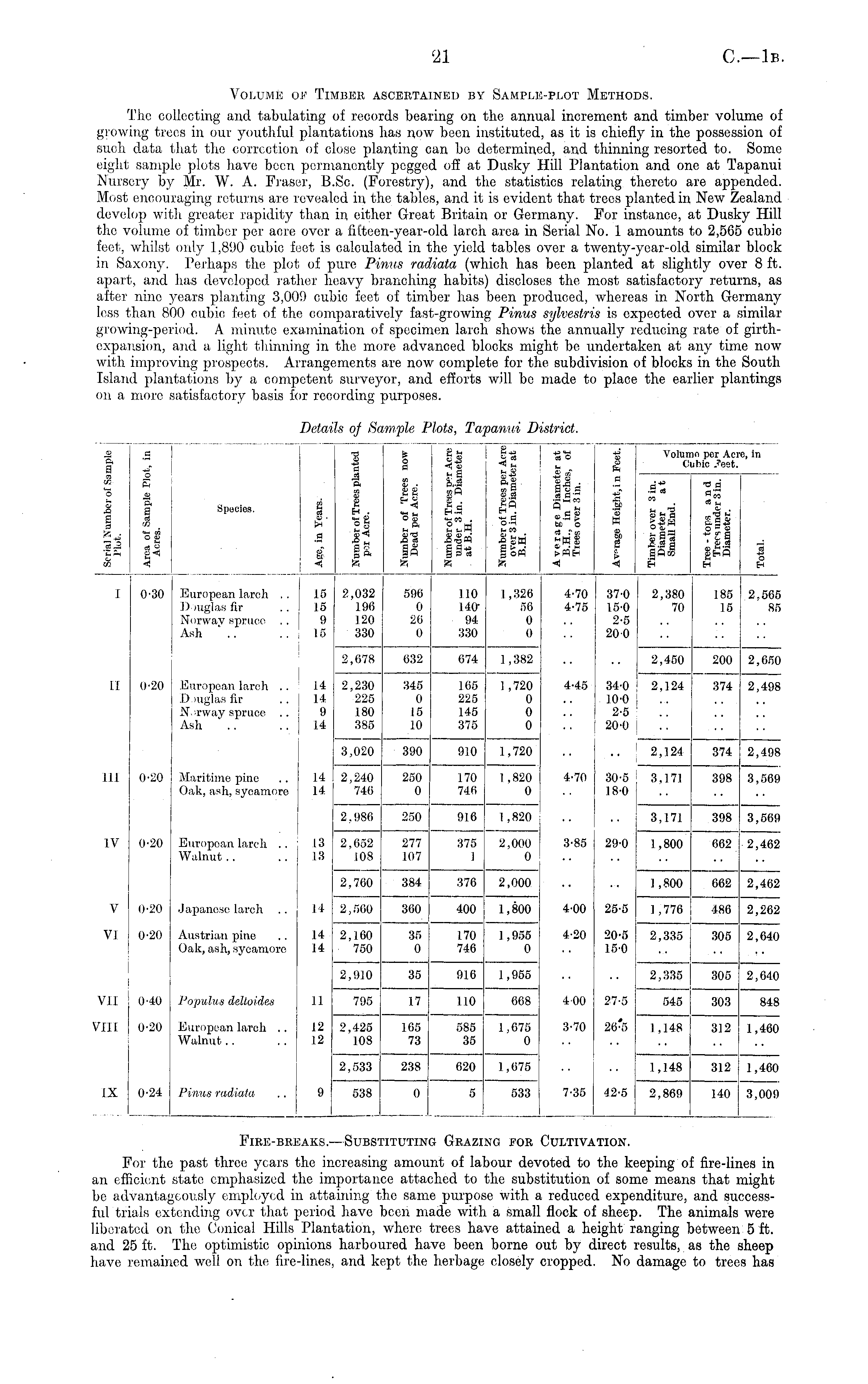 Volume of Timber ascertained by Sample-plot Methods. The collecting and tabulating of records bearing on the annual increment and timber volume of growing trees in our youthful plantations has now been instituted, as it is chiefly in the possession of such data that the correction of close planting can bo determined, and thinning resorted to. Some eight sample plots have been permanently pegged off at Dusky Hill Plantation and one at Tapanui Nursery by Mr. W. A. Fraser, B.Sc. (Forestry), and the statistics relating thereto are appended. Most encouraging returns are revealed in the tables, and it is evident, that trees planted in New Zealand, develop with greater rapidity than in either Great Britain or Germany. For instance, at Dusky Hill the volume of timber per acre over a fifteen-year-old larch area in Serial No. 1 amounts to 2,565 cubic feet, whilst only 1,890 cubic feet is calculated in the yield tables over a twenty-year-old similar block in Saxony. Perhaps the plot of pure Pinus radiata (which has been planted at slightly over 8 ft. apart, and has developed rather heavy branching habits) discloses the most satisfactory returns, as after nine years planting 3,009 cubic feet of timber has been produced, whereas in North Germany less than 800 cubic feet of the comparatively fast-growing Pinus sylvestris is expected over a similar growing-period. A minute examination of specimen larch shows the annually reducing rate of girthexpansion, and a light thinning in the more advanced blocks might be undertaken at any time now with improving prospects. Arrangements are now complete for the subdivision of blocks in the South Island plantations by a competent surveyor, and efforts will be made to place the earlier plantings on a more satisfactory basis for recording purposes.