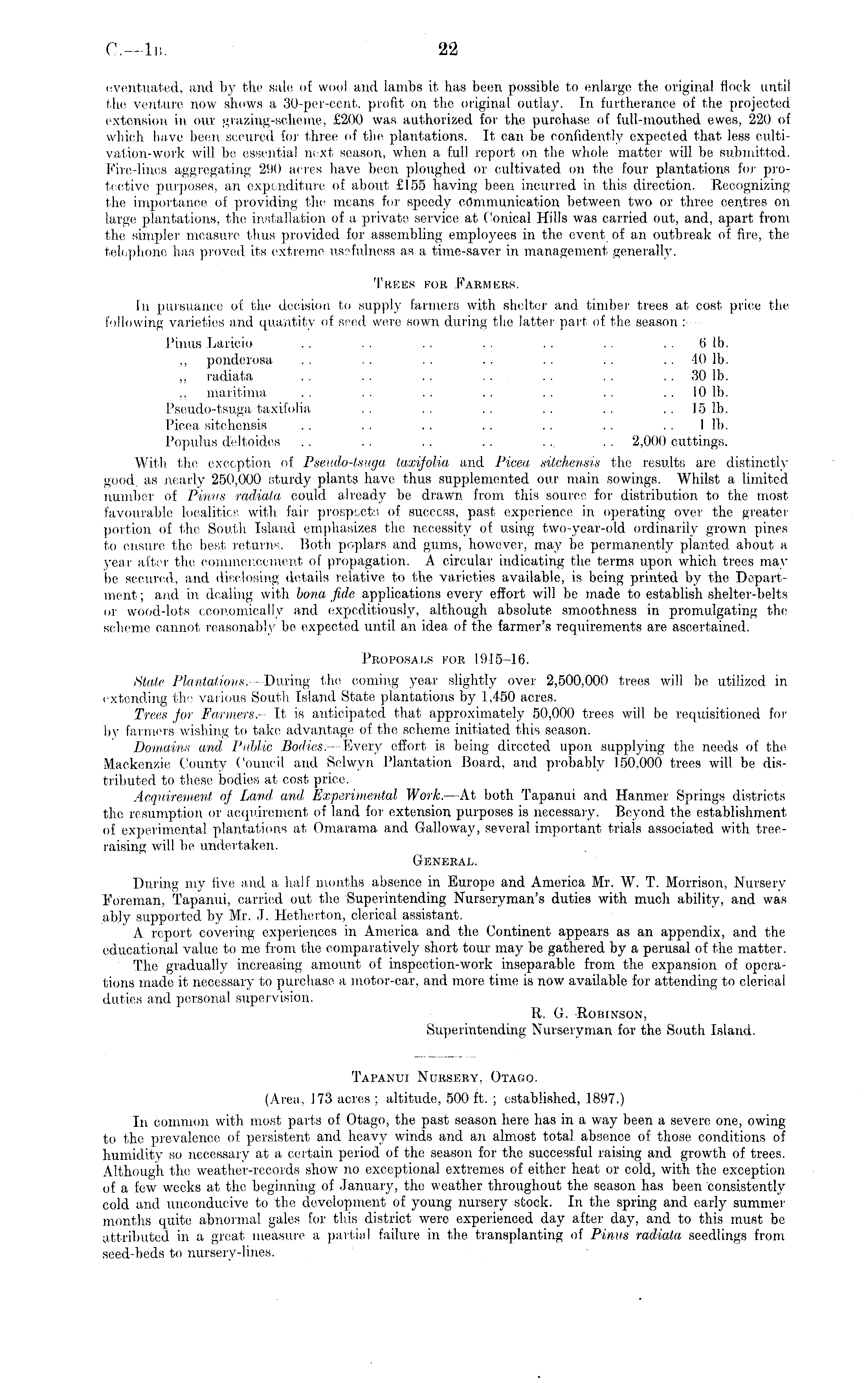 eventuated, and by the sale of wool and lambs it has been possible to enlarge the original flock until the venture now shows a 30-per-cent. profit on the original outlay. In furtherance of the projected extension in our grazing-scheme, £200 was authorized for the purchase of full-mouthed ewes, 220 of which have been, secured for three of the plantations. It, can be confidently expected that less culti-vation-work will be essential next season, when a full report on the whole matter will be submitted. Fire-lines aggregating 290 acres have been ploughed or cultivated on the four plantations for protective purposes, an expenditure of about £155 having been incurred in this direction. Recognizing the importance of providing the means for speedy communication between two or three centres on large plantations, the installation of a private service at Conical Hills was carried out, and, apart from the simpler measure thus provided for assembling employees in the event of an outbreak of fire, the telephone has proved its extreme usefulness as a time-saver in management generally. Trees fob Farmers. in pursuance of the decision to supply farmer;; with shelter and timber trees at cost price the following varieties and quantity of seed were sown during the latter part of the season : Pinus Laricio .. .. .. .. . . ti lb. ~ ponderosa . . . . . . . . . . . . 40 lb. ~ radiata . . .. . . . . . . 30 lb. ~ maritima .. .. .. .. .. . . 10 lb. Pseudo-tsuga taxifolia .. .. .. .. .. .. 15 Ib. Picea sitchensis .. .. .. .. .. .. .. I lb. Populus deltoides .. .. .. .. ... . . 2,000 cuttings. With the exception of Pseudo-tsuga taxifolia and Picea sitchensis the results an; distinctly good as nearly 250,000 sturdy plants have thus supplemented our main sowings. Whilst a limited number of Pinus radiata could already be drawn from this source for distribution to the most favourable localities with fair prospecta of success, past experience in operating over the greater portion of the South Island emphasizes the necessity of using two-year-old ordinarily grown pines to ensure the best, returns. Both poplars and gums, however, may be permanently planted about a year after the commencement of propagation. A circular indicating the terms upon which trees may be secured, and disclosing details relative to the varieties available, is being printed by the Department; and in dealing with bona fide applications every effort will be made to establish shelter-belts oi- wood-lots economically and expeditiously, although absolute smoothness in promulgating the scheme cannot reasonably be expected until an idea of the farmer's requirements are ascertained. Proposals for 1915 Hi. State Plantations. —During the coming year slightly over 2,500,000 tre.es will he utilized in extending the various South Island State plantations by 1,450 acres. Trees for Farmers.-- It is anticipated that approximately 50,000 trees will be requisitioned for by farmers wishing to take advantage of the scheme initiated this season. Domains and Public Bodies. — Every effort is being directed upon supplying the needs of the Mackenzie County Council and Selwyn Plantation Board, and probably 150.000 trees will be distributed to these bodies at cost price. Acquirement of Land, and Experimental Work. —At both Tapanui and Hanmer Springs districts the resumption or acquirement of land for extension purposes is necessary. Beyond the establishment of experimental plantations at Omarama and Galloway, several important trials associated with treeraising will be undertaken. General. During my five and a half months absence in Europe and America Mr. W. T. Morrison, Nursery Foreman, Tapanui, carried out the Superintending Nurseryman's duties with much ability, and was ably supported by Mr. J. Hetherton, clerical assistant. A report covering experiences in America and the Continent appears as an appendix, and the educational value to me from the comparatively short tour may be gathered by a perusal of the matter. The gradually increasing amount of inspection-work inseparable from the expansion of operations made it necessary to purchase, a motor-car, and more time is now available for attending to clerical duties and personal supervision. R. G. Robinson, Superintending Nurseryman for the South Island. Tapanui Nursery. Otago. (Area, 173 acres ; altitude, 500 ft. ; established, 1897.) In common with most parts of Otago, the past season here has in a way been a severe one, owing to the prevalence of persistent and heavy winds and an almost total absence of those conditions of humidity so necessary at a certain period of the season for the successful raising and growth of trees. Although the weather-records show no exceptional extremes of either heat or cold, with the exception of a few weeks at the beginning of January, the weather throughout the season has been consistently cold and uneondueive to the development of young nursery stock. In the spring and early summer months quite abnormal gales for this district were experienced day after day, and to this must be attributed in a great measure a partial failure in the transplanting of Pinus radiata seedlings from seed-beds to nursery-lines.
