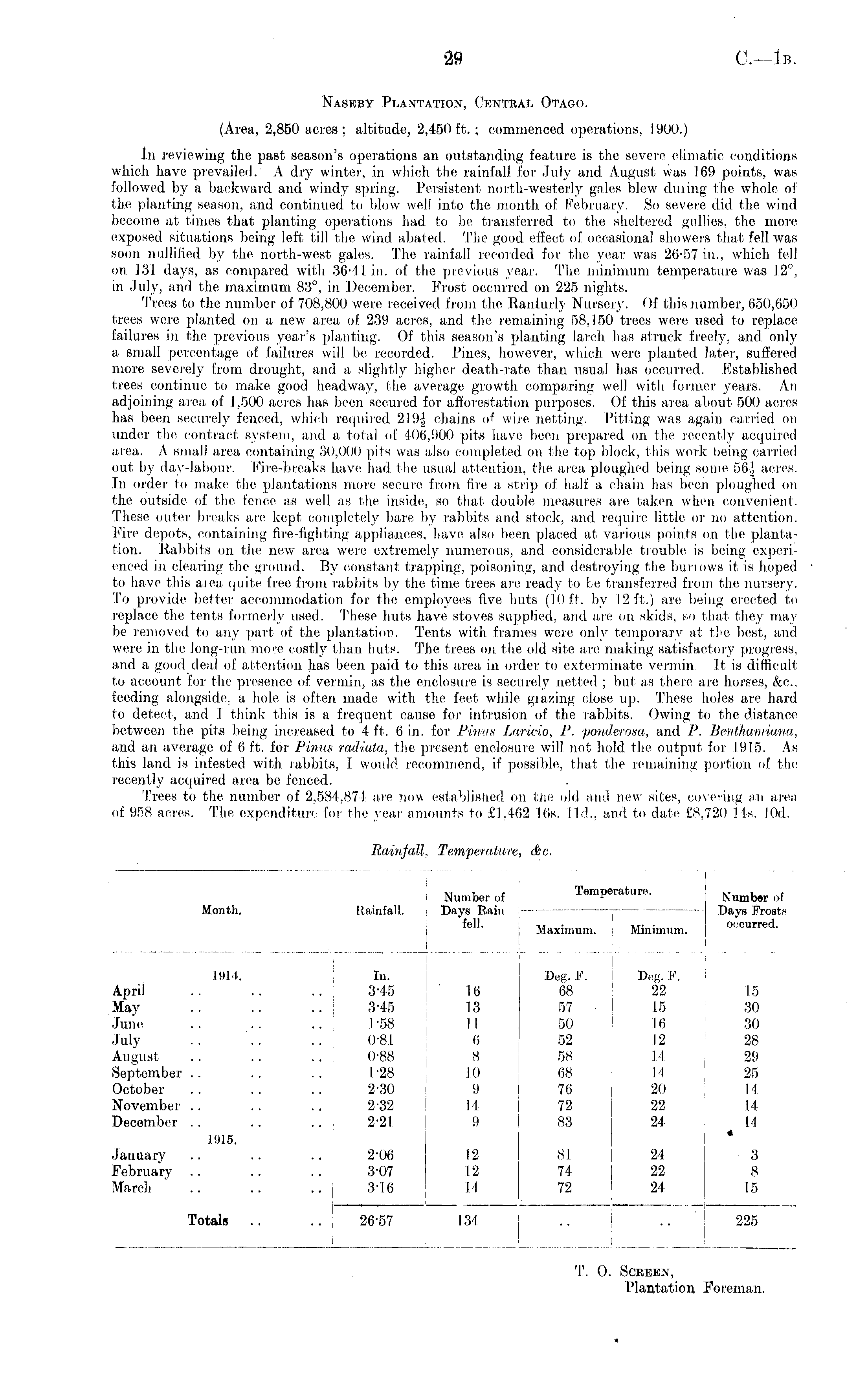 Naseby Plantation, Ckntral Otago. (Area, 2,850 acres; altitude, 2,450 ft.; commenced operations, 1900.) In reviewing the past season's operations an outstanding feature is the severe climatic conditions which have prevailed. A dry winter, in which the rainfall for July and August was 169 points, was followed by a backward and windy spring. Persistent north-westerly gales blew dming the whole of the planting season, and continued to blow well into the month of February. So severe did the wind become at times that planting operations had to be transferred to the sheltered gullies, the more exposed situations being left till the wind abated. The good effect of occasional showers that fell was soon nullified by the north-west gales. The rainfall recorded for the year was 26-57 in., which fell on .131 days, as compared with 36-41 in. of the previous year. The minimum temperature was 12°, in Jul)-, and the maximum 83°, in December. Frost occurred on 225 nights. Trees to the number of 708,800 were received from the Ranfurly Nursery. < )f this number, 650,650 trees were planted on a new area of 239 acres, and the remaining 58,150 trees were used to replace failures in the previous year's planting. Of this season's planting larch has struck freely, and only a small percentage of failures will be recorded. Pines, however, which were planted later, suffered more severely from drought, and a slightly higher death-rate than usual lias occurred. Established trees continue to make good headway, the average, growth comparing well with former years. An adjoining area of 1,500 acres has been secured for afforestation purposes. Of this area about 500 acres has been securely fenced, which required 219 i chains of wire netting. Pitting was again carried on under the contract system, and a total of 406,900 pits have been prepared on the recently acquired area. A small area containing 30,000 pits was also completed on the top block, this work being carried out by day-labour. Fire-breaks have had the usual attention, the area ploughed being some 56i acres. In order to make the plantations more secure from fire a strip of half a chain has been ploughed on the outside of the fence as well as the inside, so that double measures are taken when convenient. These outer breaks are kept, completely bare by rabbits and stock, and require little or no attention. Fire depots, containing fire-fighting appliances, have also been placed at various points on the plantation. Rabbits on the new area were, extremely numerous, and considerable trouble is being ex peri enced in clearing the ground. By constant trapping, poisoning, and destroying the burrows it is hoped to have this area quite free from rabbits by the time trees are ready to lie transferred from the nursery. To provide better accommodation for the employees five huts (10 ft. by 12 ft.) are being erected, to replace the tents formerly used. These huts have stoves supplied, and are on skids, so that they may be removed to any part of the plantation. Tents with frames were only temporary at the best, and were in the, long-run more costly than huts. The trees on the old site are making satisfactory progress, and a good deal of attention has been paid to this area in order to exterminate vermin It is difficult to account for the presence of vermin, as the enclosure is securely netted ; but as there are horses, &c, feeding alongside, a hole, is often made with the feet while glazing close up. These holes are hard to detect, and 1 think this is a frequent cause for intrusion of the rabbits. Owing to the distance between the pits being increased to 4 ft. 6 in. for Pinus Laricio, P. ponderosa, and P. Benthamiana, and an average of 6 ft. for Pinus radiata, the present enclosure will not hold the output for 1915. As this land is infested with rabbits, I would recommend, if possible, that the remaining portion of the recently acquired area be fenced. Trees to the number of 2,534,871 are now established on the old and new sites, covering an area of 958 acres. The expenditure for the year amounts to £1.462 16s. lid., and to date £8,720 Ms. lOd.