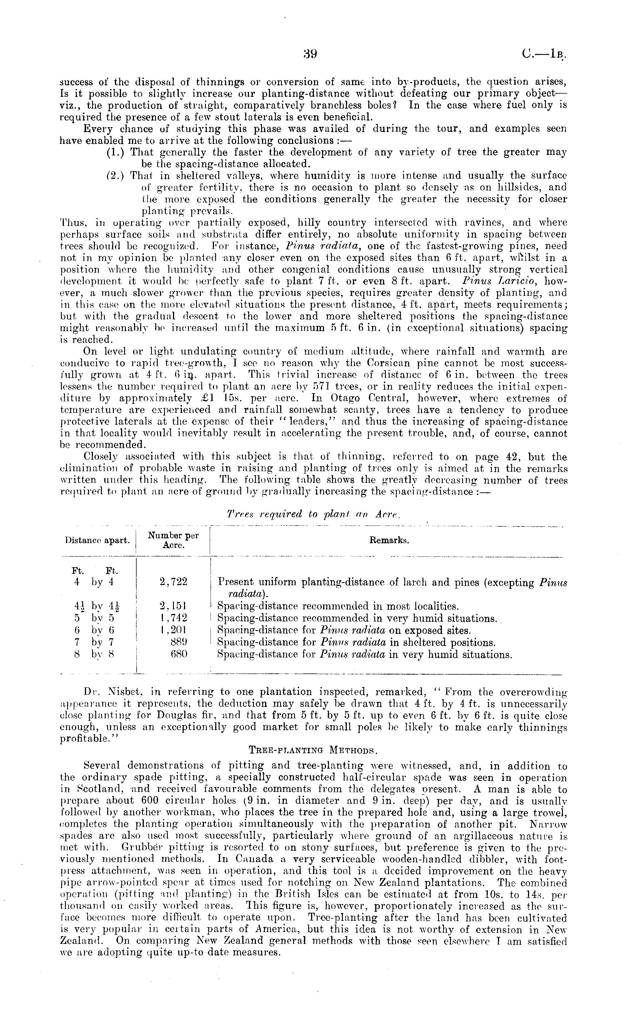 success of the disposal of thinnings or conversion of same into by-products, the question arises, Is it possible to slightly increase our planting-distance without defeating our primary object— viz., the production of straight, comparatively branchless boles? In the case where fuel only is required the presence of a few stout laterals is even beneficial. Every chance of studying this phase was availed of during the tour, and examples seen have enabled me to arrive at the following conclusions : — (1.) That generally the faster the development of any variety of tree the greater may be the spacing-distance allocated. (2.) That in sheltered valleys, where humidity is more intense and usually the surface of greater fertility, there is no occasion to plant, so densely as on hillsides, and the more exposed the conditions generally the greater the necessity for closer planting prevails. Thus, in operating over partially exposed, hilly country intersected with ravines, and where perhaps surface soils and substrata differ entirely, no absolute uniformity in spacing between trees should be recognized. For Instance, Pinus radiata, one of the fastest-growing pines, need not in my opinion be planted any closer even on the exposed sites than 6 ft. apart, wftilst in a position where the humidity and other congenial conditions cause unusually strong vertical development it would be perfectly safe to plant 7 ft. or even 8 ft. apart. Pinus Laricio, however, a much slower grower than the previous species, requires greater density of planting, and in this ease on the more elevated situations the present distance, 4 ft. apart, meets requirements; but with the gradual descent to the lower and more sheltered positions the spacing-distance might reasonably be increased until the maximum 5 ft. 6 in. (in exceptional situations) spacing is reached. On level or light, undulating country of medium altitude, where rainfall and warmth are conducive to rapid tree-growth, I see no reason why the Corsican pine cannot be most successfully grown at 4 ft. 6 iij. apart. This trivial increase of distance of 6 in. between the trees lessens the number required to plant an acre by 571 trees, or in reality reduces the initial expenditure by approximately £1 15s. per acre. In Otago Central, however, where extremes of temperature are experienced and rainfall somewhat scanty, trees have a tendency to produce protective laterals at the expense of their "leaders," and thus the increasing of spacing-distance in that locality would inevitably result in accelerating the present trouble, and, of course, cannot, be recommended. Closely associated with this subject is that of thinning, referred to on page 42, but the elimination of probable waste in raising and planting of trees only is aimed at in the remarks written under this heading. The following table shows the greatly decreasing number of trees required to plant an acre of ground by gradually increasing the spacing-distance :—