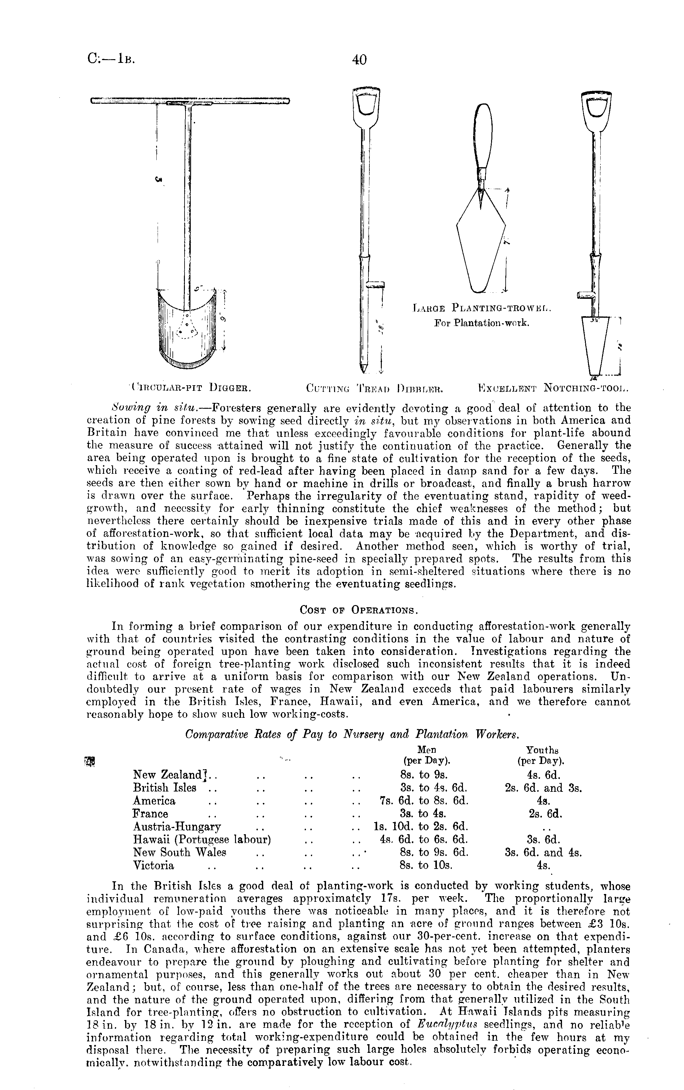 Sowing in situ. —Foresters generally are evidently devoting a good deal of attention to the creation of pine forests by sowing seed directly in situ, but my observations in both America and Britain have convinced me that unless exceedingly favourable conditions for plant-life abound the measure of success attained will not justify the continuation of the practice. Generally the area being operated upon is brought to a fine state of cultivation for the reception of the seeds, which receive a coating of red-lead after having been placed in damp sand for a few days. The seeds are then either sown by hand or machine in drills or broadcast, and finally a brush harrow is drawn over the surface. Perhaps the irregularity of the eventuating stand, rapidity of weedgrowth, and necessity for early thinning constitute the chief weaknesses of the method; but nevertheless there certainly should be inexpensive trials made of this and in every other phase of afforestation-work, so that sufficient local data may be acquired by the Department, and distribution of knowledge so gained if desired. Another method seen, which is worthy of trial, was sowing of an easy-germinating pine-seed in specially prepared spots. The results from this idea were sufficiently good to merit its adoption in semi-sheltered situations where there is no likelihood of rank vegetation smothering the eventuating seedlings. Cost of Operations. In forming a brief comparison of our expenditure in conducting afforestation-work generally with that of countries visited the contrasting conditions in the value of labour and nature of ground being operated upon have been taken into consideration. Investigations regarding the actual cost of foreign tree-planting work disclosed such inconsistent results that it is indeed difficult to arrive at a uniform basis for comparison with our New Zealand operations. Undoubtedly our present rate of wages in New Zealand exceeds that paid labourers similarly employed in the British Isles, France, Hawaii, and even America, and we therefore cannot reasonably hope to show such low working-costs. Comparative Rates of Pay to Nursery and Plantation Workers. Men Youths !$ "- (per Day). (per Day). New Zealand].. .. .. .. Bs. to 9s. 4s. 6d. British Isles .. .. .. .. 3s. to 4s. 6d. 2s. 6d. and 3s. America .. .. .. .. 7s. 6d. to Bs. 6d. 4s. France .. .. .. .. 3s. to 4s. 2s. 6d. Austria-Hungary .. .. .. Is. lOd. to 2s. 6d. Hawaii (Portugese labour) . . .. 4s. 6d. to 6s. 6d. 3s. 6d. New South Wales .. .. .. • Bs. to 9s. 6d. 3s. 6d. and 4s. Victoria .. .. .. .. Bs. to 10s. 4s. In the British Isles a good deal of planting-work is conducted by working students, whose individual remuneration averages approximately I7s. per week. The proportionally large employment of low-paid youths there was noticeable in many places, and it is therefore not surprising that the cost of tree raising and planting an acre of ground ranges between £3 10s. and £6 10s. according to surface conditions, against our 30-per-cent. increase on that expenditure. In Canada, where afforestation on an extensive scale has not yet been attempted, planters endeavour to prepare the ground by ploughing and cultivating before planting for shelter and ornamental purposes, and this generally works out, about 30 per cent, cheaper than in New Zealand; but, of course, less than one-half of the trees are necessary to obtain the desired results, and the nature of the ground operated upon, differing from that jrenernlly utilized in the South Island for tree-planting, offers no obstruction to cultivation. At Hawaii Islands pits measuring 18 in. by 18 in. by 12 in. are made for the reception of Eucalyptus seedlings, and no reliab'e information regarding total working-expenditure could be obtained in the few hours at my disposal there. The necessity of preparing such large holes absolutely forbids operating economically, notwithstanding the comparatively low labour cost.