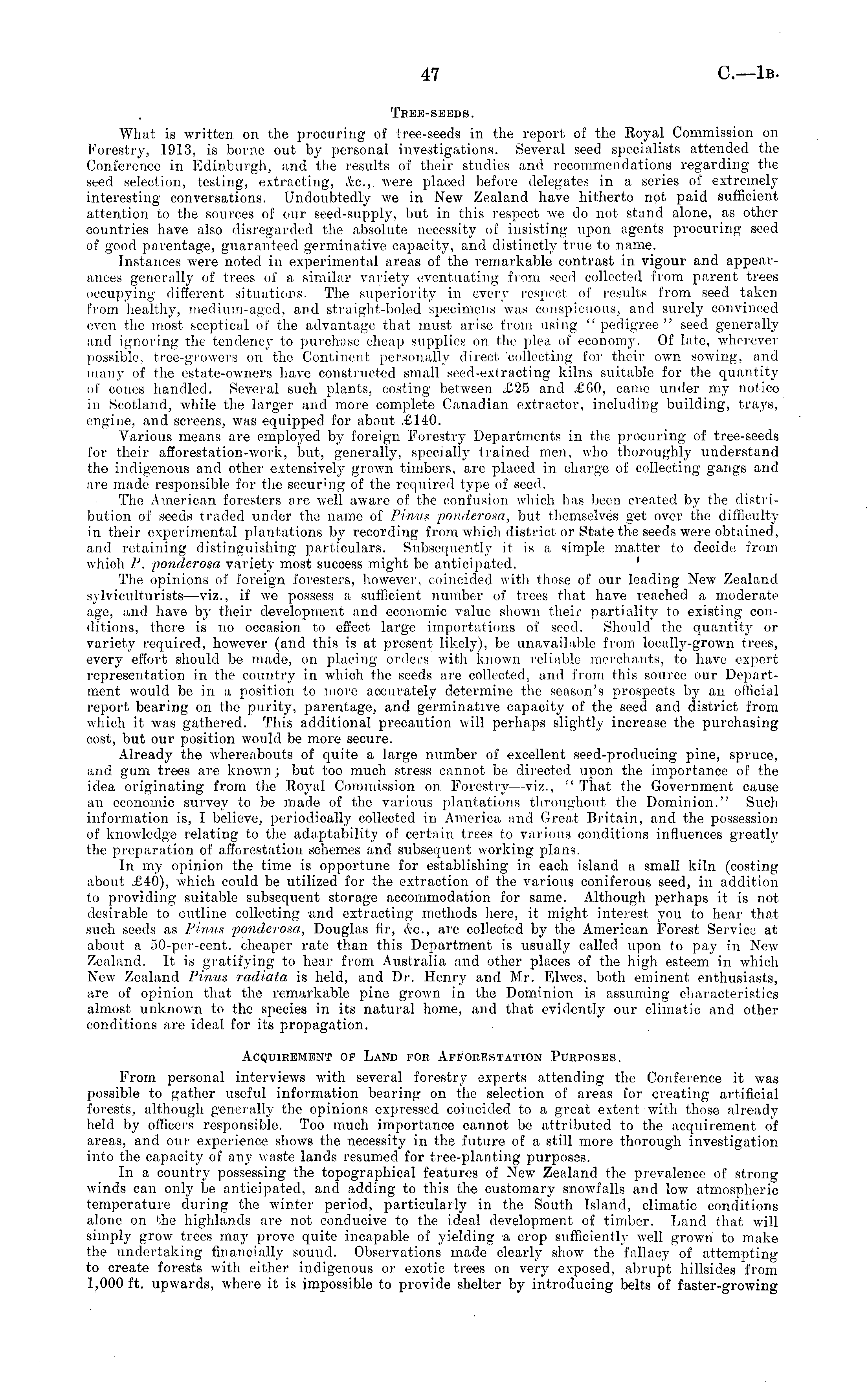 Tree-seeds. What is written on the procuring of tree-seeds in the report of the Royal Commission on Forestry, 1913, is borne out by personal investigations. Several seed specialists attended the Conference in Edinburgh, and the results of their studies and recommendations regarding the seed selection, testing, extracting, ,tc.,. were placed before delegates in a series of extremely interesting conversations. Undoubtedly we in New Zealand have hitherto not paid sufficient attention to the sources of our seed-supply, but in this respect we do not stand alone, as other countries have also disregarded the absolute necessity of insisting upon agents procuring seed of good parentage, guaranteed germinative capacity, and distinctly true to name. Instances were noted in experimental areas of the remarkable contrast in vigour and appearances generally of trees of a similar variety eventuating from seed collected from parent trees occupying different situations. The superiority in every respect of results from seed taken from healthy, medium-aged, and straight-boled specimens was conspicuous, and surely convinced even the most sceptical of the advantage that must arise from using " pedigree " seed generally and ignoring the tendency to purchase cheap supplies on the plea of economy. Of late, wherever possible, tree-growers on the Continent personally direct 'collecting for their own sowing, and many of the estate-owners have constructed small seed-extracting kilns suitable for the quantity of cones handled. Several such plants, costing between £25 and £60, came under my notice in Scotland, while the larger and more complete Canadian extractor, including building, trays, engine, and screens, was equipped for about £140. Various means are employed by foreign Forestry Departments in the procuring of tree-seeds for their afforestation-work, but, generally, specially trained men, who thoroughly understand the indigenous and other extensively grown timbers, are placed in charge of collecting gangs and are made responsible for the securing of the required type of seed. The American foresters are well aware of the confusion which has been created by the distribution of seeds traded under the name of Pinus ponderosa, but themselves get over the difficulty in their experimental plantations by recording from which district or State the seeds were obtained, and retaining distinguishing particulars. Subsequently it is a simple matter to decide from which P. ponderosa variety most success might be anticipated. The opinions of foreign foresters, however, coincided with those of our leading New Zealand sylviculturists—viz., if we possess a sufficient number of trees that have reached a moderate age, and have by their development and economic value shown their partiality to existing conditions, there is no occasion to effect large importations of seed. Should the quantity or variety required, however (and this is at present likely), be unavailable from locally-grown trees, every effort should be made, on placing orders with known reliable merchants, to have expert representation in the country in which the .seeds are collected, and from this source our Department would be in a position to more accurately determine the season's prospects by an official report bearing on the purity, parentage, and germinative capacity of the seed and district from which it was gathered. This additional precaution will perhaps slightly increase the purchasing cost, but our position would be more secure. Already the whereabouts of quite a large number of excellent seed-producing pine, spruce, and gum trees are known; but too much stress cannot be directed upon the importance of the idea originating from the Royal Commission on Forestry —viz., " That the Government cause an economic survey to be made of the various plantations throughout the Dominion." Such information is, I believe, periodically collected in America and Great Britain, and the possession of knowledge relating to the adaptability of certain trees to various conditions influences greatly the preparation of afforestation schemes and subsequent working plans. In my opinion the time is opportune for establishing in each island a small kiln (costing about £40), which could be utilized for the extraction of the various coniferous seed, in addition to providing suitable subsequent storage accommodation for same. Although perhaps it is not desirable to outline collecting and extracting methods here, it might interest you to hear- that such seeds as Pinus ponderosa, Douglas fir, &c, are collected by the American Forest Service at about a 50-per-cent. cheaper rate than this Department is usually called upon to pay in New Zealand. It is gratifying to hear from Australia and other places of the high esteem in which New Zealand Pinus radiata is held, and Dr. Henry and Mr. Elwes, both eminent enthusiasts, are of opinion that the remarkable pine grown in the Dominion is assuming characteristics almost unknown to the species in its natural home, and that evidently our climatic and other conditions are ideal for its propagation. Acquirement op Land for Afforestation Purposes. From personal interviews with several forestry experts attending the Conference it was possible to gather useful information bearing on the selection of areas for creating artificial forests, although generally the opinions expressed coincided to a great extent with those already held by officers responsible. Too much importance cannot be attributed to the acquirement of areas, and our experience shows the necessity in the future of a still more thorough investigation into the capacity of any waste lands resumed for tree-planting purposes. In a country possessing the topographical features of New Zealand the prevalence of strong winds can only be anticipated, and adding to this the customary snowfalls and low atmospheric temperature during the winter period, particularly in the South Island, climatic condit
