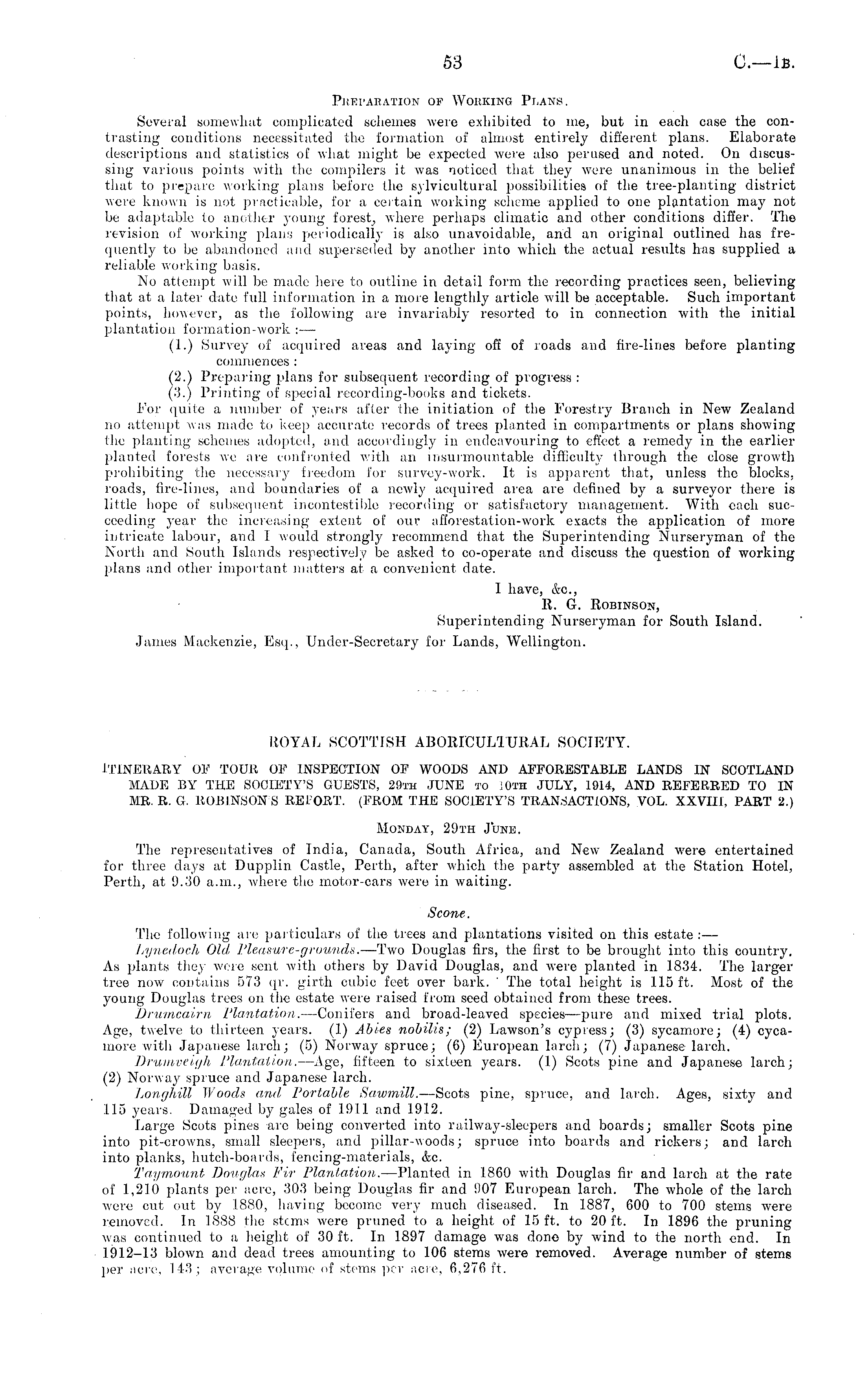 Preparation of Working Plans. Several somewhat complicated schemes were exhibited to me, but in each case the contrasting conditions necessitated the formation of almost entirely different plans. Elaborate descriptions and statistics of what might be expected were also perused and noted. On discussing various points with the compilers it was noticed that they were unanimous in the belief that to prepare working plans before the sylvicultural possibilities of the tree-planting district were known is not practicable, for a certain working scheme applied to one plantation may not be adaptable to another young forest, where perhaps climatic and other conditions differ. The revision of working plans periodically is also unavoidable, and an original outlined has frequently to be abandoned and superseded by another into which the actual results has supplied a reliable working basis. No attempt will be made here to outline in detail form the recording practices seen, believing that at a later date full information in a more lengthly article will be acceptable. Such important points, however, as the following are invariably resorted to in connection with the initial plantation formation-work :— (1.) Survey of acquired areas and laying off of roads and fire-lines before planting commences : (2.) Preparing plans for subsequent recording of progress : (3.) Printing of special recording-bonks and tickets. For quite a number of years after the initiation of the Forestry Branch in New Zealand no attempt was made to keep accurate records of trees planted in compartments or plans showing the planting schemes adopted, and accordingly in endeavouring to effect a remedy in the earlier planted forests we are confronted with an insurmountable difficulty through the close growth prohibiting the necessary freedom for survey-work. It is apparent that, unless the blocks, loads, fire-lines, and boundaries of a newly acquired area are defined by a surveyor there is little hope of subsequent incontestible recording or satisfactory management. With each succeeding year the increasing extent of our affovestation-work exacts the application of more intricate labour, and I would strongly recommend that the Superintending Nurseryman of the North and South Islands respectively be asked to co-operate and discuss the question of working plans and other important matters at a convenient date. I have, &c, R. G. Robinson, Superintending Nurseryman for South Island. James Mackenzie, Esq., Under-Secretary for Lands, Wellington. ROYAL SCOTTISH ABORICULTURAL SOCIETY. ITINERARY OF TOUR OF INSPECTION OP WOODS AND APPORESTABLE LANDS IN SCOTLAND MADE BY THE SOCIETY'S GUESTS, 29th JUNE to lOth JULY, 1914, AND REPERRED TO IN MR. R. G. ROBINSONS REPORT. (PROM THE SOCIETY'S TRANSACTIONS, VOL. XXVIII, PART 2.) Monday, 29th June. The representatives of India, Canada, South Africa, and New Zealand were entertained for three days at Dupplin Castle, Perth, after which the partj' assembled at the Station Hotel, Perth, at 9.30 a.m., where the motor-cars were in waiting. Scone. The following are particulars of the trees and plantations visited on this estate :— Lynedoch OM Pleasure-grounds. —Two Douglas firs, the first to be brought into this country. As plants they were sent with others by David Douglas, and were planted in 1834. The larger tree now contains 573 qr. girth cubic feet over bark. ' The total height is 115 ft. Most of the young Douglas trees on the estate were raised from seed obtained from these trees. Drumcairn Plantation. —Conifers and broad-leaved species—pure and mixed trial plots. Age, twelve to thirteen years. (1) Abies nobilis; (2) Lawson's cypress; (3) sycamore; (4) cycamore with Japanese larch; (5) Norway spruce; (6) European larch; (7) Japanese larch. Drumveigh Plantation. —Age, fifteen to sixteen years. (1) Scots pine and Japanese larch; (2) Norway spruce and Japanese larch. Longhill Woods and, Portable Sawmill. —Scots pine, spruce, and larch. Ages, sixty and 115 years. Damaged by gales of 1911 and 1912. Large Scots pines are being converted into railway-sleepers and boards; smaller Scots pine into pit-crowns, small sleepers, and pillar-woods; spruce into boards and rickers; and larch into planks, hutch-boards, fencing-materials, &c. Taymount Douglas Fir Plantation. —Planted in 1860 with Douglas fir and larch at the rate of 1,210 plants per acre, 303 being Douglas fir and 907 European larch. The whole of the larch were cut out by 1880, having become very much diseased. In 1887, 600 to 700 stems were removed. In 1888 the stems were pruned to a height of 15 ft. to 20 ft. In 1896 the pruning was continued to a height of 30 ft. In 1897 damage was done by wind to the north end. In 1912-13 blown and dead trees amounting to 106 stems were removed. Average number of stems per acre, 143; average volume of stems per acre, 6,276 ft.