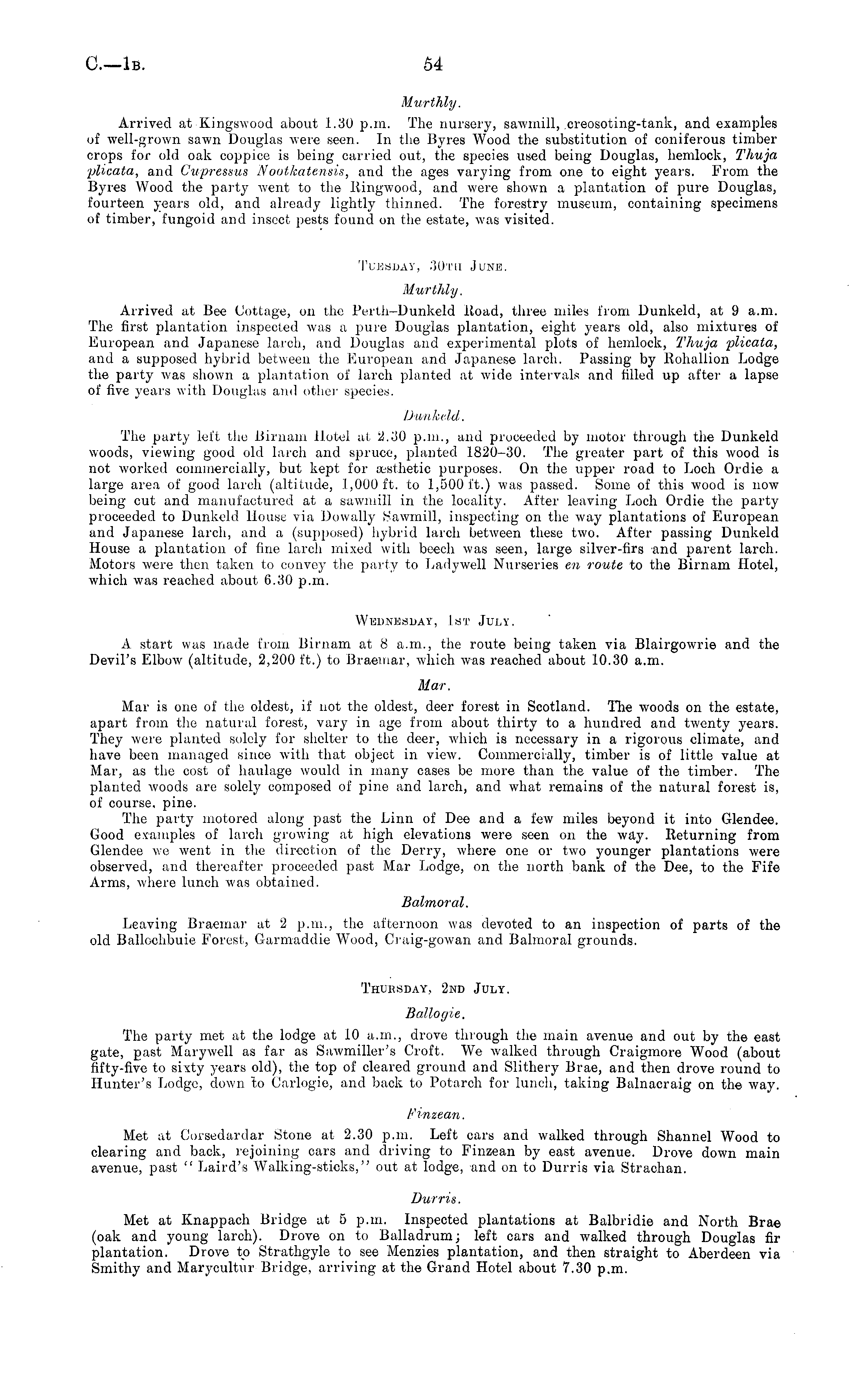 Murthly. Arrived at Kingswood about 1.30 p.m. The nursery, sawmill, creosoting-tank, and examples of well-grown sawn Douglas were seen. In the Byres Wood the substitution of coniferous timber crops for old oak coppice is being carried out, the species used being Douglas, hemlock, Thuja ■plicata, and Cupressus Nootkatensis, and the ages varying from one to eight years. From the Byres Wood the party went to the Ring-wood, and were shown a plantation of pure Douglas, fourteen years old, and already lightly thinned. The forestry museum, containing specimens of timber, fungoid and insect pests found on the estate, was visited. Tuesday, 30th June. Murthly. Arrived at Bee Cottage, on the Perth-Dunkeld Road, three miles from Dunkeld, at 9 a.m. The first plantation inspected was a pure Douglas plantation, eight years old, also mixtures of European and Japanese larch, and Douglas and experimental plots of hemlock, Thuja plicata, and a supposed hybrid between the European and Japanese larch. Passing by Rohallion Lodge the party was shown a plantation of larch planted at wide intervals and filled up after a lapse of five years with Douglas and other species. Dunkeld. The party left the Birnam Hotel at 2.30 p.m., and proceeded by motor through the Dunkeld woods, viewing good old larch and spruce, planted 1820-30. The greater part of this wood is not worketl commercially, but kept for aesthetic purposes. On the upper road to Loch Ordie a large area of good larch (altitude, 1,000 ft. to 1,500 ft.) was passed. Some of this wood is now being cut and manufactured at a sawmill in the locality. After leaving Loch Ordie the party proceeded to Dunkeld House via Dowally Sawmill, inspecting on the way plantations of European and Japanese larch, and a (supposed) hybrid larch between these two. After passing Dunkeld House a plantation of fine larch mixed with beech was seen, large silver-firs and parent larch. Motors were then taken to convey the party to Ladywell Nurseries en route to the Birnam Hotel, which was reached about 6.30 p.m. Wednesday, Ist July. A start was made from Birnam at 8 a.m., the route being taken via Blairgowrie and the Devil's Elbow (altitude, 2,200 ft.) to Braemar, which was reached about 10.30 a.m. Mar. Mar is one of the oldest, if not the oldest, deer forest in Scotland. The woods on the estate, apart from the natural forest, vary in age from about thirty to a hundred and twenty years. They were planted solely for shelter to the deer, which is necessary in a rigorous climate, and have been managed since with that object in view. Commercially, timber is of little value at Mar, as the cost of haulage would in many cases be more than the value of the timber. The planted woods are solely composed of pine and larch, and what remains of the natural forest is, of course, pine. The party motored along past the Linn of Dee and a few miles beyond it into Glendee. Good examples of larch growing at high elevations were seen on the way. Returning from Glendee we went in the direction of the Derry, where one or two younger plantations were observed, and thereafter proceeded past Mar Lodge, on the north bank of the Dee, to the Fife Arms, where lunch was obtained. Balmoral. Leaving Braemar at 2 p.m., the afternoon was devoted to an inspection of parts of the old Ballochbuie Forest, Garmaddie Wood, Craig-gowan and Balmoral grounds. Thursday, 2nd July. Ballogie. The party met at the lodge at 10 a.m., drove through the main avenue and out by the east gate, past Marywell as far as Sawmiller's Croft. We walked through Craigmore Wood (about fifty-five to sixty years old), the top of cleared ground and Slithery Brae, and then drove round to Hunter's Lodge, down to Carlogie, and back to Pot-arch for lunch, taking Balnacraig on the way. Finzean. Met at Corsedardar Stone at 2.30 p.m. Left cars and walked through Shannel Wood to clearing and back, rejoining cars and driving to Finzean by east avenue. Drove down main avenue, past " Laird's Walking-sticks," out at lodge, and on to Durris via Strachan. Durris. Met at Knappach Bridge at 5 p.m. Inspected plantations at Balbridie and North Brae (oak and young larch). Drove on to Balladrum; left cars and walked through Douglas fir plantation. Drove to Strathgyle to see Menzies plantation, and then straight to Aberdeen via Smithy and Marycultur Bridge, arriving at the Grand Hotel about 7.30 p.m.