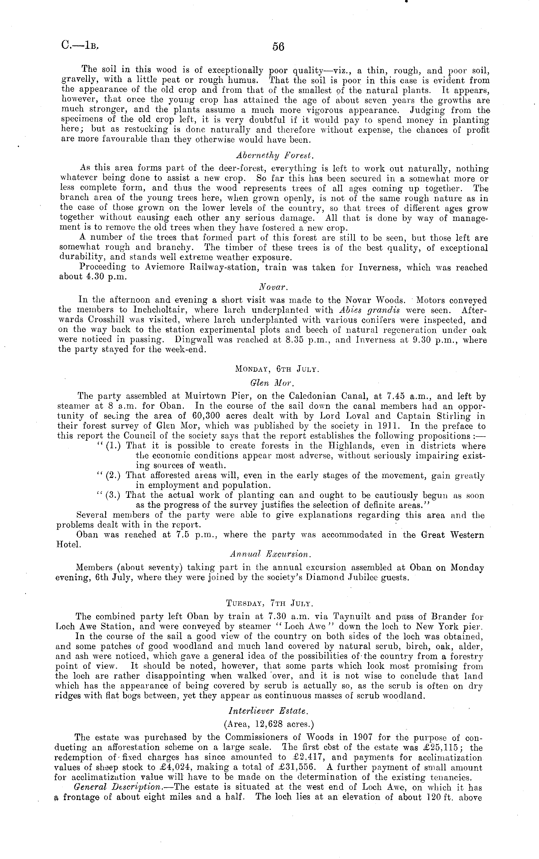 The soil in this wood is of exceptionally poor quality—viz., a thin, rough, and poor soil, gravelly, with a little peat or rough humus. That the soil is poor in this case is evident from the appearance of the old crop and from that of the smallest of the natural plants. It appears, however, that once the young crop has attained the age of about seven years the growths are much stronger, and the plants assume a much more vigorous appearance. Judging from, the specimens of the old crop left, it is very doubtful if it would pay to spend money in planting here; but as restocking is done naturally and therefore without expense, the chances of profit are more favourable than they otherwise would have been. Abernethy Forest. As this area forms part of the deer-forest, everything is left to work out naturally, nothingwhatever being done to assist a new crop. So far this has been secured in a somewhat more or less complete form, and thus the wood represents trees of all ages coming up together. The branch area of the young trees here, when grown openly, is not of the same rough nature as in the case of those grown on the lower levels of the country, so that trees of different ages grow together without causing each other any serious damage. All that is done by way of management is to remove the old trees when they have fostered a new crop. A number of the trees that formed part of this forest are still to be seen, but those left are somewhat rough and branchy. The timber of these trees is of the best quality, of exceptional durability, and stands well extreme weather exposure. Proceeding to Aviemore Railway-station, train was taken for Inverness, which was reached about 4.30 p.m. No var. In the afternoon and evening a short visit was made to the Novar Woods. Motors conveyed the members to Inchcholtair, where larch under-planted with Abies grandis were seen. Afterwards Crosshill was visited, where larch underplanted with various conifers were inspected, and on the way back to the station experimental plots and beech of natural regeneration under oak were noticed in passing. Dingwall was reached at 8.35 p.m., and Inverness at 9.30 p.m., where the party stayed for the week-end. Monday, 6th July. Glen Mor. The party assembled at Muirtown Pier, on the Caledonian Canal, at 7.45 a.m., and left by steamer at 8 a.m. for Oban. In the course of the sail down the canal members had an opportunity of seeing the area of 60,300 acres dealt with by Lord Loyal and Captain Stirling in their forest survejr of Glen Mor, which was published by the society in 1911. In the preface to this report the Council of the society says that the report establishes the following propositions : — " (1.) That it is possible to create forests in the Highlands, even in districts where the economic conditions appear most adverse, without seriously impairing existing sources of weath. " (2.) That afforested areas will, even in the early stages of the movement, gain greatly in employment and population. " (3.) That the actual work of planting can and ought to be cautiously begun as soon as the progress of the survey justifies the selection of definite areas." Several members of the party were able to give explanations regarding this area and the problems dealt with in the report. Oban was reached at 7.5 p.m., where the party was accommodated in the Great Western Hotel. Annual Excursion. Members (about seventy) taking part in the annual excursion assembled at Oban on Monday evening, 6th July, where they were joined by the society's Diamond Jubilee guests. Tuesday, 7th July. The combined party left Oban by train at 7.30 a.m. via Taynuilt and pass of Brander for Loch Awe Station, and were conveyed by steamer " Loch Awe " down the loch to New York pier. In the course of the sail a good view of the country on both sides of the loch was obtained, and some patches of good woodland and much land covered by natural scrub, birch, oak, alder, and ash were noticed, which gave a general idea of the possibilities of-the country from a forestry point of view. It should be noted, however, that some parts which look most promising from the loch are rather disappointing when walked over, and it is not wise to conclude that land which has the appearance of being covered by scrub is actually so, as the scrub is often on dry ridges with fiat bogs between, yet they appear as continuous masses of scrub woodland. Interliever Estate. (Area, 12,628 acres.) The estate was purchased by the Commissioners of Woods in 1907 for the purpose of conducting an afforestation scheme on a large scale. The first cost of the estate was £25,115; the redemption of-fixed charges has since amounted to £2,417, and payments for acclimatization values of sheep stock to £4,024, making a total of £31,556. A further payment of small amount for acclimatization value will have to be made on the determination of the existing tenancies. General Description. —The estate is situated at the west end of Loch Awe, on which it has a frontage of about eight miles and a half. The loch lies at an elevation of about 120 ft. above