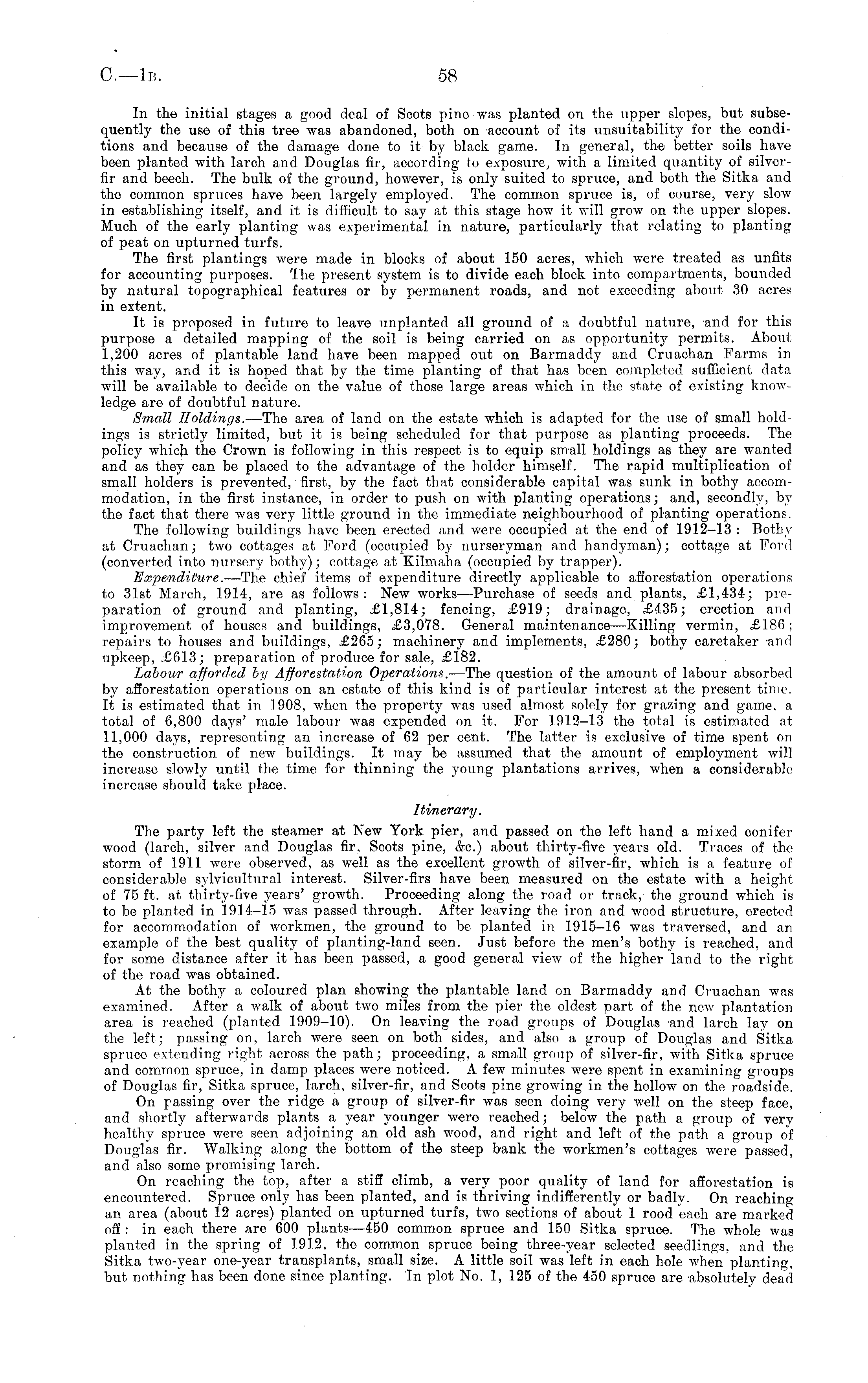 In the initial stages a good deal of Scots pine was planted on the upper slopes, but subsequently the use of this tree was abandoned, both on account of its unsuitability for the conditions and because of the damage done to it by black game. In general, the better soils have been planted with larch and Douglas fir, according to exposure, with a limited quantity of silverfir and beech. The bulk of the ground, however, is only suited to spruce, and both the Sitka and the common spruces have been largely employed. The common spruce is, of course, very slow in establishing itself, and it is difficult to say at this stage how it will grow on the upper slopes. Much of the early planting was experimental in nature, particularly that relating to planting of peat on upturned turfs. The first plantings were made in blocks of about 150 acres, which were treated as unfits for accounting purposes. The present system is to divide each block into compartments, bounded by natural topographical features or by permanent roads, and not exceeding about 30 acres in extent. It is proposed in future to leave unplanted all ground of a doubtful nature, and for this purpose a detailed mapping of the soil is being carried on as opportunity permits. About 1,200 acres of plantable land have been mapped out on Barmaddy and Cruachan Farms in this way, and it is hoped that by the time planting of that has been completed sufficient data will be available to decide on the value of those large areas which in the state of existing knowledge are of doubtful nature. Small Holdings. —The area of land on the estate which is adapted for the use of small holdings is strictly limited, but it is being scheduled for that purpose as planting proceeds. The policy which *he Crown is following in this respect is to equip small holdings as they are wanted and as they can be placed to the advantage of the holder himself. The rapid multiplication of small holders is prevented, first, by the fact that considerable capital was sunk in. bothy accommodation, in the first instance, in order to push on with planting operations; and, secondly, by the fact that there was very little ground in the immediate neighbourhood of planting operations. The following buildings have been erected and were occupied at the end of 1912-13 : Bothy at Cruachan; two cottages at Ford (occupied by nurseryman and handyman); cottage at Ford (converted into nursery bothy) ; cottage at Kilmaha (occupied by trapper). Expenditure. —The chief items of expenditure directly applicable to afforestation operations to 31st March, 1914, are as follows: New works —Purchase of seeds and plants, £1,434; preparation of ground and planting, £1,814; fencing, £919; drainage, £435; erection and improvement, of houses and buildings, £3,078. General maintenance—Killing vermin, £186 ; repairs to houses and buildings, £265; machinery and implements, £280; bothy caretaker -and upkeep, £613; preparation of produce for sale, £182. Labour afforded by Afforestation Operations. —The question of the amount of labour absorbed by afforestation operations on an estate of this kind is of particular interest at the present time. It is estimated that in 1908, when the property was used almost solely for grazing and game, a total of 6,800 days' male labour was expended on it. For 191.2-13 the total is estimated at 11,000 days, representing an increase of 62 per cent. The latter is exclusive of time spent on the construction of new buildings. It may be assumed that the amount of employment will increase slowly until the time for thinning the young plantations arrives, when a considerable increase should take place. Itinerary. The party left the steamer at New York pier, and passed on the left hand a mixed conifer wood (larch, silver and Douglas fir, Scots pine, &c.) about thirty-five years old. Traces of the storm of 1911 were observed, as well as the excellent growth of silver-fir, which is a feature of considerable sylvicultural interest. Silver-firs have been measured on the estate with a height of 75 ft. at thirty-five years' growth. Proceeding along the road or track, the ground which is to be planted in 1914-15 was passed through. After leaving the iron and wood structure, erected for accommodation of workmen, the ground to be planted in 1915-16 was traversed, and an example of the best quality of planting-land seen. Just before the men's bothy is reached, and for some distance after it has been passed, a good general view of the higher land to the right of the road was obtained. At the bothy a, coloured plan showing the plantable land on Barmaddy and Cruachan was examined. After a walk of about two miles from the pier the, oldest part of the new plantation area is reached (planted 1909-10). On leaving the road groups of Douglas -and larch lay on the left; passing on, larch were seen on both sides, and also a group of Douglas and Sitka spruce extending right across the path; proceeding, a small group of silver-fir, with Sitka spruce and common spruce, in damp places were noticed. A few minutes were spent in examining groups of Douglas fir, Sitka spruce, larch, silver-fir, and Scots pine growing in the hollow on the roadside. On passing over the ridge a group of silver-fir was seen doing very well on the steep face, and shortly afterwards plants a year younger were reached; below the path a group of very healthy spruce were seen adjoining an old ash wood, and right and left of the path a group of Douglas fir. Walking along the bottom of the steep bank the workmen's cottages were passed, and also some promising larch. On reaching the top, after a stiff climb, a very poor quality of land for afforestation is encountered. Spruce only has been planted, and is thriving indifferently or badly. On reaching an area (about 12 acres) planted on upturned turfs, two sections of about 1 rood each are marked off :in each there are 600 plants—4so common spruce and 150 Sitka spruce. The whole w