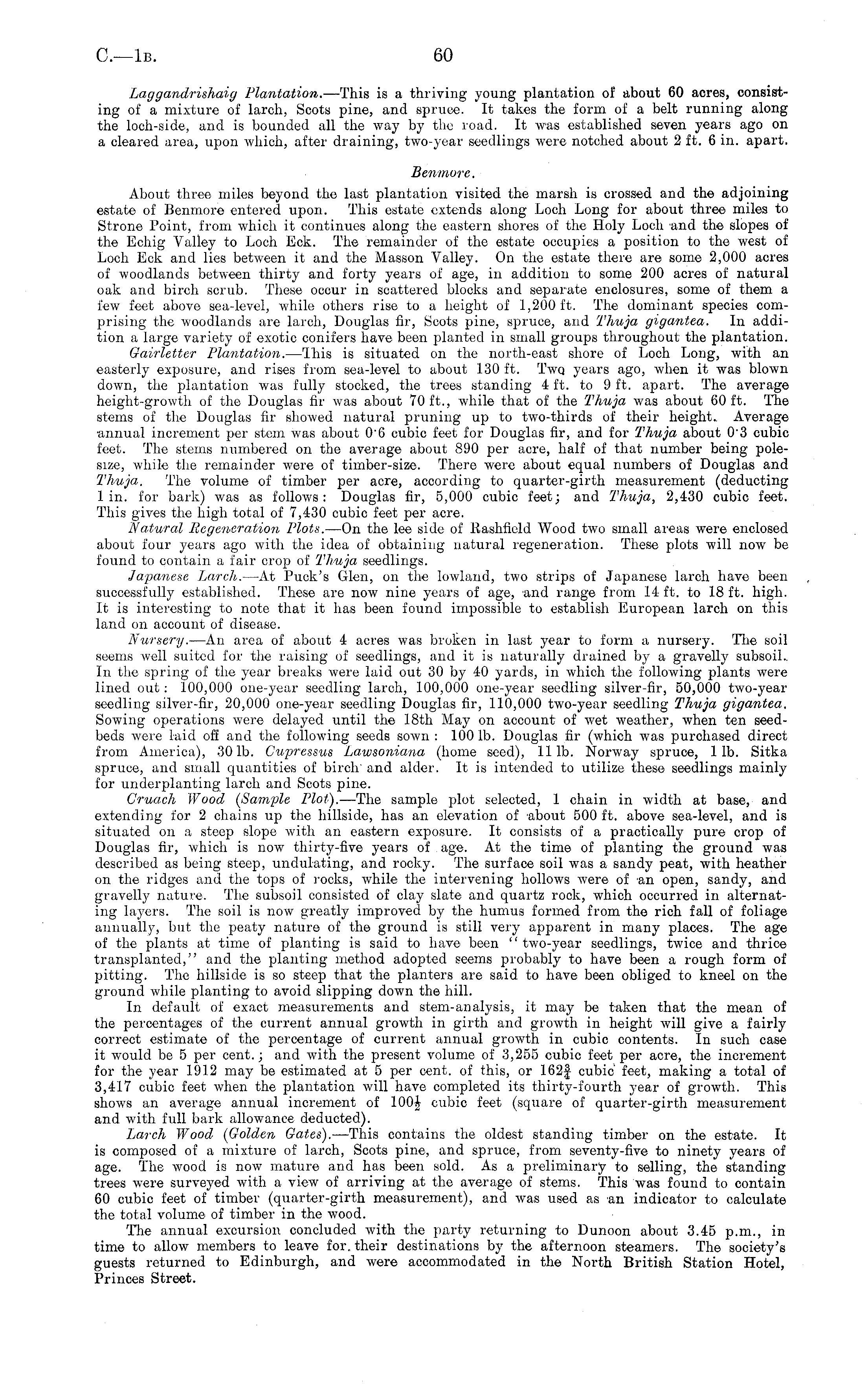 Laggandrishaig Plantation. —This is a thriving young plantation of about 60 acres, consisting of a mixture of larch, Scots pine, and spruce. It takes the form of a belt running along the loch-side, and is bounded all the way by the road. It was established seven years ago on a cleared area, upon which, after draining, two-year seedlings were notched about 2 ft. 6 in. apart. Benmore. About three miles beyond the last plantation visited the marsh is crossed and the adjoining estate of Benmore entered upon. This estate extends along Loch Long for about three miles to Strone Point, from which it continues along the eastern shores of the Holy Loch and the slopes of the Echig Valley to Loch Eck. The remainder of the estate occupies a position to the west of Loch Eck and lies between it and the Masson Valley. On the estate there are some 2,000 acres of woodlands between thirty and forty years of age, in addition to some 200 acres of natural oak and birch scrub. These occur in scattered blocks and separate enclosures, some of them a few feet above sea-level, while others rise to a height of 1,200 ft. The dominant species comprising the woodlands are larch, Douglas fir, Scots pine, spruce, and Thuja gigantea. In addition a large variety of exotic conifers have been planted in small groups throughout the plantation. Gairletter Plantation. —This is situated on the north-east shore of Loch Long, with an easterly exposure, and rises from sea-level to about 130 ft. Two. years ago, when it was blown down, the plantation was fully stocked, the trees standing 4 ft. to 9 ft. apart. The average height-growth of the Douglas fir was about 70 ft., while that of the Thuja was about 60 ft. The stems of the Douglas fir showed natural pruning up to two-thirds of their height.. Average •annual increment per stem was about o'6 cubic feet for Douglas fir, and for Thuja about o'3 cubic feet. The stems numbered on the average about 890 per acre, half of that number being polesize, while the remainder were of timber-size. There were about equal numbers of Douglas and Thuja. The volume of timber per acre, according to quarter-girth measurement (deducting 1 in. for bark) was as follows: Douglas fir, 5,000 cubic feet; and Thuja, 2,430 cubic feet. This gives the high total of 7,430 cubic feet per acre. Natural Regeneration Plots. —On the lee side of Rashfield Wood two small areas were enclosed about four years ago with the idea of obtaining natural regeneration. These plots will now be found to contain a fair cro\) of Thuja seedlings. Japanese Larch. —At Puck's Glen, on the lowland, two strips of Japanese larch have been successfully established. These are now nine years of age, and range from 14 ft. to 18 ft. high. It is interesting to note that it has been found impossible to establish European larch on this land on account of disease. Nursery. —An area of about 4 acres was broken in last year to form a nursery. The soil seems well suited for the raising of seedlings, and it is naturally drained by a gravelly subsoil.. In the spring of the year breaks were laid out 30 by 40 yards, in which the following plants were lined out: 100,000 one-year seedling larch, 100,000 one-year seedling silver-fir, 50,000 two-year seediing silver-fir, 20,000 one-year seedfing Douglas fir, 110,000 two-year seedling Thuja gigantea. Sowing operations were delayed until the 18th May on account of wet weather, when ten seedbeds were laid off and the following seeds sown : 100 lb. Douglas fir (which was purchased direct from America), 301b. Cupressus Lawsoniana (home seed), 111b. Norway spruce, lib. Sitka spruce, and small quantities of birch' and alder. It is intended to utilize these seedlings mainly for underplanting larch and Scots pine. Gruach Wood (Sample Plot). —The sample plot selected, 1 chain in width at base, and extending for 2 chains up the hillside, has an elevation of about 500 ft. above sea-level, and is situated on a steep slope with an eastern exposure. It consists of a practically pure crop of Douglas fir, which is now thirty-five years of age. At the time of planting the ground was described as being steep, undulating, and rocky. The surface soil was a sandy peat, with heather on the ridges and the tops of rocks, while the intervening hollows were of an open, sandy, and gravelly nature. The subsoil consisted of clay slate and quartz rock, which occurred in alternating layers. The soil is now greatly improved by the humus formed from the rich fall of foliage annually, but the peaty nature of the ground is still very apparent in many places. The age of the plants at time of planting is said to have been "two-year seedlings, twice and thrice transplanted," and the planting method adopted seems probably to have been a rough form of pitting. The hillside is so steep that the planters are said to have been obliged to kneel on the ground while planting to avoid slipping down the hill. In default of exact measurements and stem-analysis, it may be taken that the mean of the percentages of the current annual growth in girth and growth in height will give a fairly correct estimate of the percentage of current annual growth in cubic contents. In such case it would be 5 per cent.; and with the present volume of 3,255 cubic feet per acre, the increment for the year 1912 may be estimated at 5 per cent, of this, or 162f cubic feet, making a total of 3,417 cubic feet when the plantation will have completed its thirty-fourth year of growth. This shows an average annual increment of 100J cubic feet (square of quarter-girth measurement and with full bark allowance deducted). Larch Wood (Golden Gates). —This contains the oldest standing timber on the estate. It is composed of a mixture of larch, Scots pine, and spruce, from seventy-five to ninety years of age. The wood is now mature and has been sold. As a preliminary to selling, the standing trees were surveyed with a view of arriving at the average of stems. This was found to con