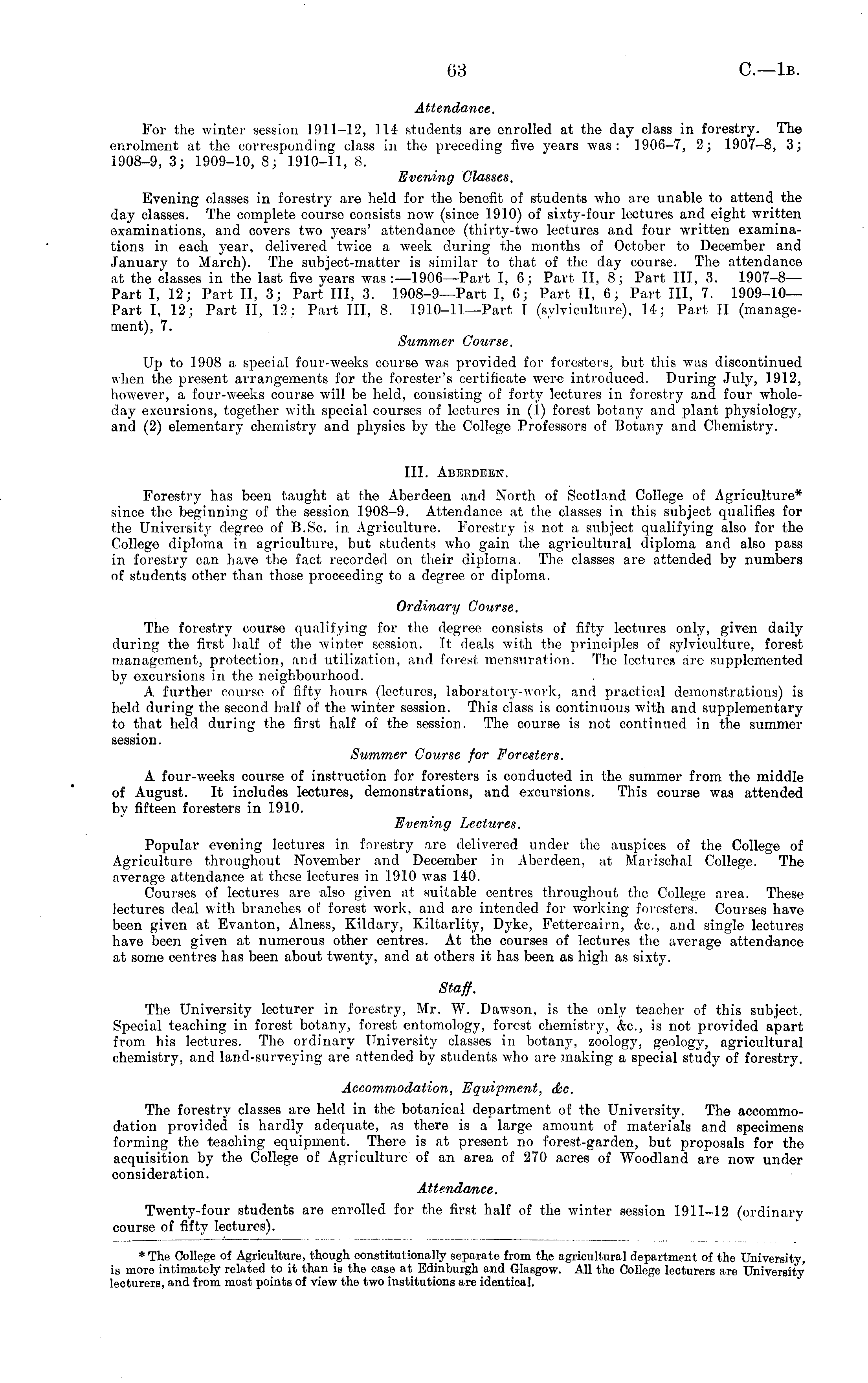 Attendance. For the winter session 1911-12, 114 students are enrolled at the day class in forestry. The enrolment at the corresponding class in the preceding five years was: 1906-7, 2; 1907-8, 3; 1908-9, 3; 1909-10, 8; 1910-11, 8. Evening Classes. Evening classes in forestry are held for the benefit of students who are unable to attend the day classes. The complete course consists now (since 1910) of sixty-four lectures and eight written examinations, and covers two years' attendance (thirty-two lectures and four written examinations in each year, delivered twice a week during the months of October to December and January to March). The subject-matter is similar to that of the day course. The attendance at the classes in the last five years was: —1906 —Part I, 6; Part 11, 8; Part 111, 3. 1907-8— Part I, 12; Part 11, 3; Part 111, 3. 1908-9—Part I, 6; Part 11, 6; Part 111, 7. 1909-10— Part I, 12; Part 11, 12: Part 111, 8. 1910-11—Part, I (sylviculture), 14; Part II (management), 7. Summer Course. Up to 1908 a special four-weeks course was provided for foresters, but this was discontinued when the present arrangements for the forester's certificate were introduced. During July, 1912, however, a four-weeks course will be held, consisting of forty lectures in forestry and four wholeday excursions, together with special courses of lectures in (.1) forest botany and plant physiology, and (2) elementary chemistry and physics by the College Professors of Botany and Chemistry. 111. Aberdeen. Forestry has been taught at the Aberdeen and North of Scotland College of Agriculture* since the beginning of the session 1908-9. Attendance at the classes in this subject qualifies for the University degreo of B.Sc. in Agriculture. Forestry is not a subject qualifying also for the College diploma in agriculture, but students who gain the agricultural diploma and also pass in forestry can have the fact recorded on their diploma. The classes are attended by numbers of students other than those proceeding to a degree, or diploma. Ordinary Course. The forestry course qualifying for the degree consists of fifty lectures only, given daily during the first half of the winter session. It deals with the principles of sylviculture, forest management, protection, and utilization, and forest mensuration. The lectures are supplemented by excursions in the neighbourhood. A further course of fifty hours (lectures, laboratory-work, and practical demonstrations) is held during the second half of tho winter session. This class is continuous with and supplementary to that held during the first half of the session. The course is not continued in the summer session. Summer Course for Foresters. A four-weeks course of instruction for foresters is conducted in the summer from the middle of August. It includes lectures, demonstrations, and excursions. This course was attended by fifteen foresters in 1910. Evening Lectures. Popular evening lectures in forestry are delivered under the auspices of the College of Agriculture throughout November and December in Aberdeen, at Marischal College. The average attendance at these lectures in 1910 was 140. Courses of lectures are also given at suitable centres throughout the College area. These lectures deal with branches of forest work, and are intended for working foresters. Courses have been given at Evanton, Alness, Kildary, Kiltarlity, Dyke, Fettercairn, &c, and single lectures have been given at numerous other centres. At the courses of lectures the average attendance at some centres has been about twenty, and at others it has been as high as sixty. Staff. The University lecturer in forestry, Mr. W. Dawson, is the only teacher of this subject. Special teaching in forest botany, forest entomology, forest chemistry, &c, is not provided apart from his lectures. The ordinary University classes in botany, zoology, geology, agricultural chemistry, and land-surveying are attended by students who are making a special study of forestry. Accommodation, Equipment, &c. The forestry classes are held in the botanical department of the University. The accommodation provided is hardly adequate, as there is a large amount of materials and specimens forming the teaching equipment. There is at present no forest-garden, but proposals for the acquisition by the College of Agriculture of an area of 270 acres of Woodland are now under consideration. Attendance. Twenty-four students are enrolled for the first half of the winter session 1911-12 (ordinary course of fifty lectures).