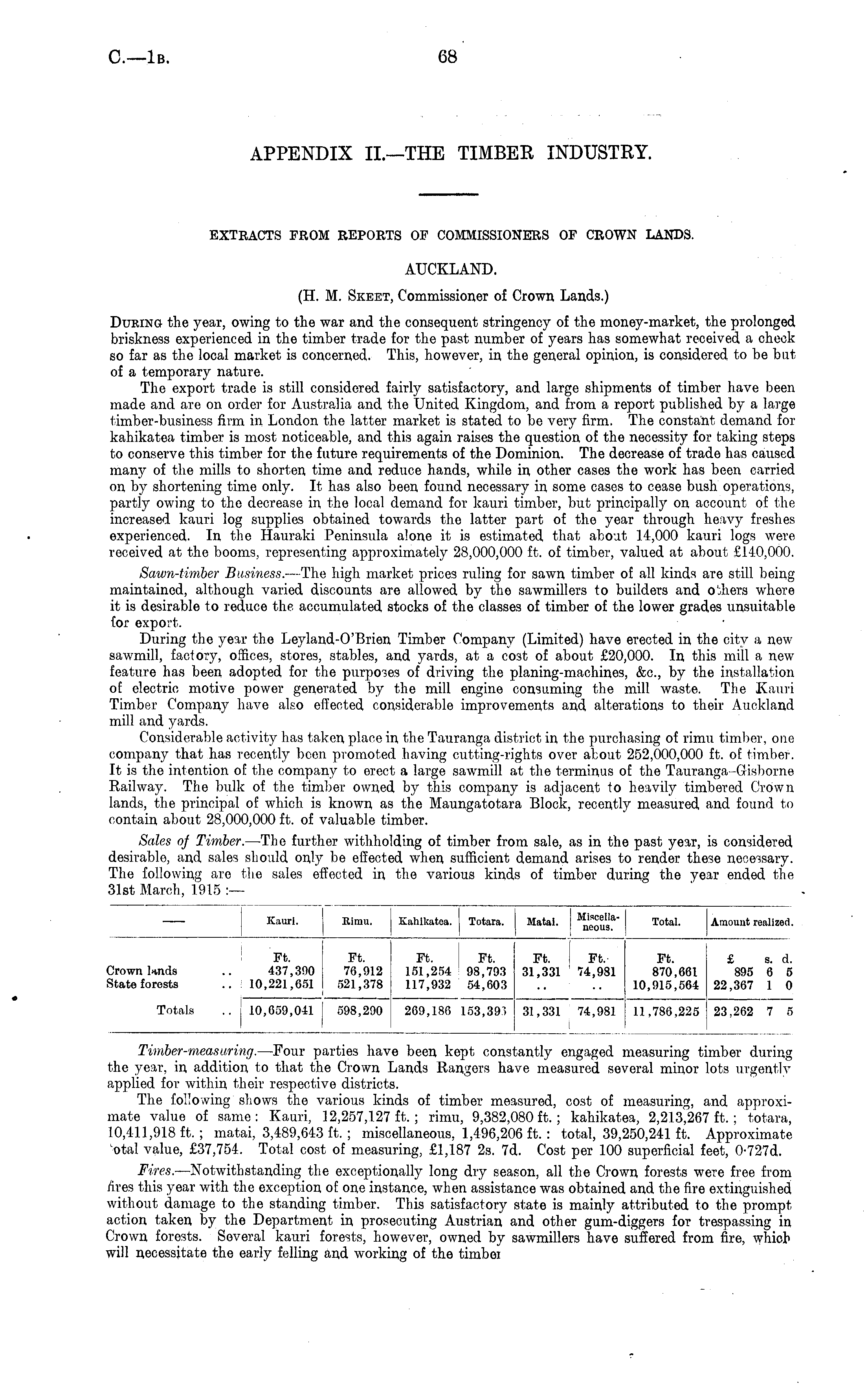 APPENDIX lI.—THE TIMBER INDUSTRY. EXTRACTS FROM REPORTS OF COMMISSIONERS OF CROWN LANDS. AUCKLAND. (H. M. Skeet, Commissioner of Crown Lands.) Dubino the year, owing to the war and the consequent stringency of the money-market, the prolonged briskness experienced in the timber trade for the past number of years has somewhat received a check so far as the local market is concerned. This, however, in the general opinion, is considered to be but of a temporary nature. The export trade is still considered fairly satisfactory, and large shipments of timber have been made and are on order for Australia and the United Kingdom, and from a report published by a large timber-business firm in London the latter market is stated to be very firm. The constant demand for kahikatea timber is most noticeable, and this again raises the question of the necessity for taking steps to conserve this timber for the future requirements of the Dominion. The decrease of trade has caused many of the mills to shorten time and reduce hands, while in other cases the work has been carried on by shortening time only. It has also been found necessary in some cases to cease bush operations, partly owing to the decrease in the local demand for kauri timber, but principally on account of the increased kauri log supplies obtained towards the latter part of the year through heavy freshes experienced. In the Hauraki Peninsula alone it is estimated that about 14,000 kauri logs were received at the booms, representing approximately 28,000,000 ft. of timber, valued at about £.140,000. Sawn-timber Business. —The high market prices ruling for sawn timber of all kinds are still being maintained, although varied discounts are allowed by the sawmillers to builders and others where it is desirable to reduce the accumulated stocks of the classes of timber of the lower grades unsuitable for export. During the year the Leyland-O'Brien Timber Company (Limited) have erected in the city a new sawmill, factory, offices, stores, stables, and yards, at a cost of about £20,000. In this mill a new feature has been adopted for the purposes of driving the planing-machines, &c, by the installation of electric motive power generated by the mill engine consuming the mill waste. The Kauri Timber Company have also effected considerable improvements and alterations to their Auckland mill and yards. Considerable activity has taken place in the Tauranga district in the purchasing of rimu timber, one company that has recently been promoted having cutting-rights over about 252,000,000 ft. of timber. It is the intention of the company to erect a large sawmill at the terminus of the Tauranga -Gisborne Railway. The bulk of the timber owned by this company is adjacent to heavily timbered Crown lands, the principal of which is known as the Maungatotara Block, recently measured and found to contain about 28,000,000 ft. of valuable timber. Sales of Timber. —The further withholding of timber from sale, as in the past year, is considered desirable, and sales should only be effected when sufficient demand arises to render these necessary. The following are the sales effected in the various kinds of timber during the year ended the 31st March, 1915 :—
