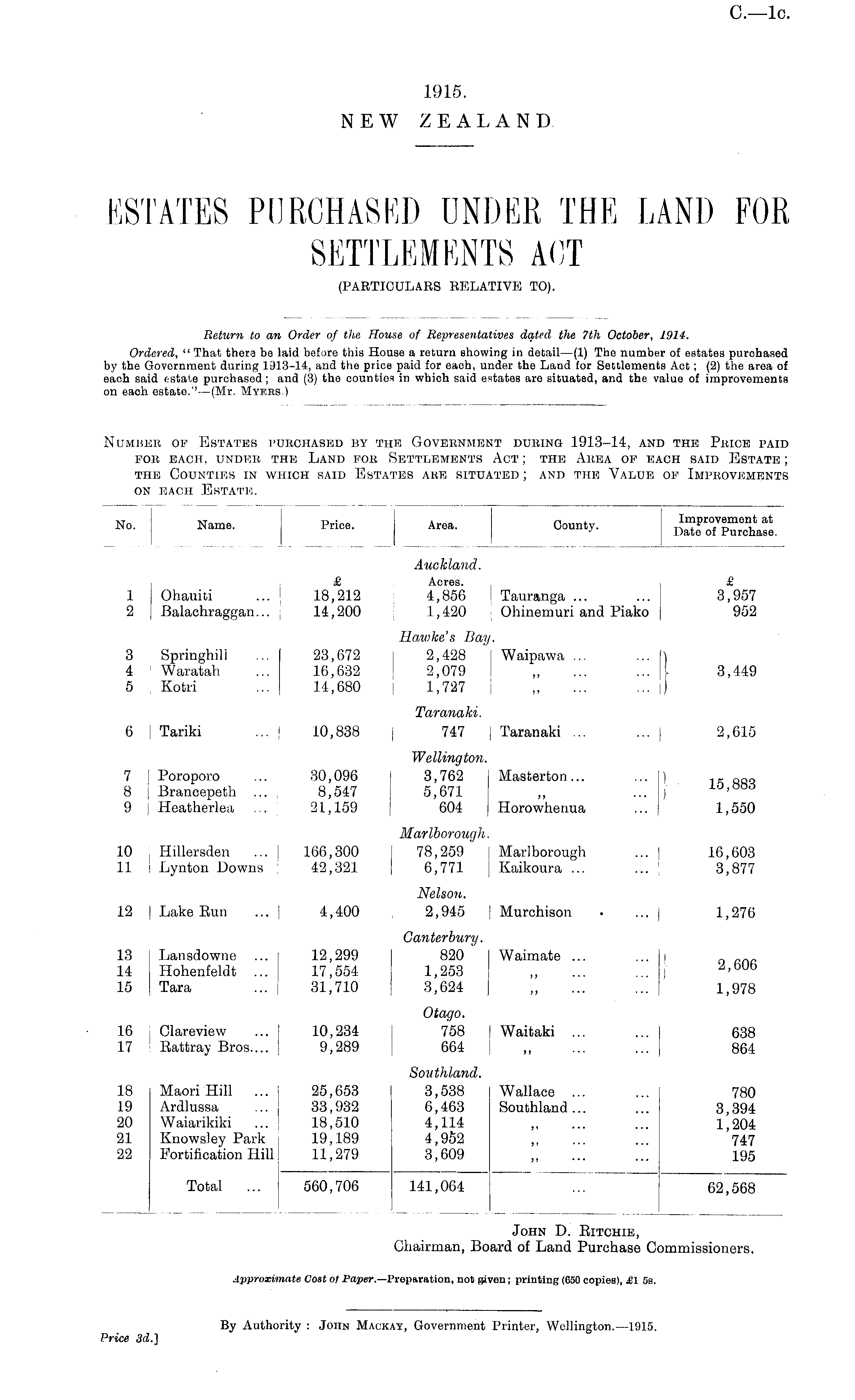 Return to an Order of the House of Representatives dated the 7th October, 1914. Ordered, " That there be laid before this House a return showing in detail—(l) The number of estates purchased by the Government during 1313-14, and the price paid for each, under the Land for Settlements Act; (2) the area of each said estate purchased; and (3) the countios in which said estates are situated, and the value of improvements on eaoh estate.''—(Mr. Myers.)