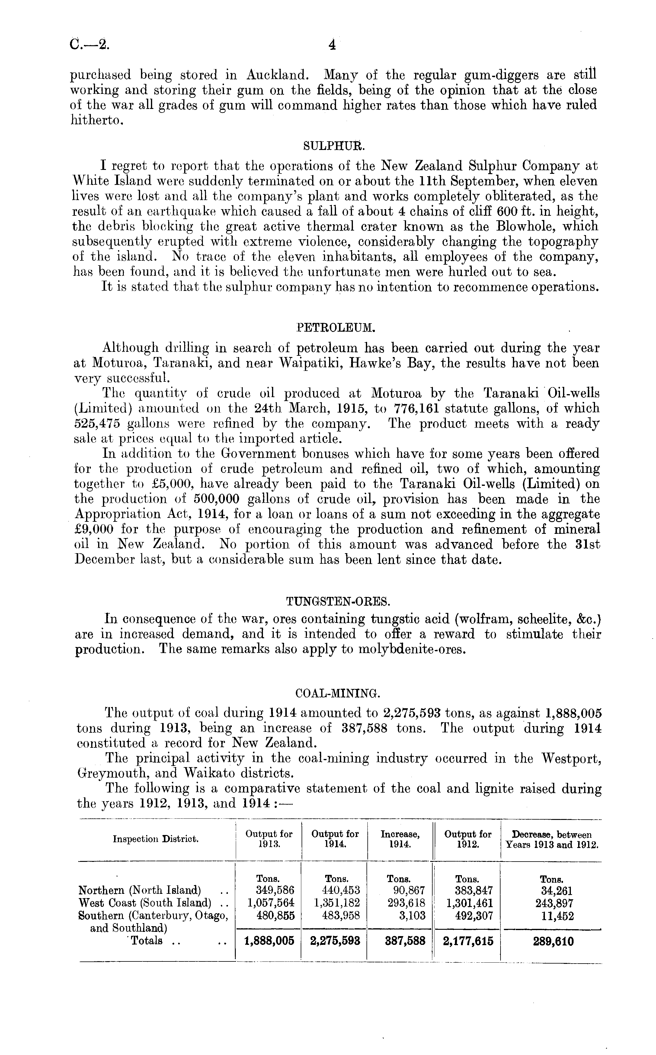 purchased being stored in Auckland. Many of the regular gum-diggers are still working and storing their gum on the fields, being of the opinion that at the close of the war all grades of gum will command higher rates than those which have ruled hitherto. SULPHUR. I regret to report that the operations of the New Zealand Sulphur Company at White Island were suddenly terminated on or about the 11th September, when eleven lives were lost and all the company's plant and works completely obliterated, as the result of an earthquake which caused a fall of about 4 chains of cliff 600 ft. in height, the debris blocking the great active thermal crater known as the Blowhole, which subsequently erupted with extreme violence, considerably changing the topography of the island. No trace of the eleven inhabitants, all employees of the company, has been found, and it is believed the unfortunate men were hurled out to sea. It is stated that the sulphur company has no intention to recommence operations. PETROLEUM. Although drilling in search of petroleum has been carried out during the year at Moturoa, Taranaki, and near Waipatiki, Hawke's Bay, the results have not been very successful. The quantity of crude oil produced at Moturoa by the Taranaki Oil-wells (Limited) amounted on the 24th March, 1915, to 776,161 statute gallons, of which 525,475 gallons were refined by the company. The product meets with a ready sale at prices equal to the imported article. In addition to the Government bonuses which have for some years been offered for the production of crude petroleum and refined oil, two of which, amounting together to £5,000, have already been paid to the Taranaki Oil-wells (Limited) on the production of 500,000 gallons of crude oil, provision has been made in the Appropriation Act, 1914, for a loan or loans of a sum not exceeding in the aggregate £9,000 for the purpose of encouraging the production and refinement of mineral oil in New Zealand. No portion of this amount was advanced before the 31st December last, but a considerable sum has been lent since that date. TUNGSTEN-ORES. In consequence of the war, ores containing tungstic acid (wolfram, scheelite, &c.) are in increased demand, and it is intended to offer a reward to stimulate their production. The same remarks also apply to molybdenite-ores. COAL-MINING. The output of coal during 1914 amounted to 2,275,593 tons, as against 1,888,005 tons during 1913, being an increase of 387,588 tons. The output during 1914 constituted a record for New Zealand. The principal activity in the coal-mining industry occurred in the Westporfc, Greymouth, and Waikato districts. The following is a comparative statement of the coal and lignite raised during the years 1912, 1913, and 1914 :—