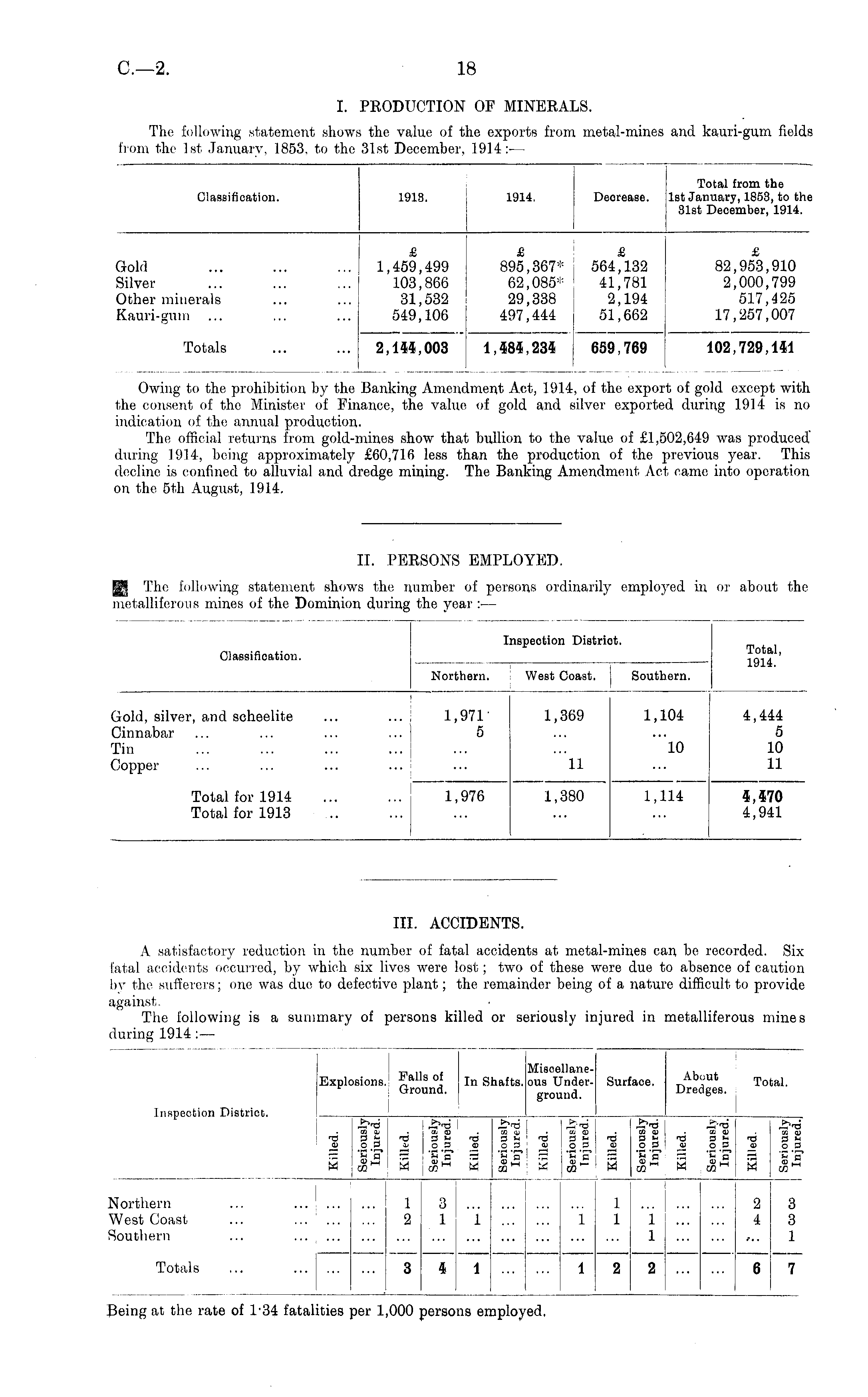 Owing to the prohibition by the Banking Amendment Act, 1914, of the export of gold except with the consent of the Minister of Finance, the value of gold and silver exported during 1914 is no indication of the annual production. The official returns from gold-mines show that bullion to the value of £1,502,649 was produced' during 1914, being approximately £60,716 less than the production of the previous year. This decline is confined to alluvial and dredge mining. The Banking Amendment Act came into operation on the sth August, 1914.