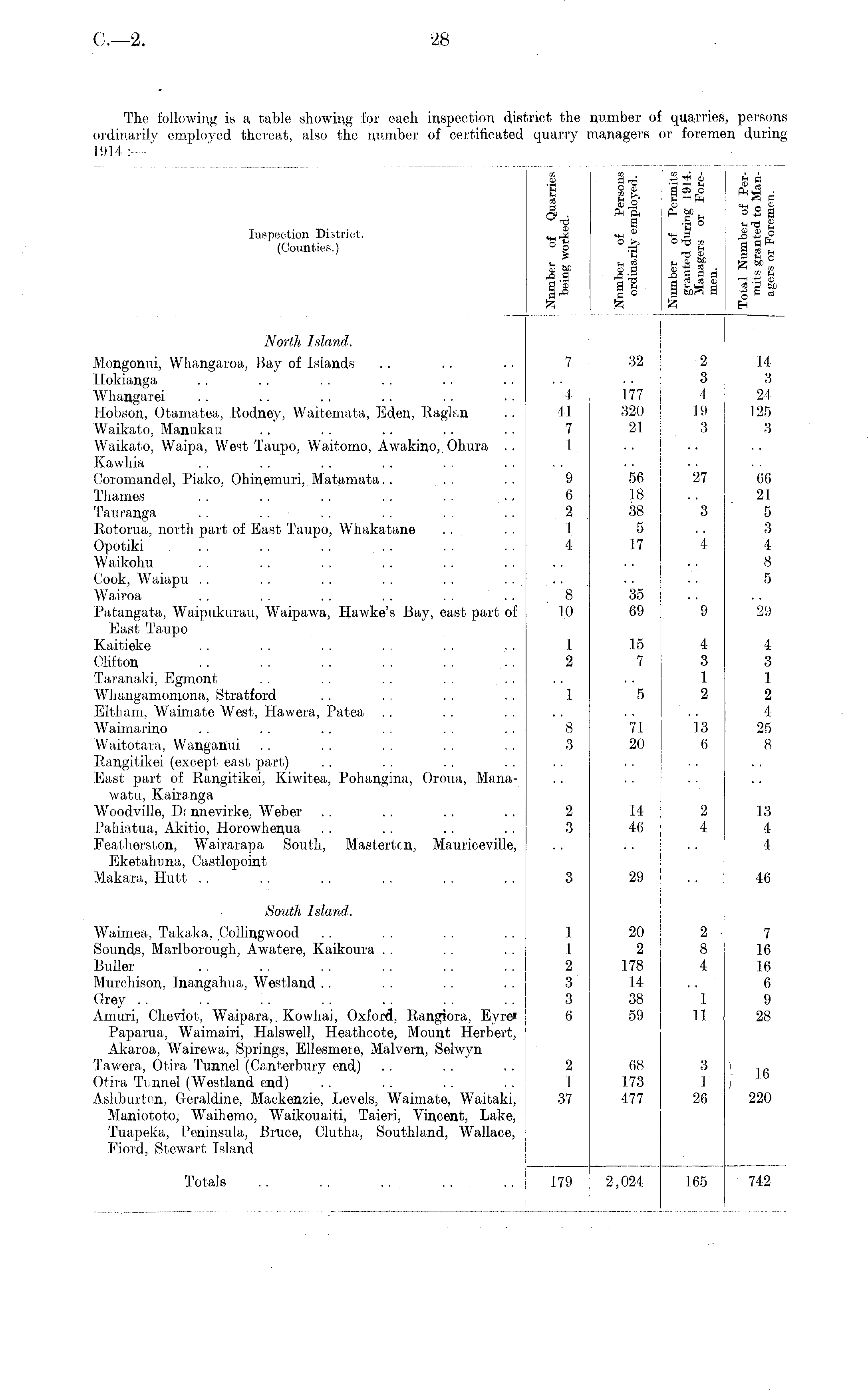 The following is a table showing for each inspection district the number of quarries, persons ordinarily employed thereat, also the number of certificated quarry managers or foremen during 1914:—
