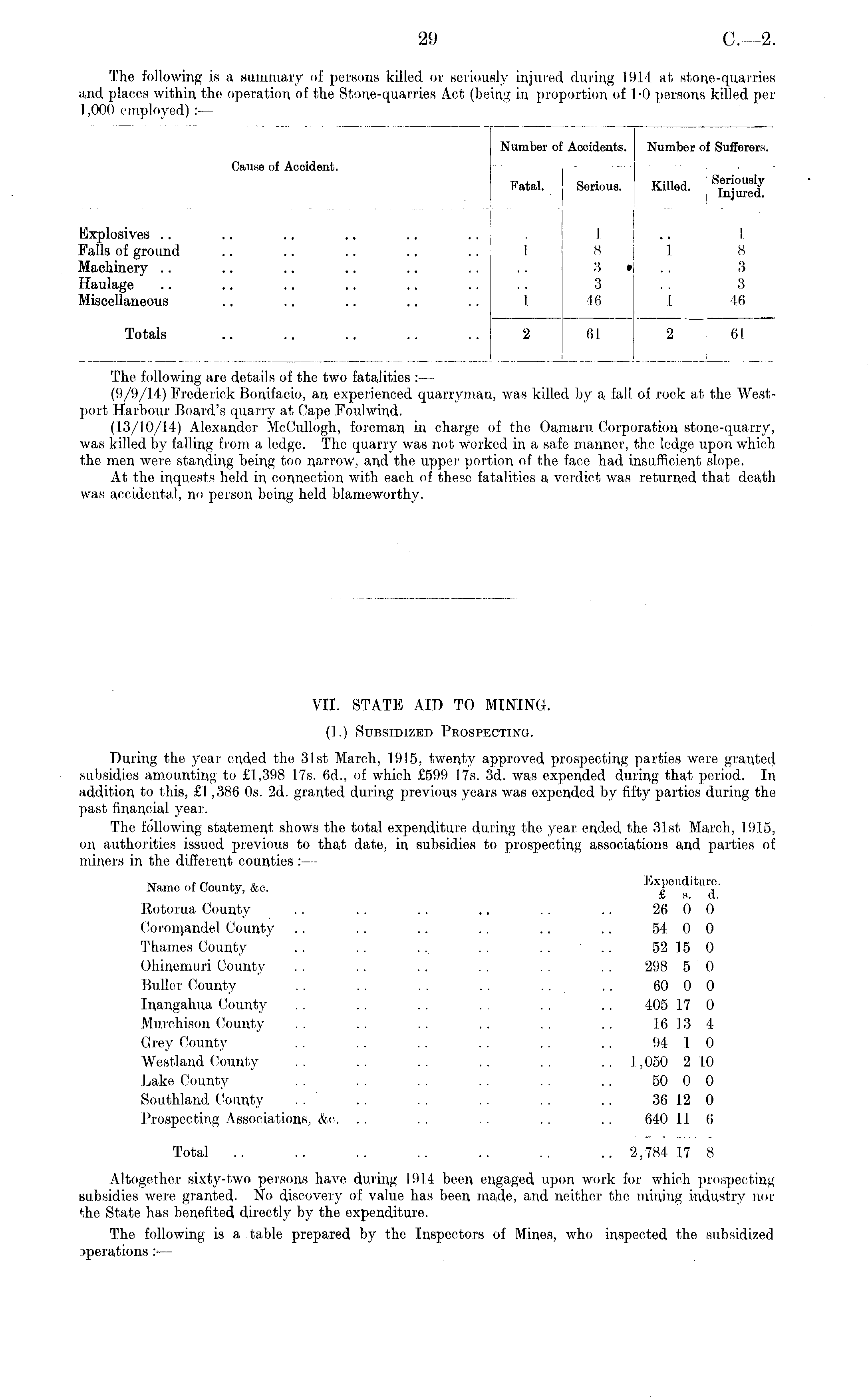 The following are details of the two fatalities : — (9/9/14) Frederick Bonifacio, an experienced quarrvman, was killed by a fall of rock at the Westport Harbour Board's quarry at Cape Foulwind. (13/10/14) Alexander McCullogh, foreman in charge of the Oamaru Corporation stone-quarry, was killed by falling from a ledge. The quarry was not worked in a safe manner, the ledge upon which the men were standing being too narrow, and the upper portion of the face had insufficient slope. At the inquests held in connection with each of these fatalities a verdict was returned that death was accidental, no person being held blameworthy.