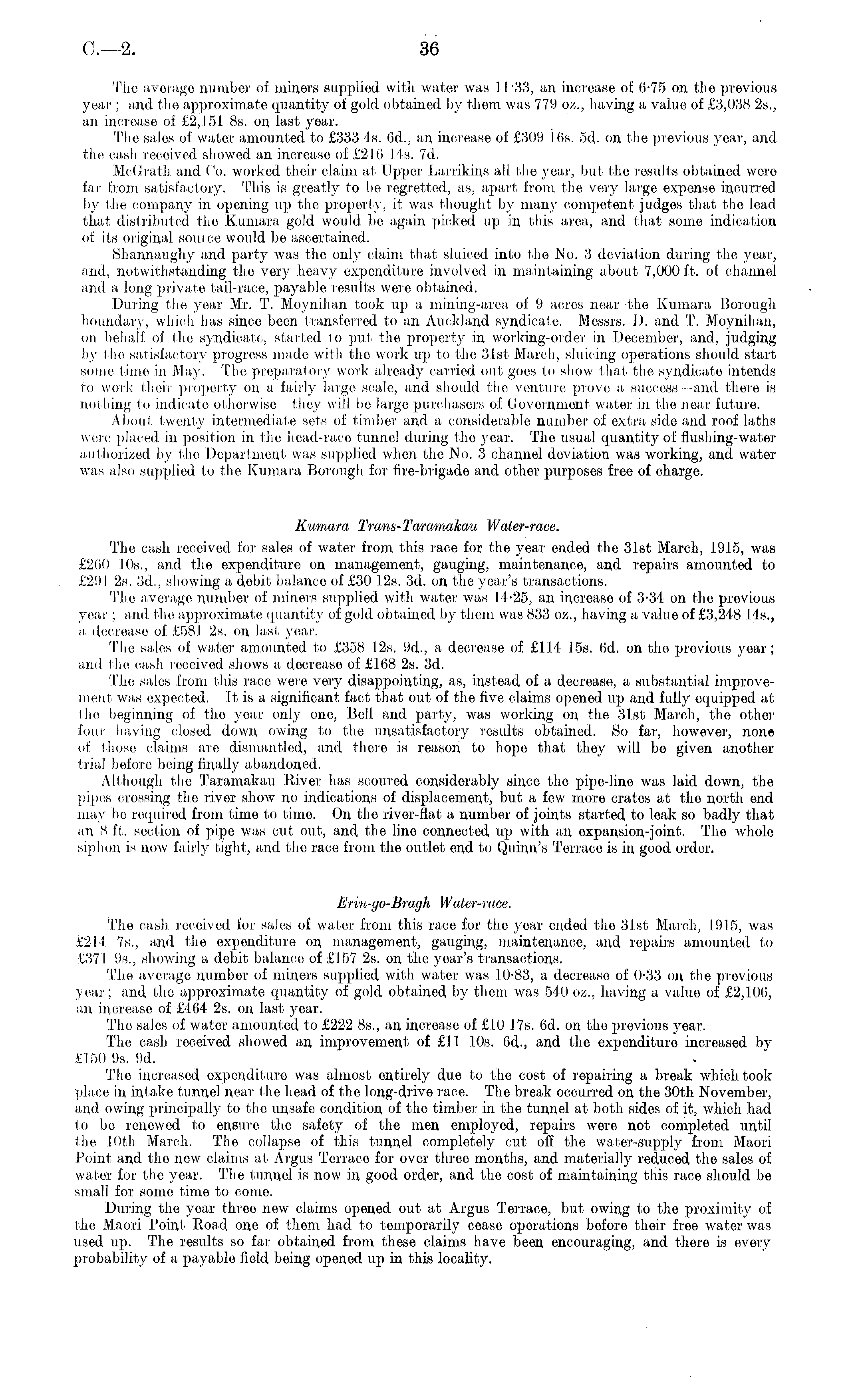 The average number of. miners supplied with water was 11 -33, an increase of 6-75 on the previous year ; arid the approximate quantity of gold obtained by them was 779 oz., having a value of £3,038 25., an increase of £2,151 Bs. on last year. The sales of water amounted to £333 4s. 6d., an increase of £309 His. 5d- on the previous year, and the cash received showed an increase of £216145. 7d. McGrath and Co. worked their claim at Upper Larrikins all the year, but the results obtained were far from satisfactory. This is greatly to be regretted, as, apart from the very large expense incurred by the company in opening up the property, it was thought by many competent judges that the lead that distributed the Kumara gold would be again picked up in this area, and that some indication of its original source would be ascertained. Shannaughy and party was the only claim that sluiced into the No. 3 deviation during tho year, and, notwithstanding the very heavy expenditure involved in maintaining about 7,000 ft. of channel and a long private tail-race, payable results were obtained. During the year Mr. T. Moynihan took up a mining-area of 9 acres near the Kumara Borough boundary, which has since been transferred to an Auckland syndicate. Messrs. D. and T. Moynihan, on behalf of the syndicate, started lo put the property in working-order in December, and, judging by the satisfactory progress made with the work up to the 31st March, sluicing operations should start some time in May. The preparatory work already carried out goes to show that the syndicate intends to work their property on a fairly large scale, and should the venture prove a success -and there is nothing to indicate otherwise the)- will be large purchasers of Government water in the near future. About twenty intermediate sets of timber and a considerable number of extra side and roof laths were placed in position in the head-race tunnel during the year. The usual quantity of flushing-water authorized by the Department was supplied when the No. 3 channel deviation was working, and water was also supplied to the Kumara Borough for lire-brigade and other purposes free of charge. Kumara Trans-Taramakau Water-race. The cash received for sales of water from this race for the year ended the 31st March, 1915, was £200 10s., and the expenditure on management, gauging, maintenance, and repairs amounted to £291 2s. 3d., showing a debit balance of £30 12s. 3d. on the year's transactions. Tho average number of miners supplied with water was 14-25, an increase of 3-34 on the previous year; and the approximate quantity of gold obtained by them was 833 oz., having a value of £3,248 145., a decrease of £581 2s. on last year. The sales of water amounted to £358 12s, 9d., a decrease of £114 15s. 6d. on the previous year; and the cash received shows a decrease of £168 2s. 3d. The sales from this race were very disappointing, as, instead of a decrease, a substantial improvement was expected. It is a significant fact that out of the five claims opened up and fully equipped at the beginning of the year only one, Bell and party, was working on the 31st March, the other four having closed down owing to the unsatisfactory results obtained. So far, however, none of those claims are dismantled, and there is reason to hope that they will be given another trial before being finally abandoned. Although the Taramakau River has scoured considerably since the pipe-lino was laid down, the pij>es crossing the river show no indications of displacement, but a few more crates at tho north, end may be required from time to time. On the river-fiat a number of joints started to leak so badly that an 8 ft. section of pipe was cut out, and the line connected up with an expansion-joint. Tho whole siphon is now fairly tight, and the race from the outlet end to Quinn's Terrace is in good order. Erin-go-Bragh Water-race. The cash received for sales of water from this race for the year ended the 31st March, 1915, was £214 75., and the expenditure on management, gauging, maintenance, and repairs amounted to £371 95., showing a debit balance of £157 2s. on the year's transactions. The average number of miners supplied with water was 10-83, a decrease of 0-33 on the previous year; and tho approximate quantity of gold obtained by them was 540 oz., having a value of £2,106, an increase of £464 2s. on last year. The sales of water amounted to £222 Bs., an increase of £10 17s. 6d. on the previous year. The cash received showed an improvement of £11 10s. 6d., and the expenditure increased by £150 9s. 9d. The increased expenditure was almost entirely due to the cost of repairing a break which took place in intake tunnel near the head of the long-drive race. The break occurred on the 30th November, and owing principally to the unsafe condition of the timber in the tunnel at both sides of it, which had to bo renewed to ensure the safety of the men employed, repairs were not completed until the 10th March. The collapse of this tunnel completely cut off the water-supply from Maori Point and tho new claims at Argus Terrace for over three months, and materially reduced the sales of water for the year. The tunnel is now in good order, and the cost of maintaining this race should be small for some time to come. During the year three new claims opened out at Argus Terrace, but owing to the proximity of the Maori Point Road one of them had to temporarily cease operations before their free water was used up. The results so far obtained from these claims have been encouraging, and there is every probability of a payable field being opened up in this locality.