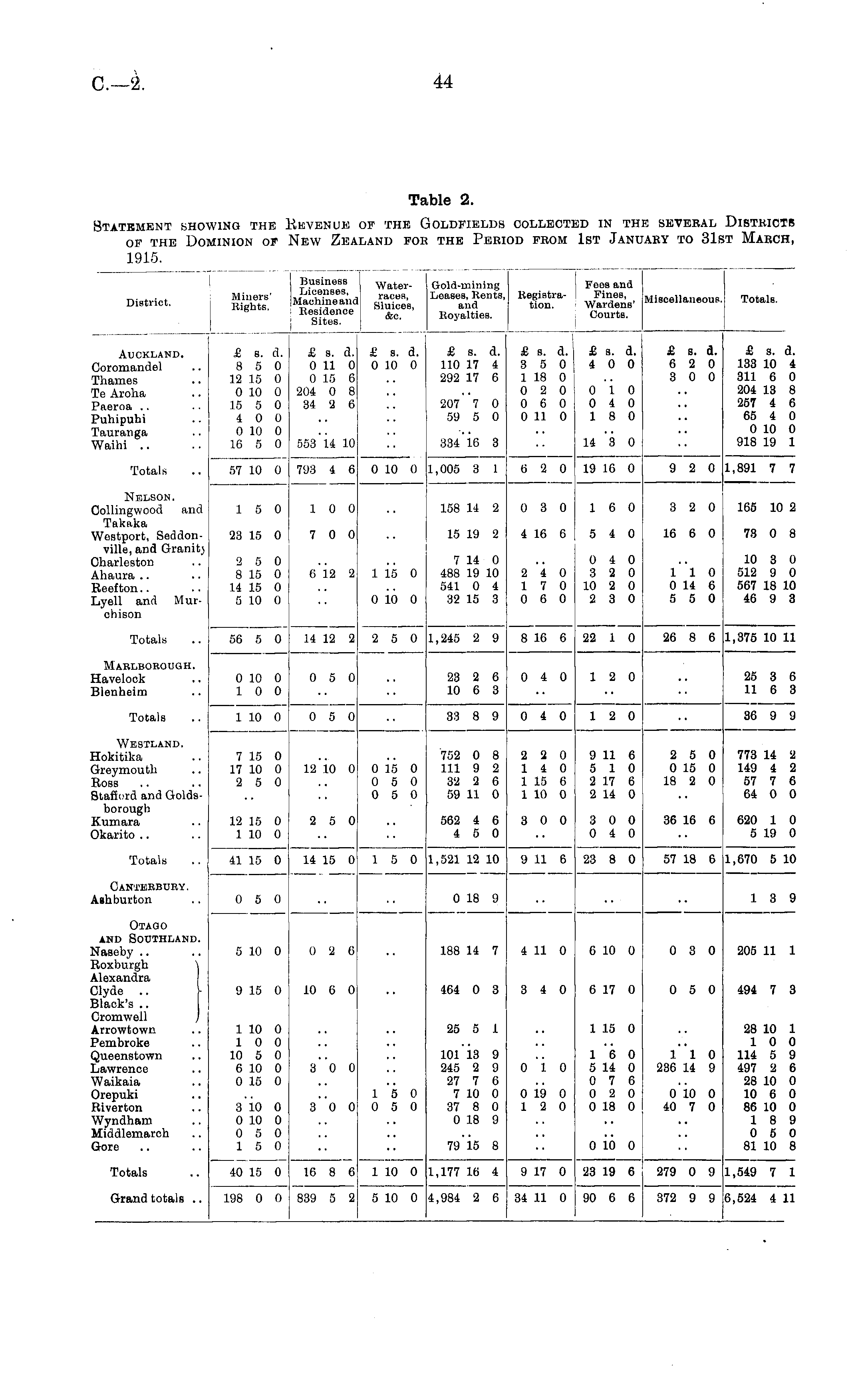 Table 2. Statement showing the Revenue of the Goldfields collected in the several Districts of the Dominion of New Zealand for the Period from 1st January to 31st March, 1915.
