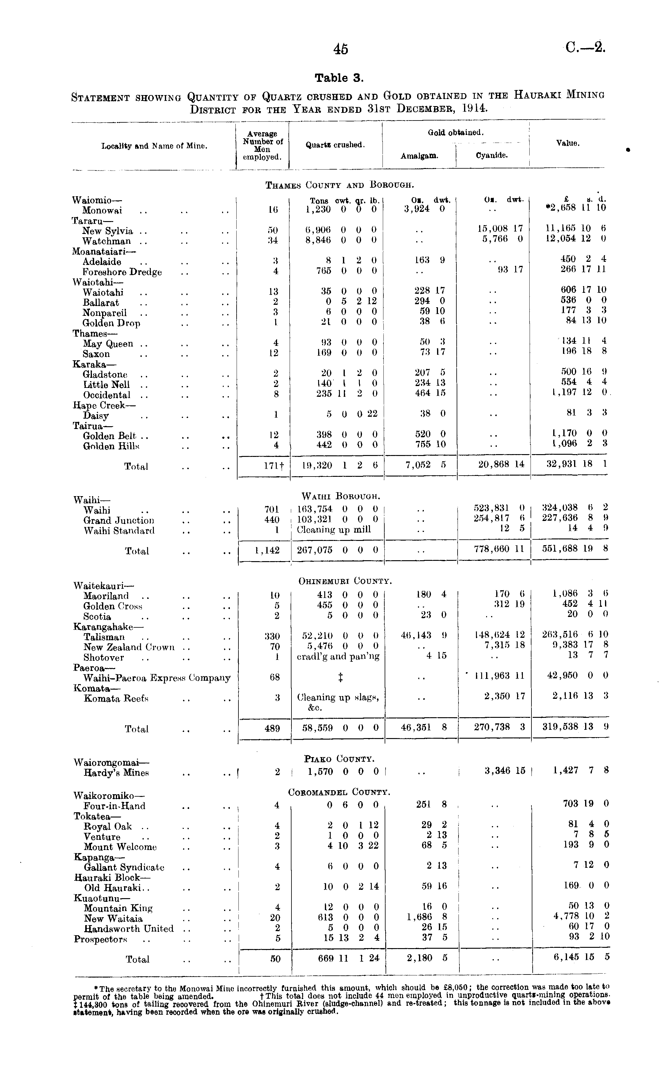 Table 3. Statement showing Quantity of Quartz crushed and Gold obtained in the Hauraki Mining District for the Year ended 31st December, 1914.