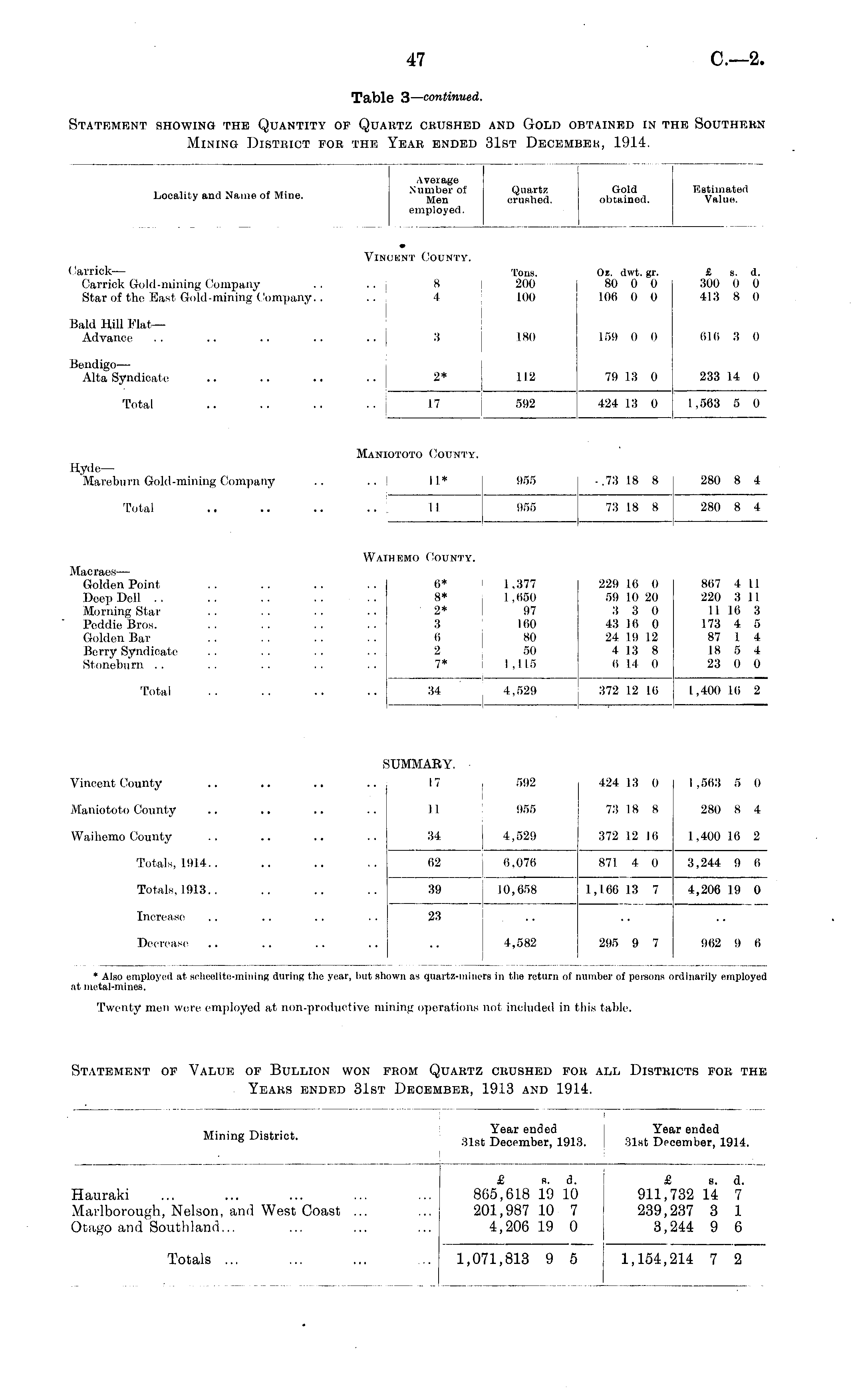 Table 3 — continued. Statement showing the Quantity of Quartz crushed and Gold obtained in the Southern Mining District for the Year ended 31st December, 1914.