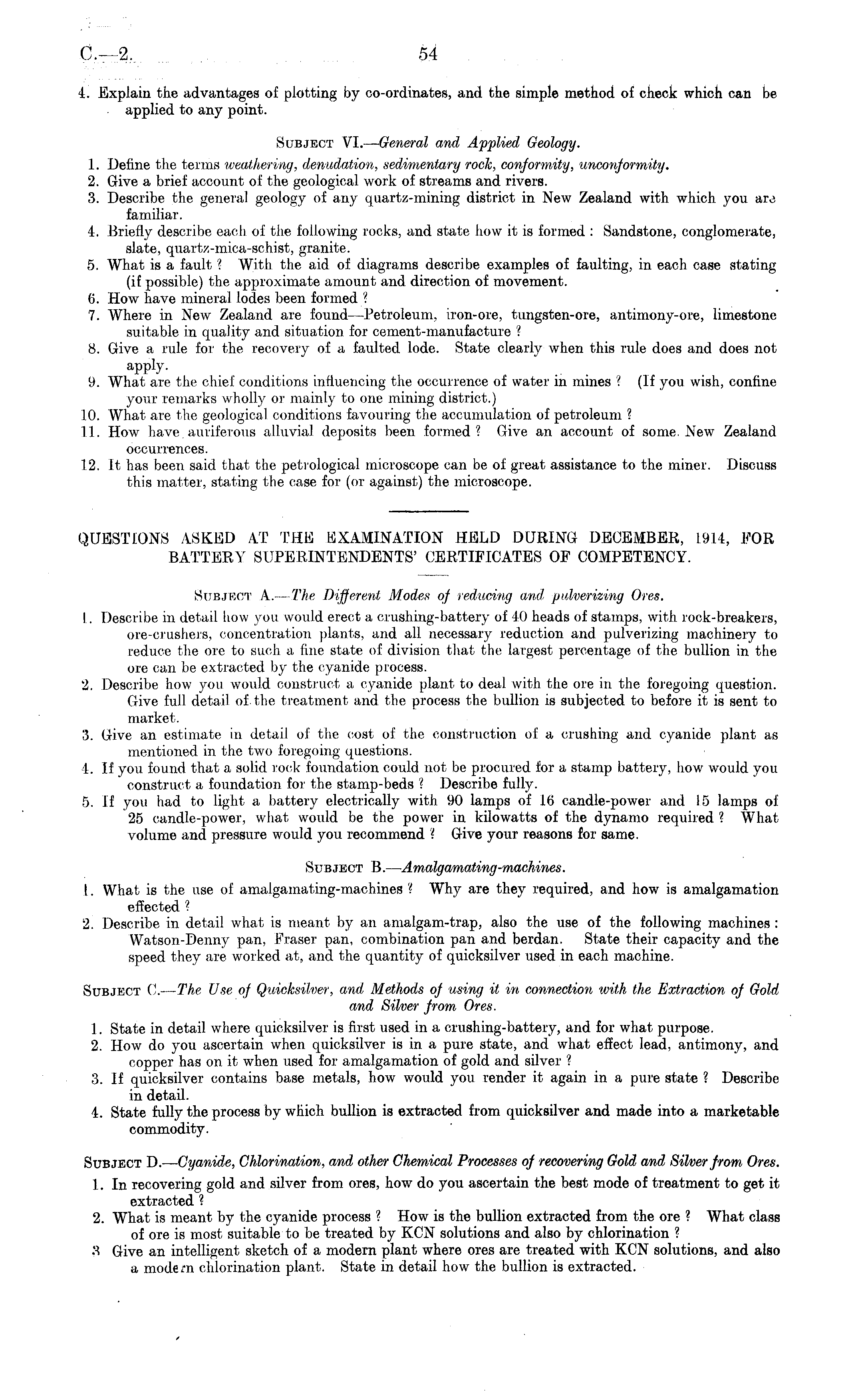 QUESTIONS ASKED AT THE EXAMINATION HELD DURING DECEMBER, 1914, FOR BATTERY SUPERINTENDENTS' CERTIFICATES OF COMPETENCY. Subject A.— The Different Modes of reducing and, pulverizing Ores. 1. Describe in detail how you would erect a crushing-battery of 40 heads of stamps, with rock-breakers, ore-crushers, concentration plants, and all necessary reduction and pulverizing machinery to reduce the ore to such a fine state of division that the largest percentage of the bullion in the ore can be extracted by the cyanide process. 2. Describe how you would construct a cyanide plant to deal with the ore in the foregoing question. Give full detail of the treatment and. the process the bullion is subjected to before it is sent to market. 3. Give an estimate in detail of the cost of the construction of a crushing and cyanide plant as mentioned in the two foregoing questions. 4. If you found that a solid rock foundation could not be procured for a stamp battery, how would you construct a foundation for the stamp-beds ? Describe fully. 5. If you had to light a battery electrically with 90 lamps of 16 candle-power and 15 lamps of 25 candle-power, what would be the power in kilowatts of the dynamo required ? What volume and pressure would you recommend ? Give your reasons for same. Subject B.—- Amalgamating-machines. 1. What is the use of amalgamating-machines ? Why are they required, and how is amalgamation effected 1 2. Describe in detail what is meant by an amalgam-trap, also the use of the following machines : Watson-Denny pan, Fraser pan, combination pan and berdan. State their capacity and the speed they are worked at, and the quantity of quicksilver used in each machine. Subject C.— The Use of Quicksilver, and Methods of using it in connection with the Extraction of Gold and Silver from, Ores. 1. State in detail where quicksilver is first used in a crushing-battery, and for what purpose. 2. How do you ascertain when quicksilver is in a pure state, and what effect lead, antimony, and copper has on it when used for amalgamation of gold and silver ? 3. If quicksilver contains base metals, how would you render it again in a pure state ? Describe in detail. 4. State fully the process by which bullion is extracted from quicksilver and made into a marketable commodity. Subject D.— Cyanide, Chlorination, and other Chemical Processes of recovering Gold and Silver front Ores. 1. In recovering gold and silver from ores, how do you ascertain the best mode of treatment to get it extracted ? 2. What is meant by the cyanide process ? How is the bullion extracted from the ore ? What class of ore is most suitable to be treated by KCN solutions and also by chlorination ? 3 Give an intelligent sketch of a modern plant where ores are treated with KCN solutions, and also a modem chlorination plant. State in detail how the bullion is extracted.
