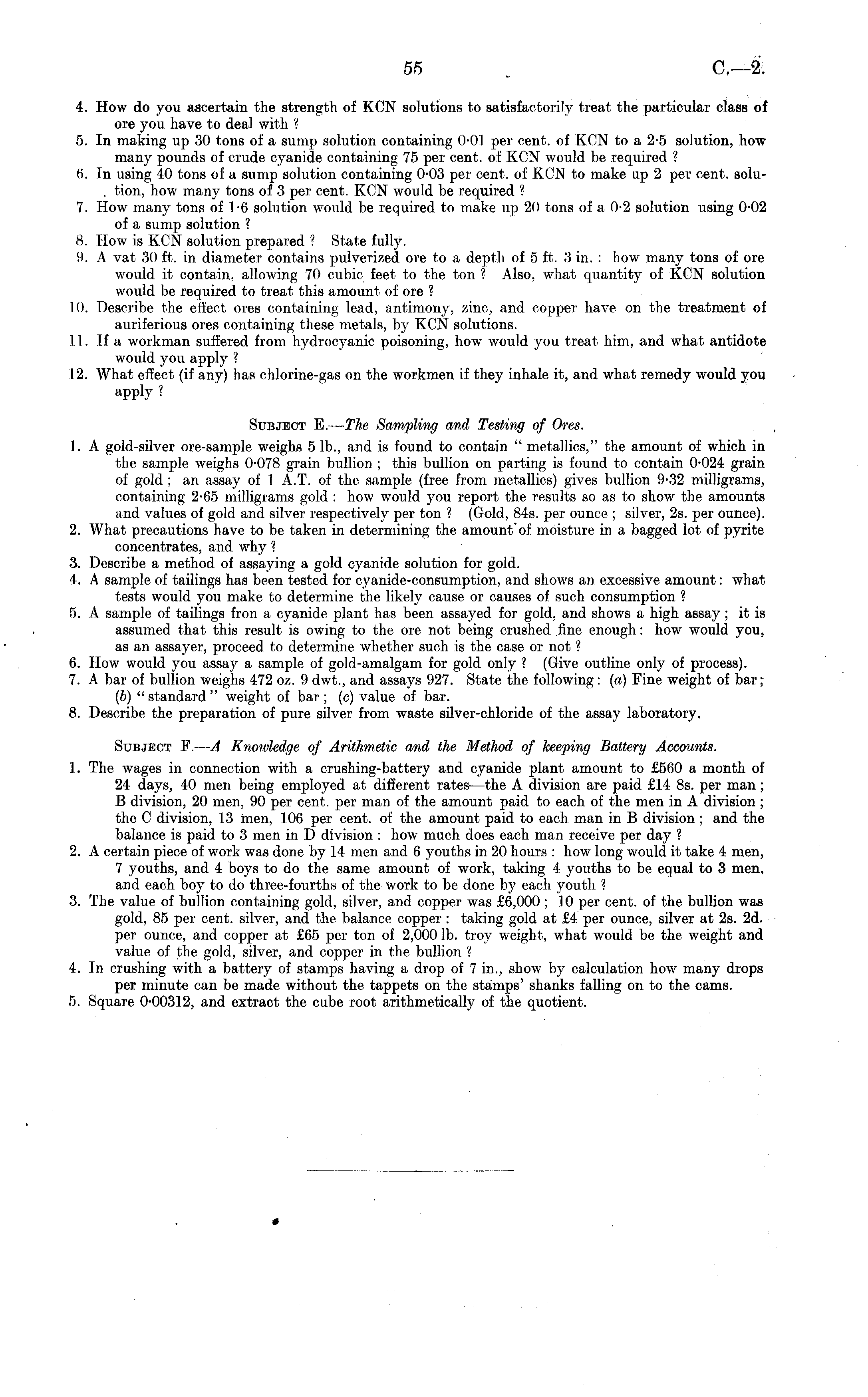 4. How do you ascertain the strength of KCN solutions to satisfactorily treat the particular class of ore you have to deal with ? 5. In making up 30 tons of a sump solution containing 0-01 per cent, of KCN to a 2-5 solution, how many pounds of crude cyanide containing 75 per cent, of KCN would be required ? 6. In using 40 tons of a sump solution containing 0-03 per cent, of KCN to make up 2 per cent, solu- , tion, how many tons of 3 per cent. KCN would be required ? 7. How many tons of 1-6 solution would be required to make up 20 tons of a 0-2 solution using 0-02 of a sump solution ? 8. How is KCN solution prepared ? State fully. 9. A vat 30 ft. in diameter contains pulverized ore to a depth of 5 ft. 3 in. : how many tons of ore would it contain, allowing 70 cubic feet to the ton ? Also, what quantity of KCN solution would be required to treat this amount of ore ? 10. Describe the effect ores containing lead, antimony, zinc, and copper have on the treatment of auriferious ores containing these metals, by KCN solutions. 11. If a workman suffered from hydrocyanic poisoning, how would you treat him, and what antidote would you apply ? 12. What effect (if any) has chlorine-gas on the workmen if they inhale it, and what remedy would you apply ? Subject E.— The Sampling and Testing of Ores. 1. A gold-silver ore-sample weighs 5 lb., and is found to contain " metallics," the amount of which in the sample weighs 0-078 grain bullion ; this bullion on parting is found to contain 0-024 grain of gold ; an assay of 1 A.T. of the sample (free from metallics) gives bullion 9-32 milligrams, containing 2-65 milligrams gold : how would you report the results so as to show the amounts and values of gold and silver respectively per ton ? (Gold, 84s. per ounce ; silver, 2s. per ounce). 2. What precautions have to be taken in determining the amount of moisture in a bagged lot of pyrite concentrates, and why ? 3. Describe a method of assaying a gold cyanide solution for gold. 4. A sample of tailings has been tested for cyanide-consumption, and shows an excessive amount: what tests would you make to determine the likely cause or causes of such consumption ? 5. A sample of tailings fron a cyanide plant has been assayed for gold, and shows a high assay ; it is assumed that this result is owing to the ore not being crushed fine enough : how would you, as an assayer, proceed to determine whether such is the case or not ? 6. How would you assay a sample of gold-amalgam for gold only % (Give outline only of process). 7. A bar of bullion weighs 472 ox. 9 dwt., and assays 927. State the following : (a) Fine weight of bar; (b) "standard" weight of bar; (c) value of bar. 8. Describe the preparation of pure silver from waste silver-chloride of the assay laboratory, Subject F. — A Knowledge of Arithmetic and the Method of Imepdng Battery Accounts. 1. The wages in connection with a crushing-battery and cyanide plant amount to £560 a month of 24 days, 40 men being employed at different rates —the A division are paid £14 Bs. per man ; B division, 20 men, 90 per cent, per man of the amount paid to each of the men in A division ; the C division, 13 men, 106 per cent, of the amount paid to each man in B division ; and the balance is paid to 3 men in D division : how much does each man receive per day ? 2. A certain piece of work was done by 14 men and 6 youths in 20 hours : how long would it take 4 men, 7 youths, and 4 boys to do the same amount of work, taking 4 youths to be equal to 3 men, and each boy to do three-fourths of the work to be done by each youth '{ 3. The value of bullion containing gold, silver, and copper was £6,000 ; 10 per cent, of the bullion was gold, 85 per cent, silver, and the balance copper : taking gold at £4 per ounce, silver at 2s. 2d. per ounce, and copper at £65 per ton of 2,000 lb. troy weight, what would be the weight and value of the gold, silver, and copper in the bullion ? 4. In crushing with a battery of stamps having a drop of 7 in., show by calculation how many drops per minute can be made without the tappets on the stamps' shanks falling on to the cams. 5. Square 0-00312, and extract the cube root arithmetically of the quotient.