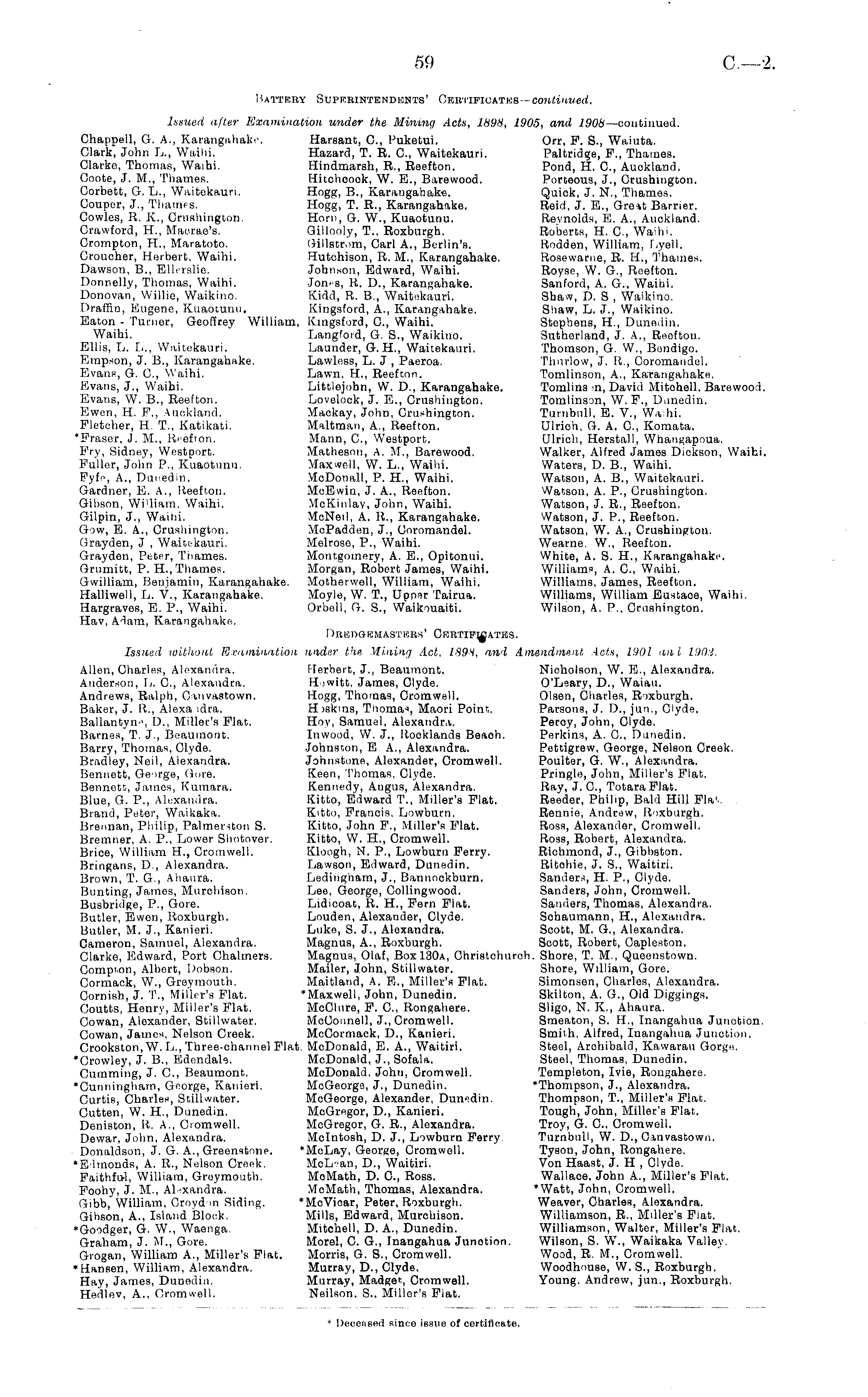 Battery Superintendents' Certificates - continued. Issued after Examination under the Mining Acts, 1898, 1905, and 1908 —continued. Chappell, G. A., Karangahake. Harsant, C, Puketui. Orr, F. S., Waiuta. Clark, John L., Waihi. Hazard, T. R. C, Waitokauri. Paltridge, F., Thames. Clarko, Thomas, Waihi. Hindmarsh, R., Reefton. Pond, H. C, Auckland. Coote, J. M., Thames. Hitchcook, W. E., Barewood. Porteous, J., Orushmgton. Corbett, G. L., Waitekauri. Hogg, 8., Karangahake. Quick, J. N., Thames. Couper, J., Thames. Hogg, T. R., Karangahake. Reid, J. E., Greit Barrier. Cowles, R. K., Crushington. Horn, G. W., Kuaotunu. Reynolds, B. A., Auckland. Crawford, H., Macrae's. Gillooly, T., Roxburgh. Roberts, H. C., Waihi. Orompton, H., Maratoto. Gillstrom, Carl A., Berlin's. Rodden, William, Lyell. Croucher, Herbert. Waihi. Hutchison, R. M., Karangahake. Rosewarne, R. H., Thames. Dawson, 8., BUerslie. Johnson, Edward, Waihi. Royse, W. G., Reefton. Donnelly, Thomas, Waihi. Jonrs, R. D., Karangahake. Sanford, A. G., Waihi. Donovan, Willie, Waikino. Kidd, R. 8., Waitekauri. Shaw, D. S , Waikino. Draffiu, Eugene, Kuaotunu. Kingsford, A., Karangahake. Shaw, L. J., Waikino. Eaton - Turner, Geoffrey William, Kingsford, 0., Waihi. Stephens, H., Dunedin. Waihi. Langford, G. S., Waikino. Sutherland, J. A., Reoftou. Ellis, L. 1..., Waitekauri. Launder, G. H., Waitekauri, Thomson, G. W., Bondigo. Empson, J. 8., Karangahake. Lawless, L. J , Paeroa. Thnrlow, J. It., Coromandel. Evans, G. C, Waihi. Lawn, H., Reefton. Tomlinson, A., Karangahake. Evans, J., Waihi. Littiejohn, W. D., Karangahake. Tomlins n, David Mitchell. Barewood Evans, W. 8., Reefton. Lovelock, J. E., Crushington. Tomlinson, W. F., Dunedin. Ewen, H. F., Auckland. Mackay, John, Crushington. Turnbnll, E. V., Wi hi. Fletcher, H. T., Katikati. Maltman, A., Reefton. Ulrich, G. A. C, Komata. 'Eraser. J. M., Reefton. Mann, C, Westport. Ulrich, Herstall, Whangapoua. Fry, Sidney, Westport. Matheson, A. M., Barewood. Walker, Alfred James Dickson, Waihi Fuller, John P., Kuaotunu, Maxwell, W. L., Waihi. Waters, D. 8., Waihi. Fyfe, A., Dunedin. McDonall, P. H., Waihi. Watson, A. 8., Waitekauri. Gardner, E. A., Reefton. MoEwin, J. A., Reefton. Watson, A. P., Crushington. Gibson, Wi'liam, Waihi. McKinlay, John, Waihi. Watson, J. R., Reefton. Gilpin, J., Waihi. McNeil, A. R., Karangahake. Watson, J. P., Reefton. Gow, B. A., Crushington. MoPadden, J., Coromandel. Watson, W. A., Crushington. Grayden, J , Waitekauri. Melrose, P., Waihi. Wearne. W,, Reefton. Grayden, Peter, Thames. Montgomery, A. 8., Opitonui. Whito, A. S. H., Karangahake. Grumitt, P. H., Thamos. Morgan, Robert James, Waihi. Williams, A. 0., Waihi. Gwilliam, Benjamin, Karangahake. Motherwell, William, Waihi. Williams, Jamos, Reefton. Halliwell, L. V., Karangahake. Moyle, W. T., Uppor Tairua. Williams, William Eustace, Waihi. Hargraves, B. P., Waihi. Orbell, G. S., Waikouaiti. Wilson, A. P., Crushington. Hav, Adam, Karangahake. DREDGEMASTBRs' CERTIFICATES. Issued without Examination under the Mining Act, 1898, and Amendment Acts, 1901. mil 190:!. Allen, Charles, Alexandra. Herbert, J., Beaumont. Nicholson, W. E., Alexandra. Anderson, L. C., Alexandra. Hiwitt, Jamos, Clyde. O'Loary, D., Waiau. Andrews, Ralph, Canvastown. Hogg, Thomas, Cromwell. Olsen, Charles, Rixburgh. Baker, J. R., Alexa idra. Hiskms, Thomas, Maori Point. Parsons, J. D., jun., Clyde. Ballantyn-', D., Miller's Flat. Hoy, Samuel, Alexandra. Peroy, John, Clyde. Barnes, T. J., Beaumont. Inwood, W. J., Rocklands Beaoh. Perkins, A. 0., Dunedin. Barry, Thomas, Clyde. Johnston, E A., Alexandra. Pettigrew, George, Nelson Creek. Bradley, Neil, Alexandra. Johnstone, Alexander, Cromwell. Poultor, G. W., Alexandra. Bennett, George, Gore, Keen, Thomas, Clyde. Pringle, John, Miller's Flat. Bennett, Jamos, Kumara. Kennedy, Angus, Alexandra. Ray, J. C, TotaraPlat. Blue, G. P., Alexandra. Kitto, Edward T„ Miller's Flat. Reoder, Philip, Bald Hill Flat. Brand, Peter, Waikaka. Kitto, Franois. Lowburn. Rennie, Andrew, Roxburgh. Brennan, Philip, PalmerUon S. Kitto, John F., Miller's Flat. Ross, Alexander, Cromwell. Bremner, A. P., Lower Shotover. Kitto, W. H., Cromwell. Ross, Robert, Alexandra. Brice, William H., Cromwell. Kloogh, N. P., Lowburu Perry. Richmond, J., Gibhston. Bringans, D., Alexandra. Lawson, Edward, Dunedin. Ritobie, J. S., Waitiri. Brown, T. G., Ahaura. Ledingham, J., Bannockburn. Sanders, H. P., Clyde. Bunting, James, Murchison. Lee, George, Collingwood. Sanders, John, Cromwell. Busbridge, P., Gore. Lidicoat, R. H., Fern Flat. Sanders, Thomas, Alexandra. Butler, Ewon, Roxburgh. Louden, Alexander, Clyde. Sohaumann, H., Alexandra. Butler, M. J., Kanieri. Luko, S. J., Aloxandra. Scott, M. G., Alexandra. Cameron, Samuel, Alexandra. Magnus, A., Roxburgh. Scott, Robert, Capleston. Clarke, Edward, Port Chalmers. Magnus, Olaf, Box 130a, Christchurch. Shore, T. M., Queenstown. Compiion, Albert, Dobson. Mailer, John, Stillwater. Shore, William, Gore. Cormack, W., Groymouth. Maitland, A. E., Miller's Flat. Simonsen, Charles, Aloxandra. Cornish, J. T., Miller's Flat. 'Maxwell, John, Dunedin. Skilton, A. G., Old Diggings. Coutts, Henry, Miller's Flat. McClnre, F. C, Rongahero. Sligo, N. K., Ahaura. Cowan, Alexander, Stillwater. MoConnell, J., Cromwell. Smeaton, S. H., Inangahua Junction. Cowan, James, Nelson Creek. McCormack, D., Kanieri. Smith, Alfred, Inangahua Junction. Crookston,W. L., Three-channel Flat. McDonald, E. A., Waitiri. Steel, Archibald, Kawarau Gorge. 'Crowley, J. 8., Edendale. McDonald, J., Sofala. Steel, Thomas, Dunedin. Cumming, J. C, Beaumont. McDonald. John, Cromwell. Templeton, Ivie, Rongahere. 'Cunningham, George, Kanieri. McGeorge, J., Dunedin. 'Thompson, J., Alexandra. Curtis, Charles, Stillwater. McGeorgo, Alexander, Dunedin. Thompson, T., Miller's Plat. Cutten, W. H., Dunedin. McGregor, D., Kanieri. Tough, John, Miller's Flat. Deniston, It. A., Cromwell. McGregor, G. R., Alexandra. Troy, G. C, Cromwell. Dewar, John, Alex