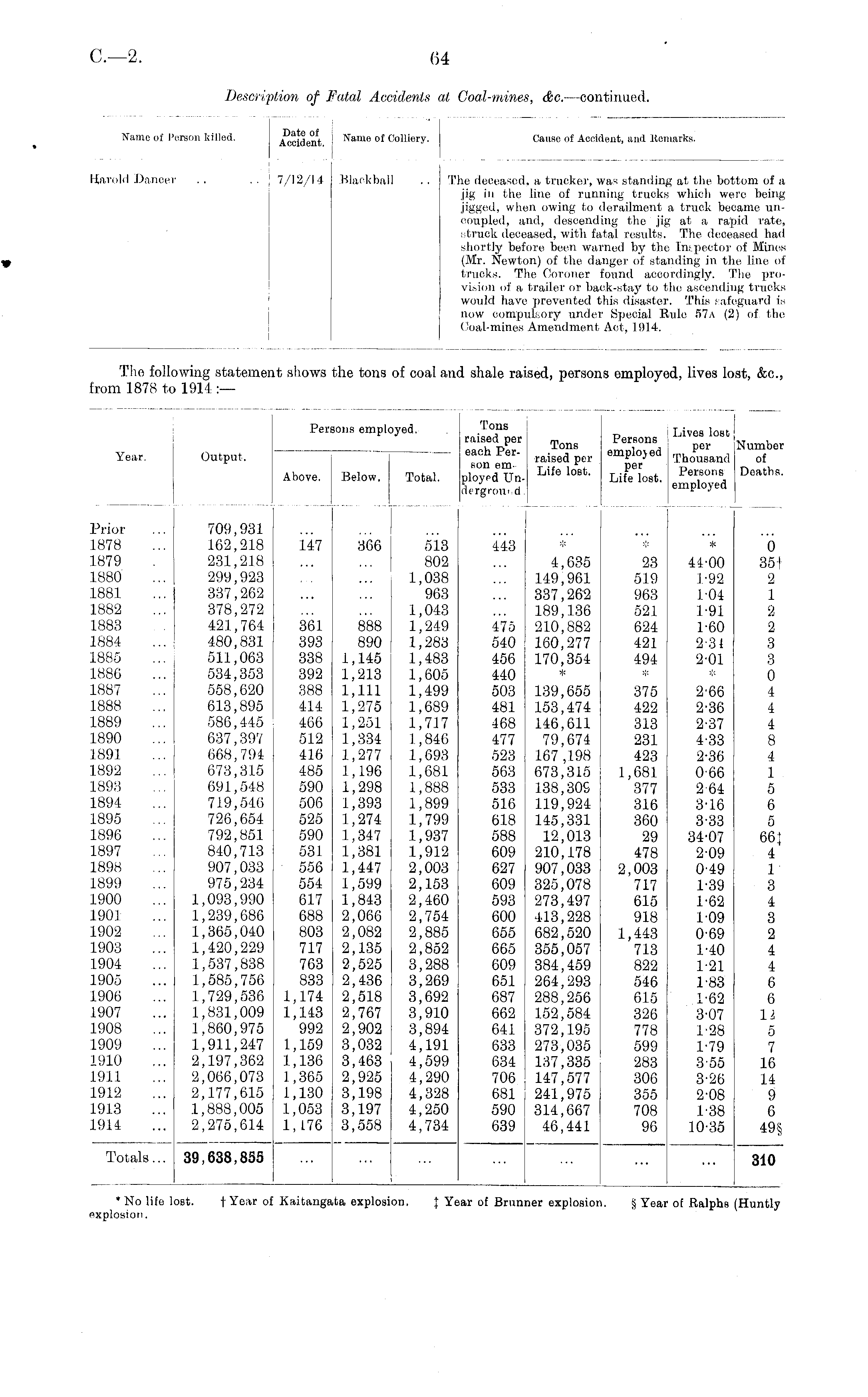 Year. Output. H Above. Persons empl, iyed. ad. Total. Tons raised per m - each Per- lo , ns son em- »»* Pf , , TT Life lost, ployed Underground Persons omplojed per Life lost. Lives lost per Thousand Persons employed Number of Deaths. Below. Prior 1878 1879 1880' 1881 1882 1883 1884 1885 1886 1887 1888 1889 1890 1891 1892 1893 1894 1895 1896 1897 1898 1899 1900 1901 1902 1903 1904 1905 1906 1907 1908 1909 1910 1911 1912 1913 1914 709,931 162,218 231,218 299,923 337,262 378,272 421,764 480,831 511,063 534,353 558,620 613,895 586,445 637,397 668,794 673,315 691,548 719,546 726,654 792,851 840,713 907,033 975,234 1,093,990 1,239,686 1,365,040 1,420,229 1,537,838 1,585,756 1,729,536 1,831,009 1.860,975 1,911,247 2,197,362 2,066,073 2,177,615 1,888,005 2,275,614 147 361 393 338 392 388 414 466 512 416 485 590 506 525 590 531 556 554 617 688 803 717 763 833 1,174 1,143 992 1,159 1,136 1,365 1,130 1,053 1,176 366 888 890 1,145 1,213 1,111 1,275 1,251 1,334 1,277 1,196 1,298 1,393 1,274 1,347 1,381 1,447 1,599 1,843 2,066 2,082 2,135 2,525 2,436 2,518 2,767 2,902 3,032 3,463 2,925 3,198 3,197 3,558 513 802 1,038 963 1,043 1,249 1,283 1,483 1,605 1,499 1,689 1,717 1,846 1,693 1,681 1,888 1,899 1,799 1,937 1,912 2,003 2,153 2,460 2,754 2,885 2,852 3,288 3,269 3,692 3,910 3,894 4,191 4,599 4,290 4,328 4,250 4,734 443 * 4,635 149,961 337,262 189,136 475 210,882 540 160,277 456 170,354 440 * 503 139,655 481 153,474 468 146,611 477 79,674 523 ! 167,198 563 673,315 533 138,309 516 119,924 618 145,331 588 12,013 609 210,178 627 907,033 609 325,078 593 273,497 600 413,228 655 682,520 665 355,057 609 384,459 651 264,293 687 288,256 662 152,584 641 372,195 633 273,035 634 137,335 > 706 147,577 681 241,975 590 [ 314,667 639 46,441 23 519 963 521 624 421 494 375 422 313 231 423 1,681 377 316 360 29 478 2,003 717 615 918 1,443 713 822 546 615 326 778 599 283 306 355 708 96 * 44-00 1-92 1-04 1-91 1-60 2-34 2-01 2'66 2-36 2-37 4-33 2-36 066 264 3-16 3-33 34-07 2-09 0-49 1-39 1-62 109 0-69 1-40 1-21 1-83 1-62 3-07 1-28 1-79 3 55 3-26 2-08 1-38 10-35 0 351 2 1 2 2 3 3 0 4 4 4 8 4 1 5 6 5 66 J 4 1 3 4 3 2 4 4 6 6 li 5 7 16 14 9 6 49 § Totals... 39,638,855 310 * No life I ixplosion. iBt. t Year ol Kaitangi ,la explosii m. } Y, iar of Brum ler explosio: § Yeai of Ralphs (Huntly