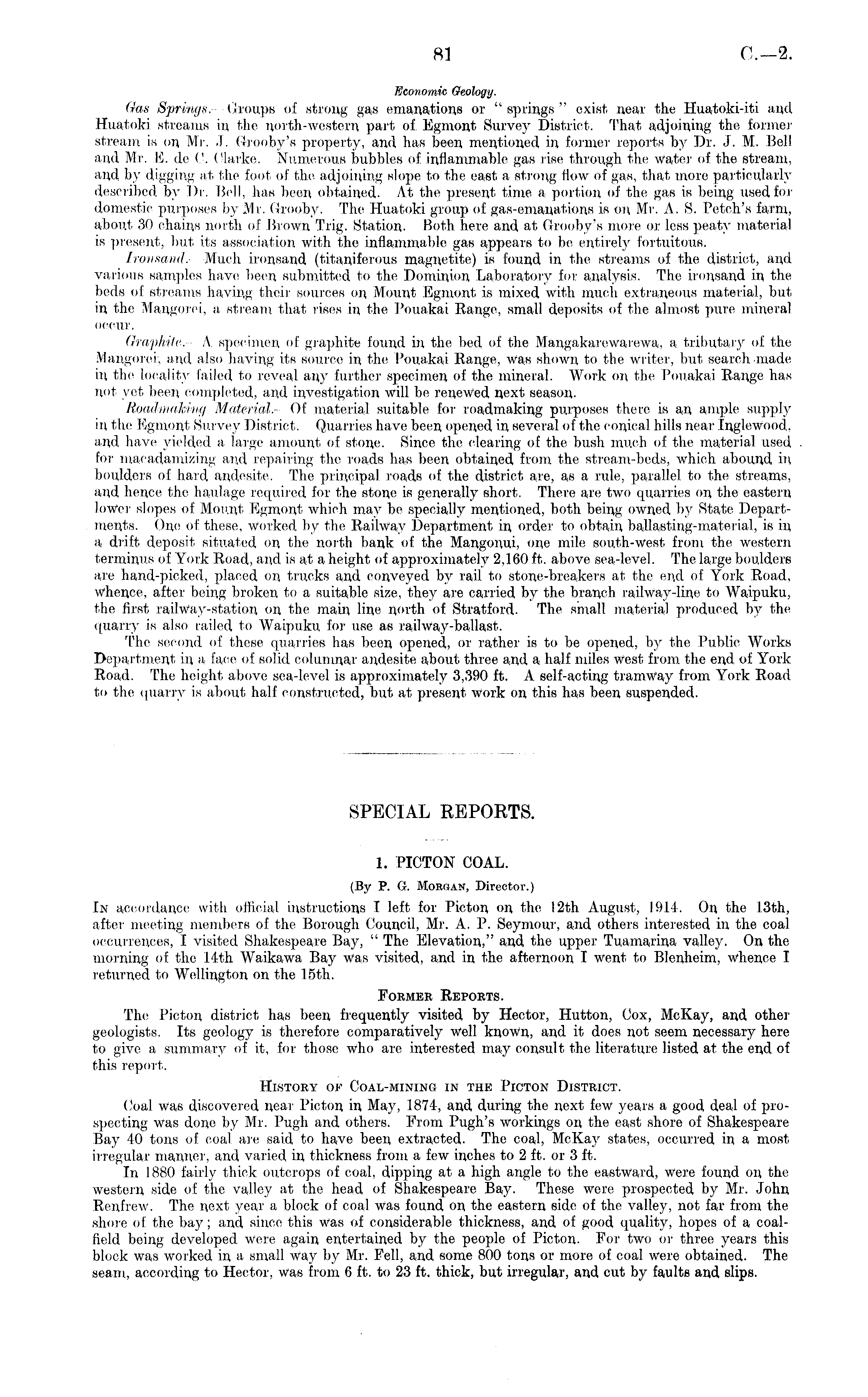 SPECIAL REPORTS. 1. PICTON COAL. (By P. G. Morgan, Director.) In accordance with official instructions I left for Picton on the 12th August, 1911. On the 13th, after meeting members of the Borough Council, Mr. A. P. Seymour, and others interested in the coal occurrences, I visited Shakespeare Bay, " The Elevation," and the upper Tuamarina valley. On the morning of the 14th Waikawa Bay Was visited, and in the afternoon I Went to Blenheim, whence I returned to Wellington on the 15th. Former Reports. The Picton district has been frequently visited by Hector, Hutton, Cox, McKay, and other geologists. Its geology is therefore comparatively Well known, and it does not seem necessary here to give a summary of it, for those who are interested may consult the literature listed at the end of this report. History of Coal-mining in the Picton District. Coal was discovered near Picton in May, 1874, and during the next few years a good deal of prospecting was done by Mr. Pugh and others. From Pugh's workings on the east shore of Shakespeare Bay 40 tons of coal are said to have been extracted. The coal, McKay states, occurred in a most irregular manner, and varied in thickness from a few inches to 2 ft. or 3 ft. In 1880 fairly thick outcrops of coal, dipping at a high angle to the eastward, were found on the western side of the valley at the head of Shakespeare Bay. These wore prospected by Mr. John Renfrew. The next year a block of coal was found on the eastern side of the valley, not far from the shore of the bay; and since this was of considerable thickness, and of good quality, hopes of a coalfield being developed were again entertained by the people of Picton. For two or three years this block was worked in a small way by Mr. Fell, and some 800 tons or more of coal were obtained. The seam, according to Hector, was from 6 ft. to 23 ft. thick, but irregular, and cut by faults and slips.