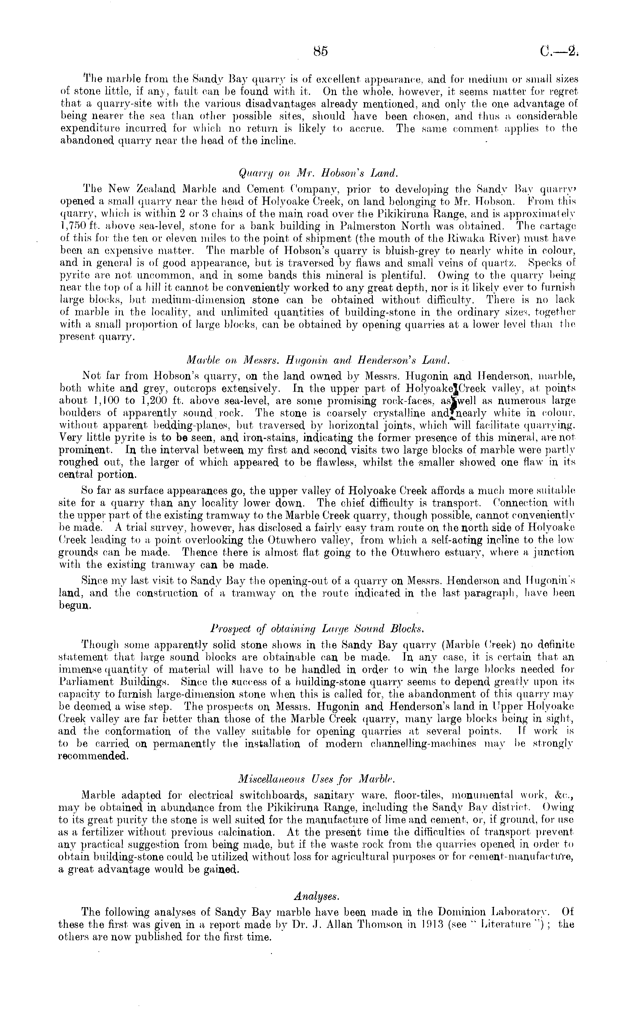 The marble from the Sandy Bay quarry is of excellent appearance, and for medium or small sizes of stone little, if any, fault can be found with it. On the whole, however, it seems matter for regret that a quarry-site with the various disadvantages already mentioned, and only the one advantage of being nearer the sea than other possible sites, should have been chosen, and thus a considerable expenditure incurred for which no return is likely to accrue. The same comment applies to the abandoned quarry near the head of the incline. Quarry on Mr. Hobson's Land. The New Zealand Marble and Cement Company, prior to developing the Sandy Bay quarry opened a small quarry near the head of Holyoake Creek, on land belonging to Mr. Hobson. From this quarry, which is within 2 or 3 chains of the main road over the Pikikiruna Range, and is approximately 1,750 ft. above sea-level, stone for u bank building in Palmerston North was obtained. The cartage of this for the ten or eleven miles to the point of shipment (the mouth of the Riwaka River) must have been an expensive matter. The marble of Hobson's quarry is bluish-grey to nearly white in colour, and in general is of good appearance, but is traversed by flaws and small veins of quartz. Specks of pyrite are not uncommon, and in some bands this mineral is plentiful. Owing to the quarry being near the top of a hill it cannot be conveniently worked to any great depth, nor is it likely ever to furnish large blocks, but medium-dimension stone can be obtained without difficulty. There is no lack of marble in the locality, and unlimited quantities of building-stone in the ordinary sizes, together with a small proportion of large blocks, can be obtained by opening quarries at a lower level than the present quarry. Marble on Messrs. Hugonin and Henderson's Land. Not far from Hobson's quarry, on the land owned by Messrs. Hugonin and Henderson-, marble, both white and grey, outcrops extensively, in the upper part of Holyoake|Creek valley, at points about 1,100 to 1,200 ft. above sea-level, are some promising rock-faces, asjjwell as numerous large boulders of apparently sound rock. The stone is coarsely crystalline andfnearly white in colour, without apparent bedding-planes, but traversed by horizontal joints, which will facilitate quarrying. Very little pyrite is to be seen, and iron-stains, indicating the former presence of this mineral, are not prominent. In the interval between my first and second visits two large blocks of marble were partly roughed out, the larger of which appeared to be flawless, whilst the smaller showed one flaw in its central portion. So far as surface appearances go, the upper valley of Holyoake Creek affords a much more suitable site for a quarry than any locality lower down. The chief difficulty is transport. Connection with the upper part of the existing tramway to the Marble Creek quarry, though possible, cannot conveniently be made. A trial survey, however, has disclosed a fairly easy tram route on the north side of Holyoake Creek leading to a, point overlooking the Otuwhero valley, from which a self-acting incline to the low grounds can be made. Thence there is almost flat going to the Otuwhero estuary, where a junction with the existing tramway can be made. Since my last visit to Sandy Bay the opening-out of a quarry on Messrs. Henderson and Hugonin's land, and the construction of a tramway on the route indicated in the last paragraph, have been begun. Prospect of obtaining Large Sound Blocks. Though some apparently solid stone shows in the Sandy Bay quarry (Marble Creek) no definite statement that large sound blocks are obtainable can be made. In any case, it is certain that an immense quantity of material will have to be handled in order to win the large blocks needed for Parliament Buildings. Since the success of a building-stone quarry seems to depend greatly upon its capacity to furnish large-dimension stone when this is called for, the abandonment of this quarry may be deemed a wise step. The prospects on Messrs. Hugonin and Henderson's land in Upper Holyoake Creek valley are far better than those of the Marble Creek quarry, many large blocks being in sight, and the conformation of the valley suitable for opening quarries at several points. If work is to be carried on permanently the installation of modern ohannelling-maehines may be strongly recommended. Miscellaneous Uses for Marble. Marble adapted for electrical switchboards, sanitary ware, floor-tiles, monumental work. &c, may be obtained in abundance from the Pikikiruna Range, including the Sandy Bay district. Owing to its great purity the stone is well suited for the manufacture of lime and cement, or, if ground, for use as a fertilizer without previous calcination. At the present time the difficulties of transport preventany practical suggestion from being made, but if the waste rock from the quarries opened in order to obtain building-stone could be utilized without loss for agricultural purposes or for cement-manufacture, a great advantage would be gained. Analyses. The following analyses of Sandy Bay marble have been made in the Dominion Laboratory. Of these the first was given in a report made by Dr. .). Allan Thomson in 1913 (see " Literature ") ; the others are now published for the first time.