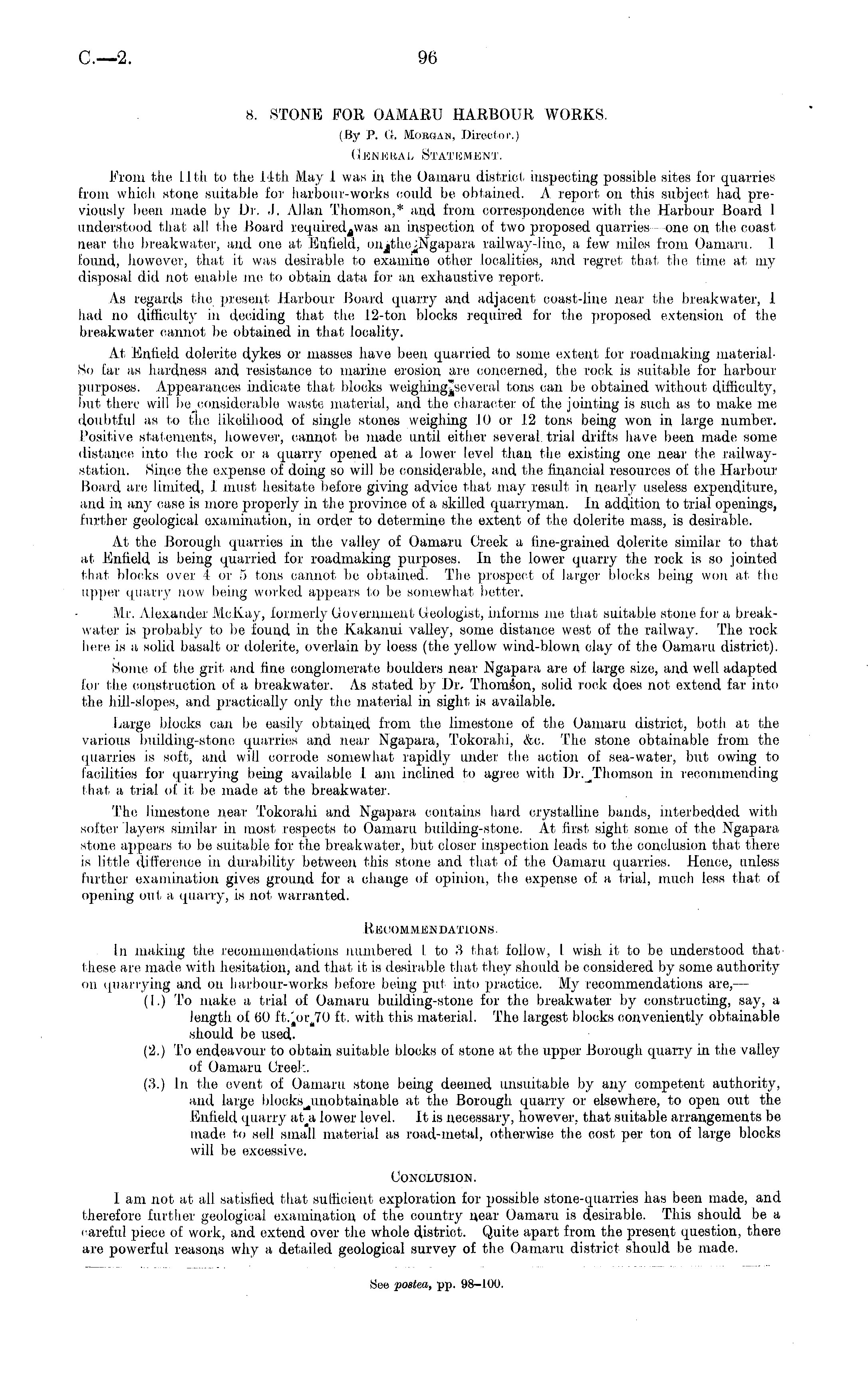8. STONE FOR OAMARU HARBOUR WORKS. (By J'. G. Morgan, Director.) General Statement. From the Llth to the 14th May 1 was in the Oamaru district- inspecting possible sites for quarries from which stone suitable for harbour-works could be obtained. A report on this subject had previously been made by Dr. .1. Allan Thomson,* and from correspondence with the Harbour Board 1 understood that all the Board requirediWas an inspection of two proposed quarries one on the coast near the breakwater, and one at Enfield, onjthejNgapara railway-lino, a few miles from Oamaru. 1 found, however, that it was desirable to examine other localities, and regret that the time at; my disposal did not enable me to obtain data for an exhaustive report. As regards the present Harbour Board quarry and adjacent coast-line near the breakwater, I had no difficulty in deciding that the 12-ton blocks required for the proposed extension of the breakwater cannot be obtained in that locality. At Enfield dolerite dykes or masses have been quarried to some extent for roadmaking materialSo far as hardness and resistance to marine erosion are concerned, the rock is suitable for harbour purposes. Appearances indicate that blocks tons can be obtained without difficulty, but there will be considerable waste material, and the character of the jointing is such as to make me doubtful as to the likelihood of single stones weighing .10 or .1.2 tons being won in large number. Positive statements, however, cannot be made until either several, trial drifts have been made some distance into the rock or a quarry opened at a lower level than the existing one near the railwaystation. Since the expense of doing so will be considerable, and the financial resources of the Harbour Board are limited, 1 must hesitate before giving advice that may result in nearly useless expenditure, and in any case is more properly in the province of a skilled quarryman. In addition to trial openings, further geological examination, in order to determine the extent of the dolerite mass, is desirable. At the Borough quarries in the valley of Oamaru Creek a fine-grained dolerite similar to that at Enfield is being quarried for roadmaking purposes. In the lower quarry the rock is so jointed that blocks over 4 or 5 tons cannot be obtained. The. prospect of larger blocks being won at the upper quarry now being worked appears to be somewhat better. Mr. Alexander McKay, formerly Government (Jeologist, informs me that suitable stone for a breakwater is probably to be found in the Kakanui valley, some distance west of the railway. The rock here is a solid basalt or dolerite, overlain by loess (the yellow wind-blown clay of tho Oamaru district). Some of the grit and fine conglomerate boulders near Ngapara are of large size, and well adapted for the construction of a breakwater. As stated by Dr. Thomson, solid rock does not extend far into the hill-slopes, and practically only the material, in sight is available. Large blocks can be easily obtained from the limestone of the Oamaru district, both at the various building-stone quarries and near Ngapara, Tokorahi, &c. The stone obtainable from the quarries is soft, and will corrode somewhat rapidly under the action of sea-water, but owing to facilities for quarrying being available I am inclined to agree with Dr.JThomson in recommending that a trial of it be made at the breakwater. The limestone near Tokorahi and Ngapara contains hard crystalline bands, mterbedded with softer 'layers similar in most respects to Oamaru building-stone. At first sight some of the Ngapara stone appears to be suitable for the breakwater, but closer inspection leads to the conclusion that there is little difference in durability between this stone and that of the Oamaru quarries. Hence, unless further examination gives ground for a change of opinion, the expense of a trial, much loss that of opening out a quarry, is not warranted. Recommendations. In making the recommendations numbered I to 3 that follow, I wish it to be understood that these are made with hesitation, and that it is desirable that they should be considered by some authority on quarrying and on harbour-works before being put into practice. My recommendations are, — (I.) To make a trial of Oamaru building-stone for the breakwater by constructing, say, a length ol 60 ft.'or,7o ft. with this material. The largest blocks conveniently obtainable should be used(2.) To endeavour to obtain suitable blocks of stone at the upper Borough quarry in the valley of Oamaru Creek. (3.) In the event of Oamaru stone being deemed unsuitable by any competent authority, and large blooksjinobtainable at the Borough quarry or elsewhere, to open out the Enfield quarry lower level. It is necessary, however, that suitable arrangements be made to sell small material as road-metal, otherwise the cost per ton of large blocks will be excessive. Conclusion. I am not at all satisfied that sufficient exploration for possible stone-quarries has been made, and therefore further geological examination of the country near Oamaru is desirable. This should be a careful piece of work, and extend over the whole district. Quite apart from the present question, there are powerful reasons why a detailed geological survey of the Oamaru district should be made. See postea, pp. 98-1.00.