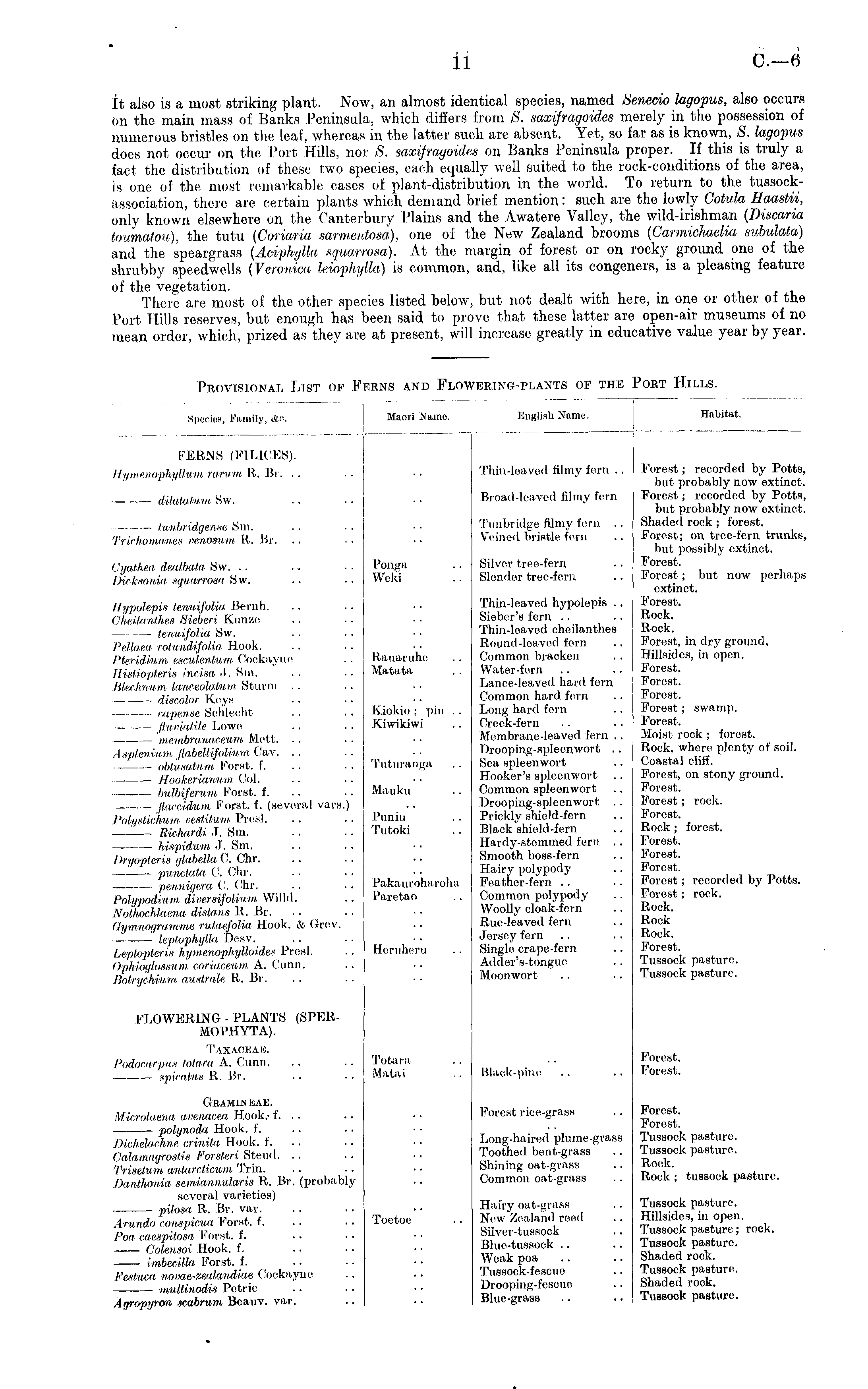 It also is a most striking plant. Now, an almost identical species, named Senecio lagopus, also occurs on the main mass of Banks Peninsula, which differs from S. saxifragoides merely in the possession of numerous bristles on the leaf, whereas in the latter such are absent. Yet, so far as is known, -S. lagopus does not occur on the Port Hills, nor S. saxifragoides on Banks Peninsula proper. If this is truly a fact the distribution of these two species, each equally well suited to the rock-conditions of the area, is one of the most remarkable cases of plant-distribution in the world. To return to the tussockassociation, there are certain plants which demand brief mention: such are the lowly Cotula Haastii, only known elsewhere on the Canterbury Plains and the Awatere Valley, the wild-irishman (Discaria toumatou), the tutu (Coriaria sarmenlosa), one of the New Zealand brooms (Carmichaelia subulala) and the speargrass (Aciphylla squarrosa). At the margin of forest or on rocky ground one of the shrubby speedwells (Veronica leiophylla) is common, and, like all its congeners, is a pleasing feature of the vegetation. There are most of the other species listed below, but not dealt with here, in one or other of the Port Hills reserves, but enough has been said to prove that these latter are open-air museums of no mean order, which, prized as they are at present, will increase greatly in educative value year by year.