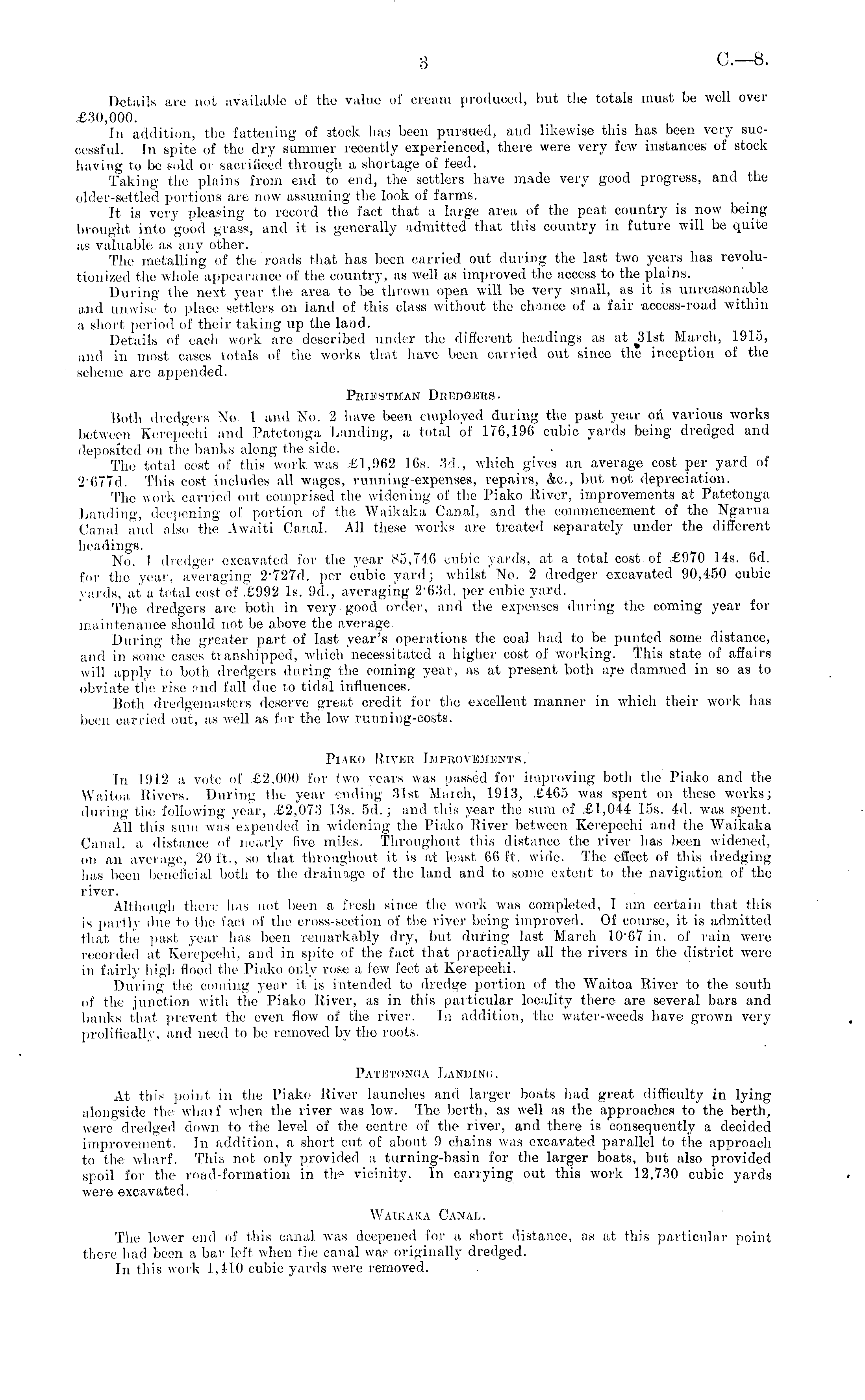 Details are not available of the value of cream produced, but the totals must be well over £30,000. In addition, the rattening of stock has been pursued, and likewise this has been very successful. In spite of the dry summer recently experienced, there were very few instances' of stock having to be sold or sacrificed through, a shortage of feed. Taking the plains from end to end, the settlers have made very good progress, and the older-settled portions are now assuming the look of farms. It is very pleasing to record the fact that a large area of the peat country is now being brought into good grass, and it is generally admitted that this country in future will be quite as valuable as any other. The metalling of the roads that has been carried out during the last two years has revolutionized the whole appearance of the country, as well as improved the access to the plains. During the next year the area to be thrown open will be very small, as it is unreasonable and unwise ti> place settlers on land of this class without the chance of a fair access-road within a short period of their taking up the land. Details of each work are described under the different headings as at % 31st March, 1915, and in must eases totals of the works that have been carried out since the inception of the scheme are appended. I'IiIBSTMAN DI!BDGERS• Both dredgers No I and No. 2 have been employed during the past year on various works between Kerepeehi and Patetonga Landing, a total of 176,196 cubic yards being dredged and deposited "ii the hanks along the side. The total cost oi' this work, was £1,962 16s. 3d., which gives an average cost per yard of 2'677d. This cost includes all wages, running-expenses, repairs, etc., but not depreciation. The work carried out comprised the widening of the Piako River, improvements at Patetonga Landing, deepening of portion of the Waikaka (.'anal, and the commencement of the Ngarua Canal and also the Await i Canal. All these works are treated separately under the different headings. No. I dredger excavated for the year 85,746 cubic yards, at. a total cost of £970 14s. 6(1. for the ye.-v, averaging 2'727i1. per cubic yard; whilst No. 2 dredger excavated 90,4.00 cubic yards, at a total cost of £992 Is. 9d., averaging 2'63d. per cubic yard. The dredgers are both in very good order, and the expenses during the coming year for maintenance should not be above the average. During the greater part of last year's operations (lie coal had to be punted some distance, and in some cases transhipped, which necessitated a higher cost of working. This state of affairs will apply to both dredgers during the coming year, as at present both art; dammed in so as to obviate the rise and fall due to tidal influences. Both dredgeinasters deserve great credit for the excellent manner in which their work has been carried out, as well as fur the low running-costs. PIAKO L'ivki; [mpbovE-lENTS . In 1912 a vote of £2,000 for two years was passed for improving both the Piako and the Waitoa Rivers. During the year ending 31st March, 1913, £465 was spent on these works; during the following year, £2,07.3 13s. sd. ; and this year the sum of £1,044 1.55. _d. was spent. All this sum was expended in widening the Piako River between Kerepeehi and the Waikaka Canal, a distance of nearly five miles. Throughout this distance the river has been widened, on an average, 20 ft., so that throughout it is at least 66 ft. wide. The effect of this dredging has been beneficial both to the drainage of the land and to some, extent, tn the navigation of the river. Although then: has out been a fresh since the work was completed, I am certain that this is partly due to the fact <if the cross-section of the river being improved. Of course, it is admitted that the past year lias been, remarkably dry, but during last March 1067 in. of rain were recorded at. Kerepeehi. and in spite of the fact that practically all the rivers in the district were in fairly high flood the Piako only rose a few feet at Kerepeehi, During the coming year it is intended to dredge portion of the Waitoa River to the south of the junction with, the Piako River, as in this particular locality there are several bars and banks that prevent the even flow of the river. In addition, the water-weeds have grown very prolifically, and need to be removed by the roots. Patetonga Landing. At this point in the Piako River launches and larger boats had great difficulty in lying alongside the wharf when the river was low. The berth, as well as the approaches to the berth, were dredged down to the level of the centre of the river, and there is consequently a decided improvement. In addition, a short cut of about 9 chains was excavated parallel to the approach to the wharf. This not only provided a turning-basin for the larger boats, but also provided spoil for the road-formation in th. vicinity. In carrying out this work 12.730 cubic yards were excavated. Waikaka Canae. The lower end of this canal was deepened for a short distance, as at this particular point there had been a bar left when tiie canal was originally dredged. In this work IJIO cubic yards were removed.