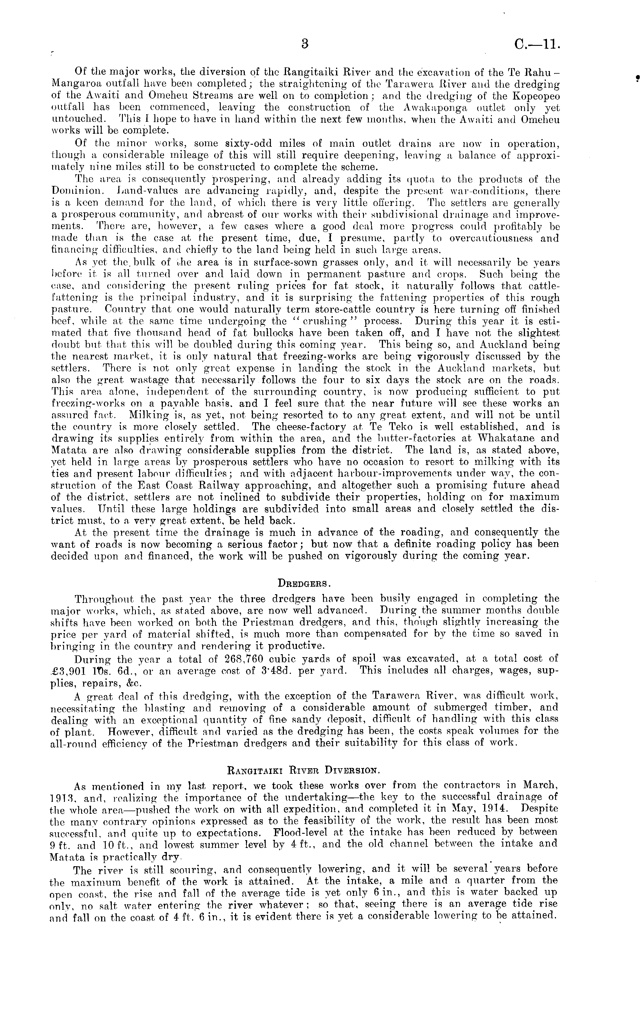 Of the major works, the diversion of the Rangitaiki River and the excavation of the Te RahuMangaroa outfall have been completed; the straightening of the Tarawera River and the dredging of the Awaiti and Omeheu Streams are well on to completion; and the dredging of the Kopeopeo outfall has been commenced, leaving the construction of the Awakaponga outlet, only yet untouched. This I hope to have in hand within the next few months, when the Awaiti and Omeheu works will be complete. Of the minor works, some sixty-odd miles of main outlet drains are now in operation, though a considerable mileage of this will still require deepening, leaving a balance of approximately nine miles still to be constructed to complete the scheme. The area is consequently prospering, and already adding its quota to the products of the Dominion. Land-values are advancing rapidly, and, despite the present war-conditions, there is a keen demand for the land, of which there is very little offering. The settlers are generally a prosperous community, and abreast of our works with their subdivisional drainage and improvements. There are, however, a few cases where a good deal more progress could profitably be made than is the case at the present time, due, I presume, partly to overcautiousness and financing difficulties, and chiefly to the land being held in such large areas. As yet the. bulk of the area is in surface-sown grasses only, and it will necessarily be years before it is all turned over and laid down in permanent pasture and crops. Such being the case, and considering the present ruling prices for fat stock, it naturally follows that cattlefattening is the principal industry, and it is surprising the fattening properties of this rough pasture. Country that one would naturally term store-cattle country is here turning off finished beef, while at the same time undergoing the " crushing " process. During this year it is estimated that five thousand head of fat, bullocks have been taken off, and I have not the slightest doubt but that this will be doubled during this coming year. This being so, and Auckland being the nearest market, it is only natural that freezing-works are being vigorously discussed by the settlers. There is not only great expense in landing the stock in the Auckland markets, but also the great wastage that necessarily follows the four to six days the stock are on the roads. This area alone, independent of the surrounding country, is now producing sufficient to put freezing-works on a payable basis, and I feel sure that the near future will see these works an assured fact. Milking is, as yet, not being- resorted to to any great extent, and will not be until the country is more closely settled. The cheese-factory at Te Teko is well established, and is drawing its supplies entirely from within the area, and the butter-factories at Whakatane and Matata are also drawing considerable supplies from the district. The land is, as stated above, yet held in large areas by prosperous settlers who have no occasion to resort to milking with its ties and present labour difficulties; and with adjacent harbour-improvements under way, the construction of the East Coast Railway approaching, and altogether such a promising future ahead of the district, settlers are not inclined to subdivide their properties, holding on for maximum values. Until these large holdings are subdivided into small areas and closely settled the district must, to a very great extent, be held back. At the present time the drainage is much in advance of the roading, and consequently the want of roads is now becoming a serious factor; but now that a definite roading policy has been decided upon and financed, the work will be pushed on vigorously during the coming year. Dredgers. Throughout the past year the three dredgers have been busily engaged in completing the major works, which, as stated above, are now well advanced. During the summer months double shifts have been worked on both the Priestman dredgers, and this, though slightly increasing the price per yard of material shifted, is much more than compensated for by the time so saved in bringing in the country and rendering it productive. During the year a total of 268,760 cubic yards of spoil was excavated, at a total cost of ,£3,901 lT)s. 6d.,'or an average cost of 3 - 48 d. per yard. This includes all charges, wages, supplies, repairs, &c. A great deal of this dredging, with the exception of the Tarawera, River, was difficult work, necessitating the blasting and removing of a considerable amount of submerged timber, and dealing with an exceptional quantity of fin© sandy deposit, difficult, of handling with this class of plant. However, difficult and varied as the dredging has been, the costs speak volumes for the all-round efficiency of the Priestman dredgers and their suitability for this class of work, Rangitaiki River Diversion. As mentioned in my last report, we took these works over from the contractors in March, 1913, and, realizing the importance of the undertaking—the key to the successful drainage of the whole area —pushed the work on with all expedition, and completed it in May, 1914. Despite the many contrary opinions expressed as to the feasibility of the work, the result has been most successful, and quite up to expectations. Flood-level at the intake has been reduced by between 9 ft. and 10 ft., and lowest summer level by 4 ft., and the old channel between the intake and Matata is practically dry. The river is still, scouring, and consequently lowering, and it will be several years before the maximum benefit of the work is attained. At, the intake, a mile and a quarter from the open coast, the rise and fall of the average tide is yet only 6 in., and this is water backed up only, no salt water entering the river whatever; so that, seeing there is an average tide rise and fall on the coast of 4 ft. 6 in., it is evident, there is yet a considerable lowering to be att