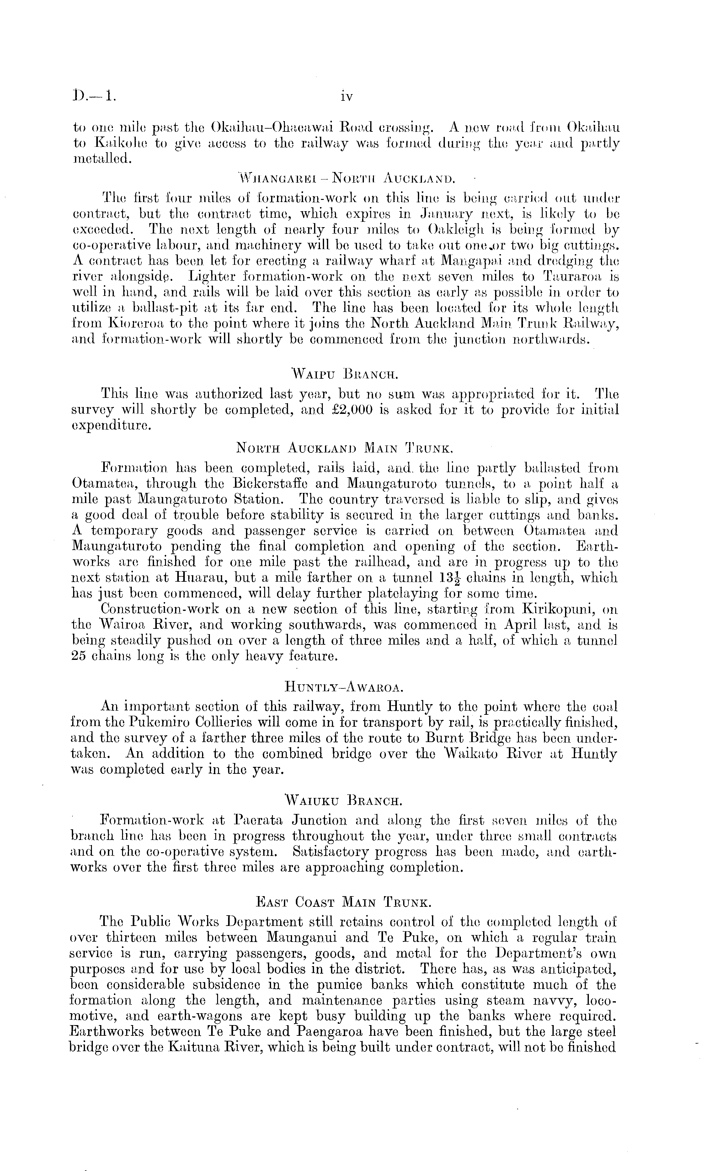to one mile past the Okaihau-Ohaeawai Road crossing. A new road from Okaihau to Kaikohe to give access to the railway was formed during the year and partly metalled. Whangarei - North Auckland. The first four miles of formation-work on this line is being carried out under contract, but the contract time, which expires in January next, is likely to be exceeded. The next length of nearly four miles to Oakleigh is being formed by co-operative labour, and machinery will be used to take out one .or two big cuttings. A contract has been let for erecting a railway wharf at Mangapai and dredging the river alongside. Lighter formation-work on the next seven miles to Tauraroa, is well in hand, and rails will be laid over this section as early as possible in order to utilize a ballast-pit at its far end. The line has been located for its whole length from Kioreroa to the point where it joins the North Auckland Main Trunk Railway, and formation-work will shortly be commenced from the junction northwards. Waipu Branch. This line was authorized last year, but no sum was appropriated for it. The survey will shortly be completed, and £2,000 is asked for it to provide for initial expenditure. North Auckland Main Trunk, Formation has been completed, rails laid, and. the line partly ballasted from Otamatea, through the Bickerstaffe and Maungaturoto tunnels, to a point half a mile past Maungaturoto Station. The country traversed is liable to slip, and gives a good deal of trouble before stability is secured in the larger cuttings and banks. A temporary goods and passenger service is carried on between Otamatea and Maungaturoto pending the final completion and opening of the section. Earthworks are finished for one mile past the railhead, and are in progress up to the next station at Huarau, but a mile farther on a tunnel 13J chains in length, which has just been commenced, will delay further platclaying for some time. Construction-work on a new section of this line, starting from Kirikopuni, on the Wairoa River, and working southwards, was commenced in April last, and is being steadily pushed on over a length of three miles and a half, of which a tunnel 25 chains long is the only heavy feature. HuNTLY-AwAROA. An important section of this railway, from Huntly to the point where the coal from the Pukemiro Collieries will come in for transport by rail, is practically finished, and the survey of a farther three miles of the route to Burnt Bridge has been undertaken. An addition to the combined bridge over the Waikato River at Huntly was completed early in the year. Waiuku Branch. Formation-work at Paerata Junction and along the first seven miles of the branch line has been in progress throughout the year, under three small contracts and on the co-operative system. Satisfactory progress has been made, and earthworks over the first three miles are approaching completion. East Coast Main Trunk. The Public Works Department still retains control of the completed length of over thirteen miles between Maunganui and Te Puke, on which a regular train service is run, carrying passengers, goods, and metal for the Department's own purposes and for use by local bodies in the district. There has, as was anticipated, been considerable subsidence in the pumice banks which constitute much of the formation along the length, and maintenance parties using steam navvy, locomotive, and earth-wagons are kept busy building up the banks where required. Earthworks between Te Puke and Paengaroa have been finished, but the large steel bridge over the Kaituna River, which is being built under contract, will not be finished