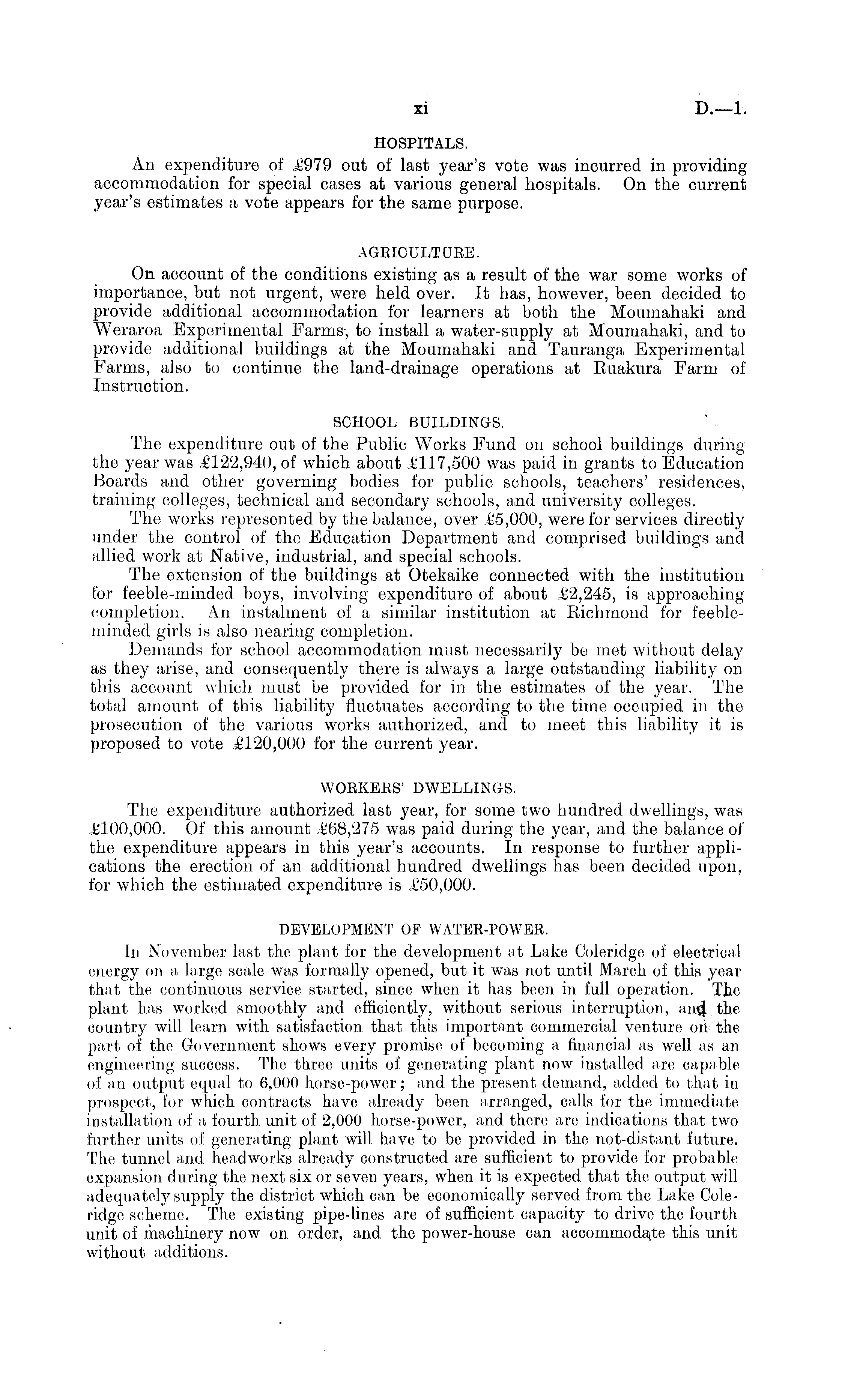 HOSPITALS. An expenditure of £979 out of last year's vote was incurred in providing accommodation for special cases at various general hospitals. On the current year's estimates a vote appears for the same purpose. AGRICULTURE. On account of the conditions existing as a result of the war some works of importance, but not urgent, were held over. It has, however, been decided to provide additional accommodation for learners at both the Moumahaki and Weraroa Experimental Farms-, to install a water-supply at Moumahaki, and to provide additional buildings at the Moumahaki and Tauranga Experimental Farms, also to continue the land-drainage operations at Ruakura Farm of Instruction. SCHOOL BUILDINGS. The expenditure out of the Public Works Fund on school buildings during the year was £122,940, of which about £117,500 was paid in grants to Education Boards and other governing bodies for public schools, teachers' residences, training colleges, technical and secondary schools, and university colleges. The works represented by the balance, over £5,000, were for services directly under the control of the Education Department and comprised buildings and allied work at Native, industrial, and special schools. The extension of the buildings at Otekaike connected with the institution for feeble-minded boys, involving expenditure of about £2,245, is approaching completion. An instalment of a similar institution at Richmond for feebleminded girls is also nearing completion. Demands for school accommodation must necessarily be met without delay as they arise, and consequently there is always a large outstanding liability on this account which must be provided for in the estimates of the year. The total amount of this liability fluctuates according to the time occupied in the prosecution of the various works authorized, and to meet this liability it is proposed to vote £120,000 for the current year. WORKERS' DWELLINGS. The expenditure authorized last year, for some two hundred dwellings, was £100,000. Of this amount £68,275 was paid during the year, and the balance of the expenditure appears in this year's accounts. In response to further applications the erection of an additional hundred dwellings has been decided upon, for which the estimated expenditure is £50,000. DEVELOPMENT OF WATER-POWER. In November last the plant for the development at Lake Coleridge of electrical energy on a large scale was formally opened, but it was not until March of this year that the continuous service started, since when it has been in full operation. The plant has worked smoothly and efficiently, without serious interruption, ant| the country will learn with satisfaction that this important commercial venture on the part of the Government shows every promise of becoming a financial as well as an engineering success. The three units of generating plant now installed are capable of an output equal to 6,000 horse-power; and the present demand, added to that in prospect, for which contracts have already been arranged, calls for the immediate installation of a fourth unit of 2,000 horse-power, and there are indications that two further units of generating plant will have to be provided in the not-distant future. The tunnel and headworks already constructed are sufficient to provide for probable expansion during the next six or seven years, when it is expected that the output will adequately supply the district which can be economically served from the Lake Coleridge scheme. The existing pipe-lines are of sufficient capacity to drive the fourth unit of machinery now on order, and the power-house can accommoda;te this unit without additions.