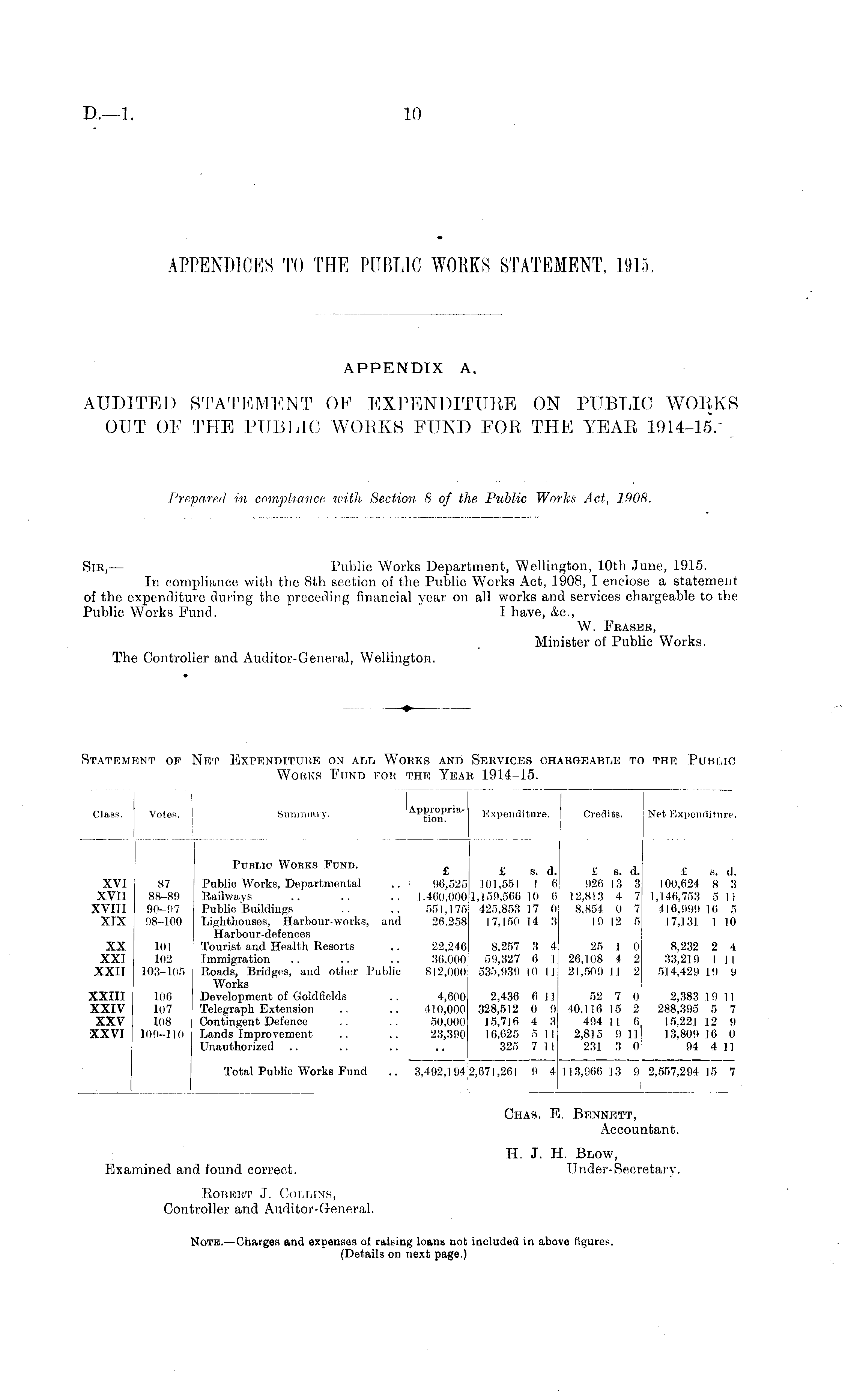 Sir, — Public Works Department, Wellington, 10th June, 1915. In compliance with the Bth section of the Public Works Act, 1908, I enclose a statement of the expenditure during the preceding financial year on all works and services chargeable to the Public Works Fund. I have, &c, W. Eraser, Minister of Public Works. The Controller and Auditor-General, Wellington. • —.»_ _