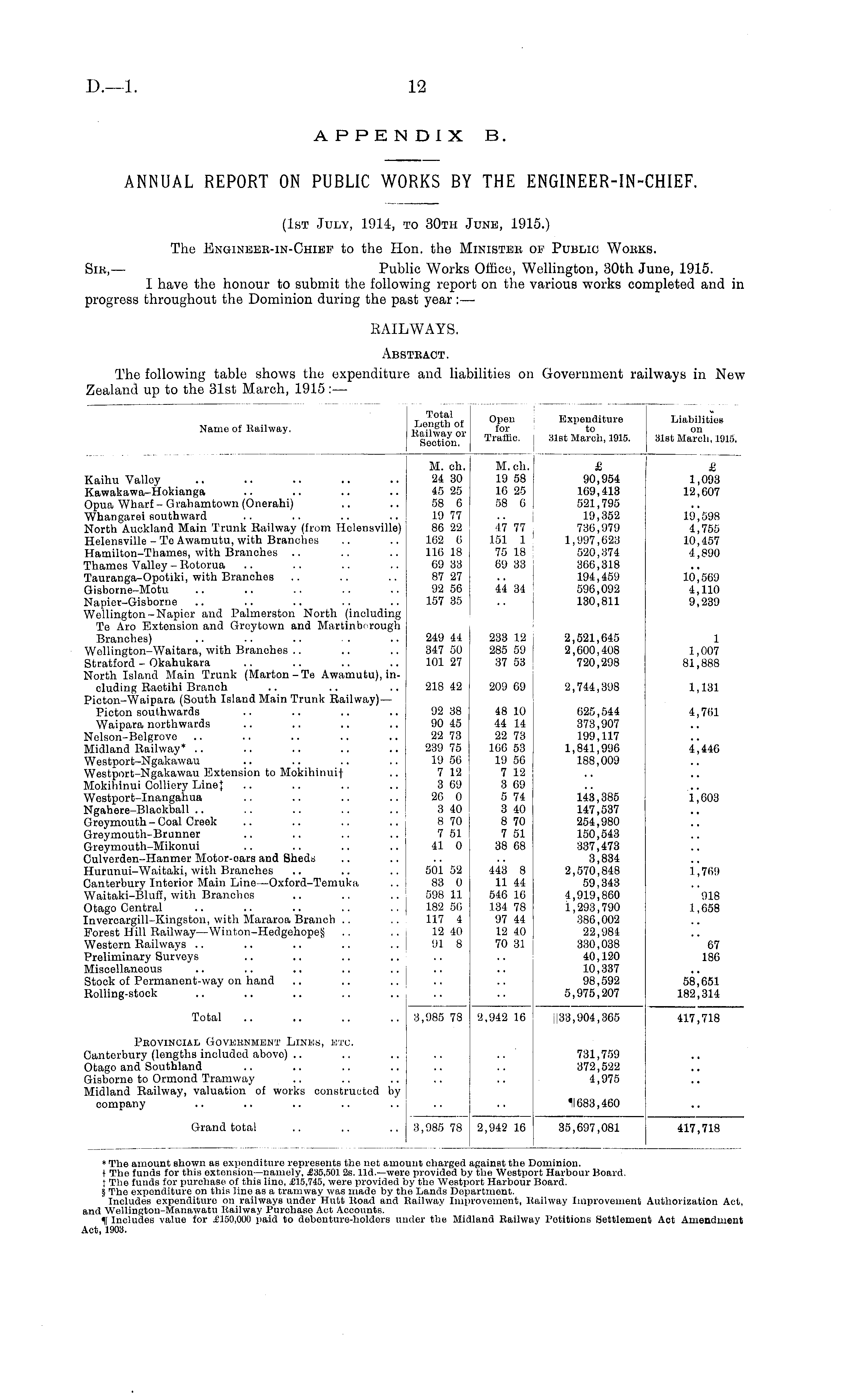 ANNUAL REPORT ON PUBLIC WORKS BY THE ENGINEER-IN-CHIEF. (Ist July, 1914, to 30th June, 1915.) The Bngineer-in-Chiep to the Hon. the Minister of Public Works. Sir,— Public Works Office, Wellington, 30th June, 1915. I have the honour to submit the following report on the various works completed and in progress throughout the Dominion during the past year : — EAILWAYS. Abstract. The following table shows the expenditure and liabilities on Government railways in New Zealand up to the 31st March, 1915: —