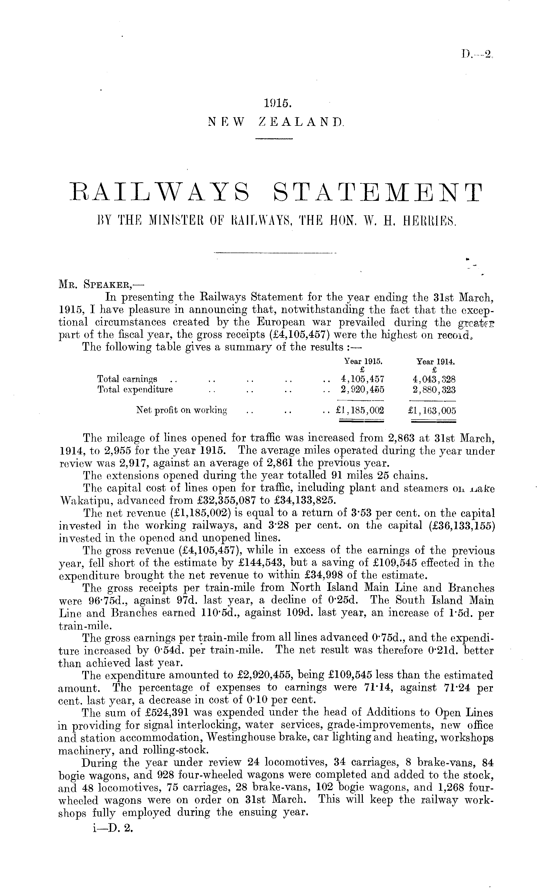 Mr. Speaker,— In presenting the Kailways Statement for the year ending the 31st March, 1915, I have pleasure in announcing that, notwithstanding the fact that the exceptional circumstances created by the European war prevailed during the greatfl part of the fiscal year, the gross receipts (£4,105,457) were the highest on reeoid* The following table gives a summary of the results : — Year 1915. Year 1914. £ £ Total earnings .. .. .. .. .. 4,105,457 4,043,328 Total expenditure .. .. .. .. 2,920,465 2,880,323 Net profit on working .. .. .. £1,185,002 £1,163,005 The mileage of lines opened for traffic was increased from 2,863 at 31st March, 1914, to 2,955 for the year 1915. The average miles operated during the year under review was 2,917, against an average of 2,861 the previous year. The extensions opened during the year totalled 91 miles 25 chains. The capital cost of lines open for traffic, including plant and steamers on Wakatipu, advanced from £32,355,087 to £34,133,825. The net revenue (£1,185,002) is equal to a return of 3-53 per cent, on the capital invested in the working railways, and 328 per cent, on the capital (£36,133,155) invested in the opened and unopened lines. The gross revenue (£4,105,457), while in excess of the earnings of the previous year, fell short of the estimate by £144,543, but a saving of £109,545 effected in the expenditure brought the net revenue to within £34,998 of the estimate. The gross receipts per train-mile from North Island Main Line and Branches were 96 - 75 d., against 97d. last year, a decline of o'2sd. The South Island Main Line and Branches earned 110 - 5 d., against 109 d. last year, an increase of Tsd. per train-mile. The gross earnings per train-mile from all lines advanced 0'75d., and the expenditure increased by o's4d. per train-mile. The net result was therefore 0 - 21 d. better than achieved last year. The expenditure amounted to £2,920,455, being £109,545 less than the estimated amount. The percentage of expenses to earnings were 7D14, against 71*24 per cent, last year, a decrease in cost of 010 per cent. The sum of £524,391 was expended under the head of Additions to Open Lines in providing for signal interlocking, water services, grade-improvements, new office and station accommodation, Westinghouse brake, car lighting and heating, workshops machinery, and rolling-stock. During the year under review 24 locomotives, 34 carriages, 8 brake-vans, 84 bogie wagons, and 928 four-wheeled wagons were completed and added to the stock, and 48 locomotives, 75 carriages, 28 brake-vans, 102 bogie wagons, and 1,268 fourwheeled wagons were on order on 31st March. This will keep the railway workshops fully employed during the ensuing year.