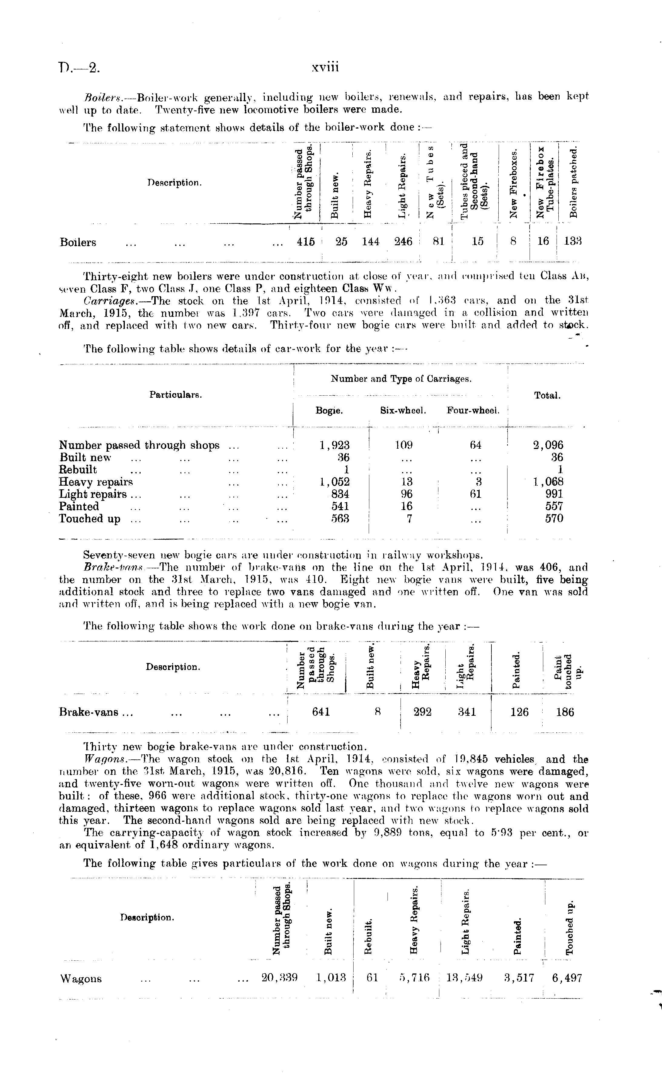 Thirty new bogie brake-vans are under construction. Wagons. —The wagon stock on the Ist. April, 1914, consisted of 19,845 vehicles and the number on the 31st Maroh, 1915, was 20,816. Ten wagons were sold, six wagons were damaged, and twenty-five worn-out wagons were written off. One thousand and twelve new wagons were built: of these, 966 were additional stock, thirty-one wagons to replace the wagons worn out and damaged, thirteen wagons to replace wagons sold last year, and two wagons to replace wagons sold this year. The second-hand wagons sold are being replaced with new stock. The carrying-capacity of wagon stock increased by 9,889 tons, equal to 5*93 per cent., or an equivalent of 1,648 ordinary wagons. The following table gives particulars of the work done on wagons during the year : —
