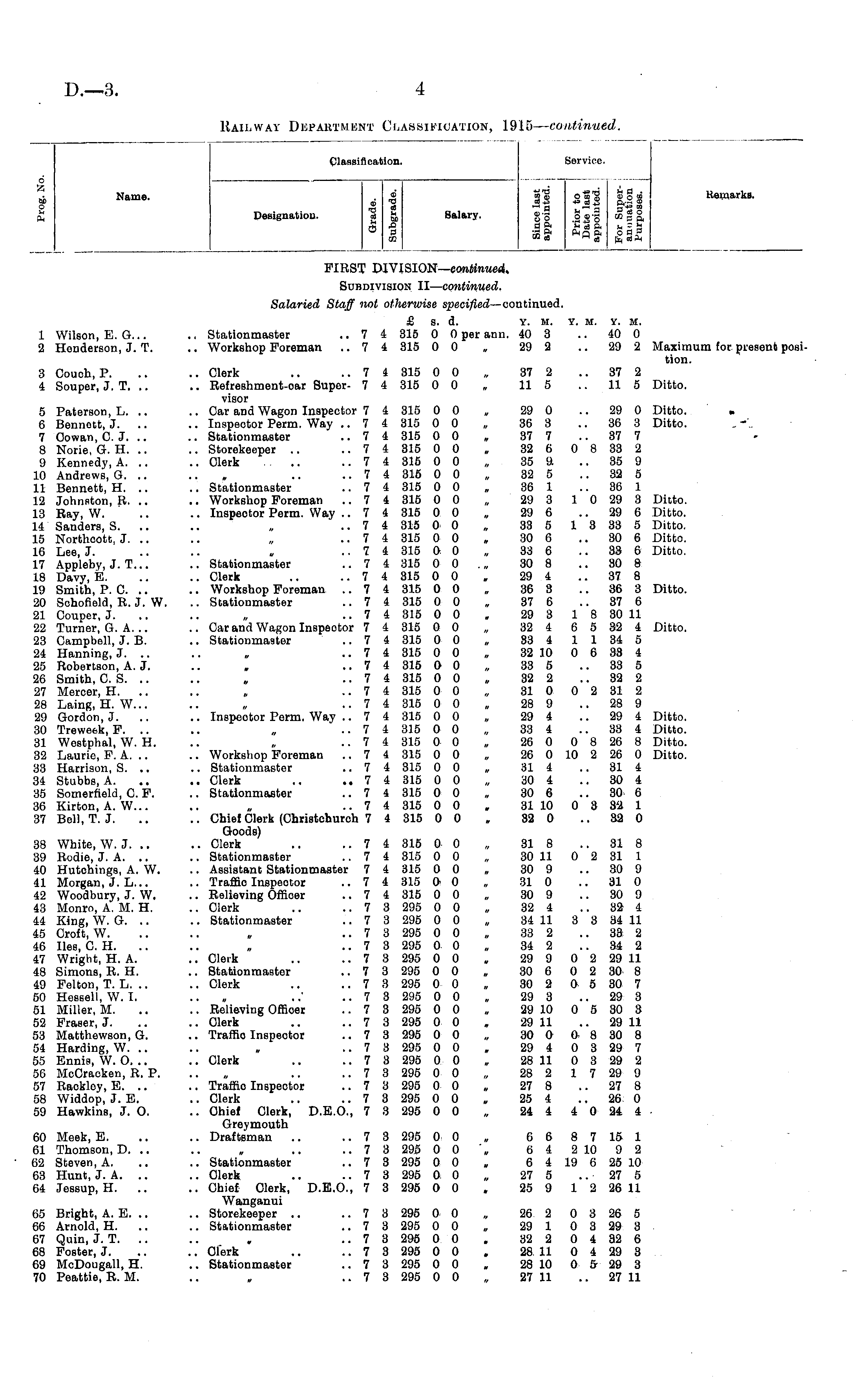 Classification. Service. A Name - 6 % Si 3II III Kemarks. 0 ,1 (j •"-!£,_+? 00 £ Designation. * £5, Salary. ®-g 2 ®'§ t»sa tb'S a ft ? <a ft »h = 53 35 2* Q ft ° 9 •? CO 02 d H c6 pq d Pw FIRST DIVISION —continued. Subdivision II—continued. Salaried Staff not otherwise specified— continued. £ a. d. Y. M. Y. M. Y. M. 1 Wilson, E. G... .. Stationmaster ..7 4 315 0 0 per ann. 40 3 .. 40 0 2 Henderson, J. T. .. Workshop Foreman ..7 4 315 0 0 „ 29 2 29 2 Maximum for present posi tion. 3 Couch, P. .. .. Clerk .. .. 7 4 315 0 0 „ 37 2 .. 37 2 4 Souper, J. T. .. .. Refreshment-oar Super- 7 4 315 0 0 » 11 5 11 5 Ditto. visor 5 Paterson, L. .. .. Car and Wagon Inspector 7 4 315 0 0 „ 29 0 29 0 Ditto. • 6 Bennett, J. .. Inspector Perm. Way .. 7 4 315 0 0 „ 36 3 36 3 Ditto. 7 Cowan, C. J. .. .. Stationmaster ..7 4 315 0 0 „ 37 7 .. 37 7 8 Norie, G. H. .. .. Storekeeper ,, ..7 4 315 00 „ 32 608 33 2 9 Kennedy, A. .. .. Clerk .. ..7 4 315 0 0 „ 35 Si 35 9 10 Andrews, G. .. .. » .. .. 7 4 315 0 0 „ 32 5 .. 32 5 11 Bennett, H. .. .. Stationmaster ..7 4 315 0 0 „ 36 1 36 1 12 Johnston, R. .. .. Workshop Foreman ..7 4 315 0 0 „ 29 3 1 0 29 3 Ditto. 13 Ray, W. .. .. Inspector Perm. Way ..7 4 315 0 0 „ 29 6 29 6 Ditto. 14 Sanders, S. .. .. , .. 7 4 315 0 0 33 5 1 3 33 5 Ditto. 15 Northcott, J. .. .. „ .. 7 4 315 0 0 „ 30 6 .. 30 6 Ditto. 16 Lee, J. .. .. „ .. 7 4 315 0 0 33 6 .. 33 6 Ditto. 17 Appleby, J. T... .. Stationmaster ..7 4 315 0 0 30 8 .. 30 8 18 Davy, E. .. .. Clerk .. .. 7 4 315 0 0 „ 29 4 .. 37 8 19 Smith, P. C. .. .. Workshop Foreman ..7 4 315 0 0 „ 36 3 36 3 Ditto. 20 Schofleld, R. J. W. .. Stationmaster ..7 4 315 0 0 „ 37 6 37 6 21 Couper, J. .. .. „ .. 7 4 315 0 0 29 3 1 8 30 11 22 Turner, G. A. .. .. Car and Wagon Inspector 7 4 315 0 0 „ 32 4 6 5 32 4 Ditto. 23 Campbell, J. B. .. Stationmaster .. 7 4 315 00 „ 33 4 11 34 5 24 Hanning, J. .. .. „ .. 7 4 315 0 0 32 10 0 6 33 4 25 Robortson, A. J. .. „ ..7 4 315 0 0 „ 33 5 33 5 26 Smith, C. S. .. .. „ .. 7 4 315 0 0 „ 32 2 .. 32 2 27 Mercer, H. .. .. , .. 7 4 315 0 0 31 0 0 2 31 2 28 Laing, H. W... .. „ .. 7 4 315 0 0 „ 28 9 .. 28 9 29 Gordon, J. .. .. lnspeotor Porm. Way ..7 4 315 0 0 „ 29 4 29 4 Ditto. 30 Treweek, F. .. .. „ ..7 4 315 0 0 „ 33 4 .. 33 4 Ditto. 31 Wostphal, W. H. .. „ .. 7 4 315 0 0 26 0 0 8 26 8 Ditto. 32 Laurie, F. A. .. .. Workshop Foreman .. 7 4 315 0 0 „ 26 0 10 2 26 0 Ditto. 33 Harrison, S. .. .. Stationmaster .. 7 4 315 0 0 „ 314 ..314 34 Stubbs, A. .. .. Clerk .. .. 7 4 315 0 0 „ 30 4 30 4 35 Somerfield, C. F. .. Stationmaster .. 7 4 315 0 0 „ 30 6 30 6 36 Kirton, A. W... .. „ .. 7 4 315 0 0 31 10 0 3 32 1 37 Bell, T. J. .. .. Chief Clerk (Christchurch 7 4 315 0 0 » 32 0 .. 32 0 Goods) 38 White, W.J. .. .. Clerk .. .. 7 4 315 0 0 „ 31 8 .. 31 8 39 Rodie, J. A. .. .. Stationmaster ..7 4 315 0 0 „ 30 11 0 2 31 1 40 Hutohings, A. W. .. Assistant Stationmaster 7 4 315 0 0 „ 30 9 .. 30 9 41 Morgan, J. L... .. Traffic lnspeotor ..7 4 315 0 0 „ 31 0 31 0 42 Woodbury, J. W. .. Relieving Officer .. 7 4 315 0 0 „ 30 9 30 9 43 Monro, A. M. H. .. Clerk .. .. 7 3 295 0 0 „ .32 4 .. 32 4 44 King, W. G. .. .. Stationmaster .. 7 3 295 0 0 , 34 11 3 3 34 11 45 Croft, W. .. .. „ .. 7 3 295 0 0 33 2 .. 33 2 46 lies, C. H. .. „ .. 7 3 295 0 0 „ 34 2 34 2 47 Wright, H. A. .. Clerk .. .. 7 3 295 0 0 „ 29 9 0 2 29 11 48 Simons, R. H. .. Stationmaster .. 7 3 295 00 , 30 6 02 30 8 49 Felton, T. L. .. .. Clerk .. .. 7 3 295 0 0 , 30 2 0 5 30 7 50 Hessell, W.I. .. , ..' .. 7 3 295 0 0 „ 29 3 .. 29 3 51 Miller, M. .. .. Relieving Officer .. 7 3 295 0 0 „ 29 10 0 5 30 3 52 Fraser, J. .. .. Clerk .. .. 7 3 295 0 0 „ 29 11 .. 29 11 53 Matthewson, G. .. Traffio Inspector ..7 3 295 0 0 „ 30 0 0 8 30 8 54 Harding, W. .. .. . .. 7 3 295 0 0 29 4 0 3 29 7 55 Ennis, W. O. .. .. Clerk .. .. 7 3 295 0 0 „ 28 11 0 3 29 2 56 McCracken, R. P. .. „ .. .. 7 3 295 0 0 „ 28 2 1 7 29 9 57 Raokley, E. .. .. Traffio Inspector .. 7 3 295 0 0 „ 27 8 27 8 58 Widdop, J. E. .. Clerk .. .. 7 3 295 0 0 „ 25 4 .. 26 0 59 Hawkins, J. O. .. Chief Clerk, D.E.O., 7 3 295 0 0 „ 24 4 4 0 24 4 Greymouth 60 Meek, E. .. .. Draftsman .. ..7 3 295 00 „ 6687 15 1 61 Thomson, D. .. .. „ .. .. 7 3 295 0 0 „ 6 4 2 10 9 2 62 Steven, A. .. .. Stationmaster ..7 3 295 0 0 „ 6 4 19 6 25 10 63 Hunt, J. A. .. .. Clerk .. .. 7 3 295 0 0 „ 27 5 .. 27 5 64 Jessup, H. .. .. Chief Clerk, D.E.O., 7 3 295 0 0 . 25 9 1 2 26 11 Wanganui 65 Bright, A. E. .. .. Storekeeper .. ..7 3 295 00 „ 26 2 0 3 26 5 66 Arnold, H. .. .. Stationmaster .. 7 3 295 00 „ 29 1 03 29 3 67 Quin, J. T. .. .. . .. 7 3 295 0 0 32 2 0 4 32 6 68 Foster, J. .. .. Clerk .. .. 7 3 295 0 0 . 28 11 0 4 29 3 69 MoDougall, H. .. Stationmaster .. 7 3 295 0 0 „ 28 10 0 & 29 3 70 Peattie, R. M. .. „ .. 7 3 295 0 0 „ 27 11 .. 27 11