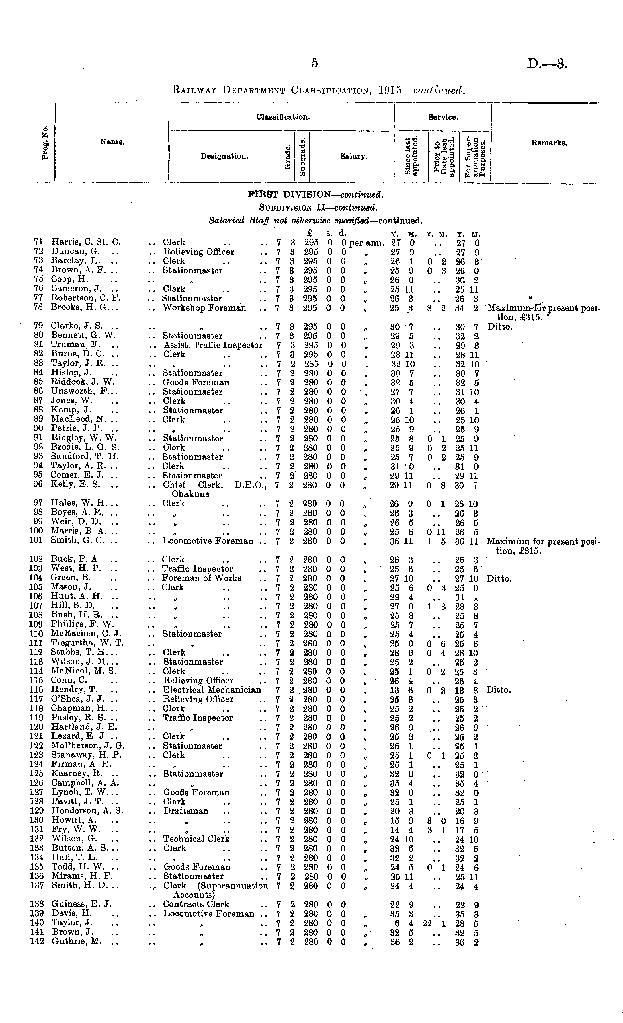 Classification. Service. o 55 • • ti Name. . © o - S r S®§M Remarks. O -2 © £ Designation. g JJ, Salary. g| g®-2 (£j° dft 5 SJ KiqS o«a C/3 m e8 H cs ft, si£4 FIRST DIVISION—continued. Subdivision II—continued. Salaried Staff not otherwise specified—continued. £ 8. d. Y. M. y. M. Y. M. 71 Harris, C. St. C. .. Clerk .. ..7 3 295 0 0 per ann. 27 0 .. 27 0 72 Dunoan, G. .. .. Relieving Officer .. 7 3 295 0 0 „ 27 9 .. 27 9 73 Barclay, L. .. .. Clerk .. .. 7 3 295 0 0 „ 26 1 0 2 26 3 74 Brown, A. F. .. .. Stationmaster ..7 3 295 00 „ 25 9 03 26 0 75 Coop, H. .. .. „ .. 7 3 295 0 0 26 0 .. 30 2 76 Cameron, J. .. .. Clerk .. .. 7 3 295 0 0 „ 25 11 .. 25 11 77 Robertson, C. F. .. Stationmaster ..7 3 295 0 0 „ 26 3 26 3 * 78 Brooks, H. G... .. Workshop Foreman ..7 3 295 0 0 „ 25 3 8 2 34 2 Maximum-for present position, £315. * 79 Clarke, J. S. .. .. „ .. 7 3 295 0 0 „ 30 7 .. 30 7 Ditto. 80 Bennett, G. W. .. Stationmaster .. 7 3 295 0 0 „ 29 5 .. 32 2 81 Truman, F. .. .. Assist. Traffio Inspector 7 3 295 0 0 „ 29 3 29 3 82 Burns, D. C. .. .. Clerk .. .. 7 3 295 0 0 . 28 11 .. 28 11 83 Taylor, J. R. .. .. „ .. .. 7 2 285 0 0 „ 32 10 .. 32 10 84 Hislop, J. .. .. Stationmaster .. 7 2 280 0 0 „ 30 7 30 7 85 Riddock, J. W. .. Goods Foreman ..7 2 280 0 0 » 32 5 32 5 86 Unsworth, F... .. Stationmaster ..7 2 280 0 0 „ 27 7 31 10 87 Jones, W. .. .. Clerk .. .. 7 2 280 0 0 „ 30 4 .. 30 4 88 Kemp, J. .. .. Stationmaster ..7 2 280 0 0 „ 26 1 26 1 89 MacLeod, N. .. .. Clerk .. .. 7 2 280 0 0 „ 25 10 .. 25 10 90 Petrie, J. P. .. .. „ .. .. 7 2 280 0 0 „ 25 9 25 9 91 Ridgley, W. W. .. Stationmaster ..7 2 280 0 0 ' „ 25 8 0 1 25 9 92 Brodie, L. G. S. .. Clerk .. .. 7 2 280 0 0 „ 25 9 0 2 25 11 93 Sandford, T. H. .. Stationmaster .. 7 2 280 0 0 » 25 7 0 2 25 9 94 Taylor, A. R. .. .. Clerk .. .. 7 2 280 0 0 . 31 0 .. 31 0 95 Comer, E. J. .. .. Stationmaster .. 7 2 280 0 0 „ 29 11 .. 29 11 96 Kelly, E. S. .. .. Chief Clerk, D.E.O., 7 2 280 0 0 . 29 11 0 8 30 7 Ohakune 97 Hales, W. H. .. .. Clerk .. .. 7 2 280 0 0 „ ' 26 9 0 1 26 10 98 Boyes, A. E. .. .. „ .. .. 7 2 280 0 0 „ 26 3 26 3 99 Weir, D. D. .. .. „ .. .. 7 2 280 0 0 „ 26 5 .. 26 5 100 Harris, B. A. .. .. , .. .. 7 2 280 0 0 „ 25 6 0 11 26 5 101 Smith, G. C. .. .. Looomotive Foreman ..7 2 280 0 0 „ 36 11 1 5 36 11 Maximum for present position, £315. 102 Buok, P. A. .. .. Clerk .. .. 7 2 280 0 0 „ 26 3 .. 26 3 103 West, H. P. .. .. Traffic Inspector .. 7 2 280 0 0 » 25 6 25 6 104 Green, B. .. .. Foreman of Works ..7 2 280 0 0 „ 27 10 .. 27 10 Ditto. 105 Mason, J. .. .. Clerk .. .. 7 2 280 0 0 „ 25 6 0 3 25 9 106 Hunt, A. H. .. .. „ .. .. 7 2 280 0 0 „ 29 4 31 1 107 Hill, S. D. .. .. „ .. .. 7 2 280 0 0 „ 27 0 1 3 28 3 108 Bush, H. R. .. .. „ .. .. 7 2 280 0 0 „ 25 8 .. 25 8 109 Phillips, F. W. .. „ .. .. 7 2 280 0 0 „ 25 7 25 7 110 MoEachen, C. J. .. Stationmaster ..7 2 280 0 0 „ 25 4 25 4 111 Tregurtha, W. T. .. „ .. 7 2 280 0 0 25 0 0 6 25 6 112 Stubbs, T. H. .. .. Clerk .. .. 7 2 280 0 0 „ 28 6 0 4 28 10 113 Wilson, J. M. .. .. Stationmaster ..7 2 280 0 0 , 25 2 25 2 114 McNiool, M. S. .. Clerk .. .. 7 2 280 0 0 „ 25 1 0 2 25 3 115 Conn, C. .. .. Relieving Officer .. 7 2 280 0 0 „ 26 4 .. 26 4 116 Hendry, T. .. Electrical Mechanician 7 2 280 00 „ 13 6 02 13 8 Ditto. 117 O'Shea, J. J. .. .. Relieving Offioer ..7 2 280 0 0 „ 25 3 25 3 118 Chapman, H... .. Clerk .. ..7 2 280 0 0 „ 25 2 .. 25 2 ' 119 Pasley, R. S. .. .. Traffio Inspector .. 7 2 280 0 0 » 25 2 25 2 120 Hartland, J. E. .. „ .. 7 2 280 0 0 „ 26 9 26 9 121 Lezard, E.J. .. .. Clerk .. .. 7 2 280 0 0 „ 25 2 25 2 122 McPherson, J. G. .. Stationmaster .. 7 2 280 0 0 „ 25 1 25 1 123 Stanaway, H. P. .. Clerk .. .. 7 2 280 0 0 „ 25 1 0 1 25 2 124 Firman, A. E. .. „ .. .. 7 2 280 0 0 „ 25 1 25 1 125 Kearney, R. .. .. Stationmaster .. 7 2 280 0 0 „ 32 0 32 0 126 Campbell, A. A. .. „ .. 7 2 280 0 0 „ 35 4 35 4 127 Lynch, T. W. .. .. Goods Foreman ..7 2 280 0 0 „ 32 0 32 0 128 Pavitt, J. T. .. .. Clork .. .. 7 2 280 0 0 „ 25 1 25 1 129 Henderson, A. S. .. Draftsman .. ..7 2 280 0 0 „ 20 3 20 3 130 Howitt, A. .. .. „ .. .. 7 2 280 0 0 „ 15 9 3 0 16 9 131 Fry, W. W. .. .. „ .. .. 7 2 280 0 0 „ 14 4 3 1 17 5 132 Wilson, G. .. .. Technical Clerk ..7 2 280 0 0 „ 24 10 .. 24 10 133 Button, A. S. .. .. Clerk .. .. 7 2 280 0 0 „ 32 6 32 6 134 Hall, T. L. .. .. „ .. .. 7 2 280 0 0 32 2 32 2 135 Todd, H. W. .. .. Goods Foreman .. 7 2 280 0 0 „ 24 5 0 1 24 6 136 Mirams, H. F. .. Stationmaster ..7 2 280 0 0 „ 25 11 ..25 11 137 Smith, H. D. .. ... Clerk (Superannuation 7 2 280 0 0 „ 24 4 24 4 Accounts) 138 Guiness, E.J. .. Contraots Clerk .. 7 2 280 0 0 22 9 22 9 139 Davis, H. .. .. Looomotive Foreman .. 7 2 280 0 0 „ 35 3 35 3 140 Taylor, J. .. .. „ .. 7 2 280 0 0 „ 6 4 22 1 28 5 141 Brown, J. .. .. „ .. 7 2 280 0 0 „ 32 5 .. 32 5 142 Guthrie, M. .. .. „ .. 7 2 280 0 0 „ 36 2 36 2
