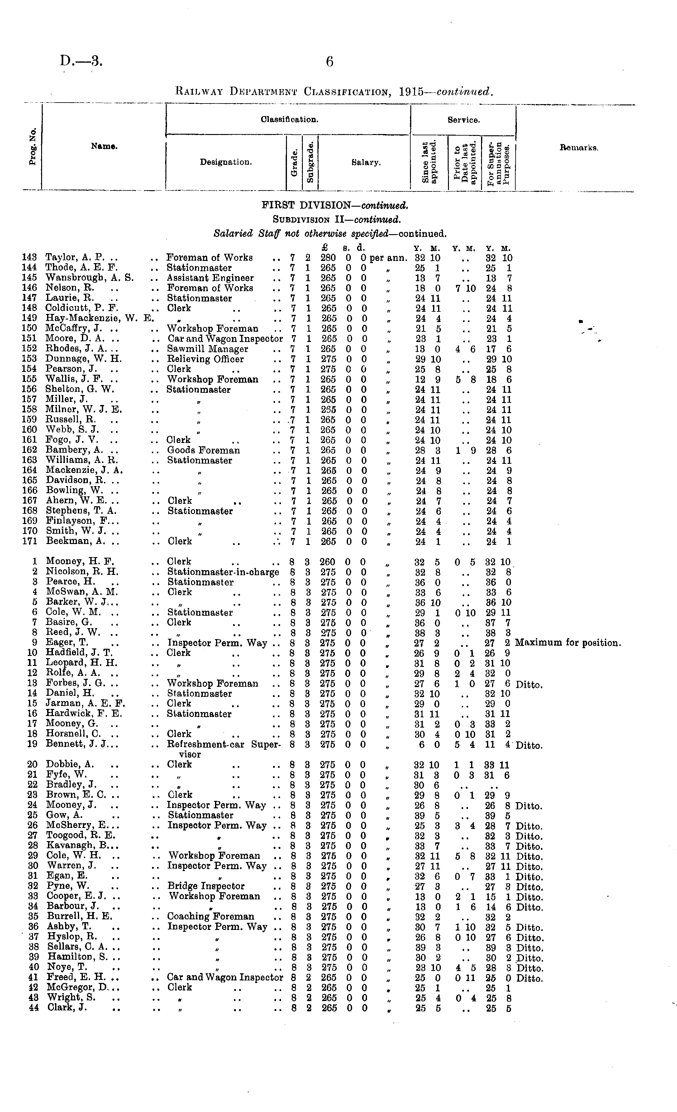 Classification. Service. o £ . . m Name. . ,§ Remarks. 0 aj .5 " J Cd »-J 2,'XH £ Designation. g ft Salary. g| g«| »'f ° ® 1 It Sga s§ = ux t" ea w oJ £< CCPH FIRST DIVISION—continued. Subdivision II—continued. Salaried Staff not otherwise specified—continued. £ s. d. y. M. y. M. Y. M. 143 Taylor, A. P. .. .. Foreman of Works ..72 280 0 0 per ann. 32 10 .. 32 10 144 Thode, A. E. F. .. Stationmaster .. 7 1 265 0 0 „ 25 1 .. 25 1 145 Wansbrougb, A. S. .. Assistant Engineer ..7 1 265 0 0 „ 13 7 13 7 146 Nelson, R. .. .. Foreman of Works .. 7 1 265 0 0 „ 18 0 7 10 24 8 147 Laurie, R. .. .. Stationmaster .. 7 1 265 0 0 „ 24 11 24 11 148 Coldioutt, P. F. .. Clerk .. .. 7 1 265 0 0 „ 24 11 .. 24 11 149 Hay-Mackonzie, W. E. „ .. ..7 1 265 0 0 „ 24 4 .. 24 4 „ 150 McCaffry, J. .. .. Workshop Foreman .. 7 1 265 0 0 „ 21 5 21 5 151 Moore, D. A. .. .. Car and Wagon Inspector 7 1 265 0 0 „ 23 1 .. 23 1 152 Rhodes, J. A. .. .. Sawmill Manager ..7 1 265 0 0 „ 13 0 4 6 17 6 153 Dunnage, W. H. .. Relieving Officer .. 7 1 275 0 0 „ 29 10 29 10 154 Pearson, J. .. .. Clerk .. .. 7 1 275 0 0 „ 25 8 25 8 155 Wallis, j. F. .. .. Workshop Foreman .. 7 1 265 0 0 „ 12 9 5 8 18 6 156 Shelton, G. W. .. Stationmaster ..7 1 265 0 0 „ 24 11 ..24 11 157 Miller, J. .. .. , .. 7 1 265 0 0 „ 24 11 24 11 158 Milner, W. J. E. .. „ .. 7 1 265 0 0 „ 24 11 .. 24 11 159 Russell, R. .. .. „ .. ,7 1 265 0 0 „ 24 11 24 11 160 Webb, S. J. .. .. „ .. 7 1 265 0 0 „ 24 10 24 10 161 Fogo, J. V. .. .. Clerk .. .. 7 1 265 0 0 „ 24 10 .. 24 10 162 Bambery, A. .. .. Goods Foreman ..7 1 265 00 „ 28 3 19 28 6 163 Williams, A. R. .. Stationmaster .. 7 1 265 0 0 „ 24 11 24 11 164 Mackenzie, J. A. .. „ .. 7 1 265 0 0 „ 24 9 24 9 165 Davidson, R. .. .. „ .. 7 1 265 0 0 „ 24 8 .. 24 8 166 Bowling, W. .. .. „ .. 7 1 265 0 0 „ 24 8 24 8 167 Ahem, W. E. .. .. Clerk .. .. 7 1 265 0 0 „ 24 7 .. 24 7 168 Stephens, T. A. .. Stationmaster .. 7 1 265 0 0 „ 24 6 24 6 169 Finlayson, F... .. „ .. 7 1 265 0 0 „ 24 4 24 4 170 Smith, W.J... .. „ .. 7 1 265 0 0 „ 24 4 24 4 171 Beekman, A. .. .. Clerk .. 7 1 265 0 0 „ 24 1 24 1 1 Mooney, H. F. .. Clerk .. .. 8 3 260 0 0 , 32 5 0 5 32 10 2 Nicolson, R. H. .. Stationmaster-in-oharge 8 3 275 0 0 „ 32 8 32 8 3 Pearce, H. .. .. Stationmaster ..8 3 275 0 0 „ 36 0 36 0 4 McSwan, A. M. .. Clerk .. .. 8 3 275 0 0 „ 33 6 .. 33 6 5 Barker, W. J... .. „ .. .. 8 3 275 0 0 „ 36 10 ..36 10 6 Cole, W. M. .. .. Stationmaster .. 8 3 275 0 0 „ 29 1 0 10 29 11 7 Basire, G. .. .. Clerk .. .. 8 3 275 0 0 „ 36 0 .. 37 7 8 Reed, J. W. .. .. .. .. 8 3 275 0 0 38 3 .. 38 3 9 Eager, T. .. .. Inspeotor Perm. Way ..8 3 275 0 0 „ 27 2 27 2 Maximum for position. 10 Hadfield, J. T. .. Clerk .. .. 8 3 275 0 0 „ 26 9 0 1 26 9 11 Leopard, H. H. .. , .. .. 8 3 275 0 0 , 31 8 0 2 31 10 12 Rolfe, A. A. .. .. „ .. .. 8 3 275 0 0 „ 29 8 2 4 32 0 13 Forbes, J. G. .. .. Workshop Foreman ..8 3 275 0 0 „ 27 6 1 0 27 6 Ditto. 14 Daniel, H. .. .. Stationmaster ..8 3 275 0 0 „ 32 10 .. 32 10 15 Jarman, A. E. F. .. Clerk .. .. 8 3 275 0 0 „ 29 0 .. 29 0 16 Hardwick, F. E. .. Stationmaster ..8 3 275 0 0 „ 31 11 31 11 17 Mooney, G. .. .. „ .. 8 3 275 0 0 „ 31 2 0 3 33 2 18 Horsnell, C. .. .. Clerk .. .. 8 3 275 0 0 „ 30 4 0 10 31 2 19 Bennett, J. J... .. RefreBhment-car Super- 8 3 275 00 „ 6054 11 4 Ditto. visor 20 Dobbie, A. .. .. Clerk .. .. 8 3 275 0 0 „ 32 10 1 1 33 11 21 Fyfe, W. .. .. „ .. .. 8 3 275 0 0 » 31 3 0 3 31 6 22 Bradley, J. .. .. „ .. .. 8 3 275 0 0 „ 30 6 23 Brown, E. C. .. .. Clerk .. .. 8 3 275 0 0 „ 29 8 0 1 29 9 24 Mooney, J. .. .. Inspector Perm. Way ..8 3 275 0 0 „ 26 8 26 8 Ditto. 25 Gow, A. .. .. Stationmaster ..8 3 275 0 0 „ 39 5 39 5 26 McSherry, E... .. Inspeotor Perm. Way ..8 3 275 0 0 „ 25 3 3 4 28 7 Ditto. 27 Toogood, R. E. .. „ .. 8 3 275 0 0 32 3 .. 32 3 Ditto. 28 Kavanagh, B... .. „ .. 8 3 275 0 0 33 7 ..33 7 Ditto. 29 Cole, W. H. .. .. Workshop Foreman ..8 3 275 0 0 „ 32 11 5 8 32 11 Ditto. 30 Warren, J. .. .. Inspeotor Perm. Way ..8 3 275 0 0 „ 27 11 .. 27 11 Ditto. 31 Egan, E. .. .. „ .. 8 3 275 0 0 32 6 0 7 33 1 Ditto. 32 Pyne, W. .. .. Bridge Inspector ..8 3 275 0 0 „ 27 3 27 3 Ditto. 33 Cooper, E. J. .. .. Workshop Foreman ..8 3 275 00 „ 13 0 21 15 1 Ditto. 34 Barbour, J. .. .. , .. 8 3 275 0 0 13 0 1 6 14 6 Ditto. 35 Burrell, H. E. .. Coaching Foreman ..8 3 275 0 0 „ 32 2 32 2 36 Ashby, T. .. .. Inspector Perm. Way ..8 3 275 0 0 „ 30 7 1 10 32 5 Ditto. 37 Hyslop, R. .. .. „ .. 8 3 275 0 0 26 8 0 10 27 6 Ditto. 38 Sellars, C. A. .. .. „ .. 8 3 275 0 0 „ 39 3 39 3 Ditto. 39 Hamilton, S. .. .. „ .. 8 3 275 0 0 30 2 ..30 2 Ditto. 40 Noye, T. .. .. „ .. 8 3 275 0 0 23 10 4 5 28 3 Ditto. 41 Freed, E. H. .. .. Car and Wagon Inspector 8 2 265 0 0 „ 25 0 0 11 25 0 Ditto. 42 McGregor, D... .. Clerk .. .. 8 2 265 0 0 . 25 1 .. 25 1 43 Wright, S. .. „ .. .. 8 2 265 0 0 25 4 0 4 25 8 44 Clark, J. .. .. „ .. .. 8 2 265 0 0 „ 25 5 .. 25 5