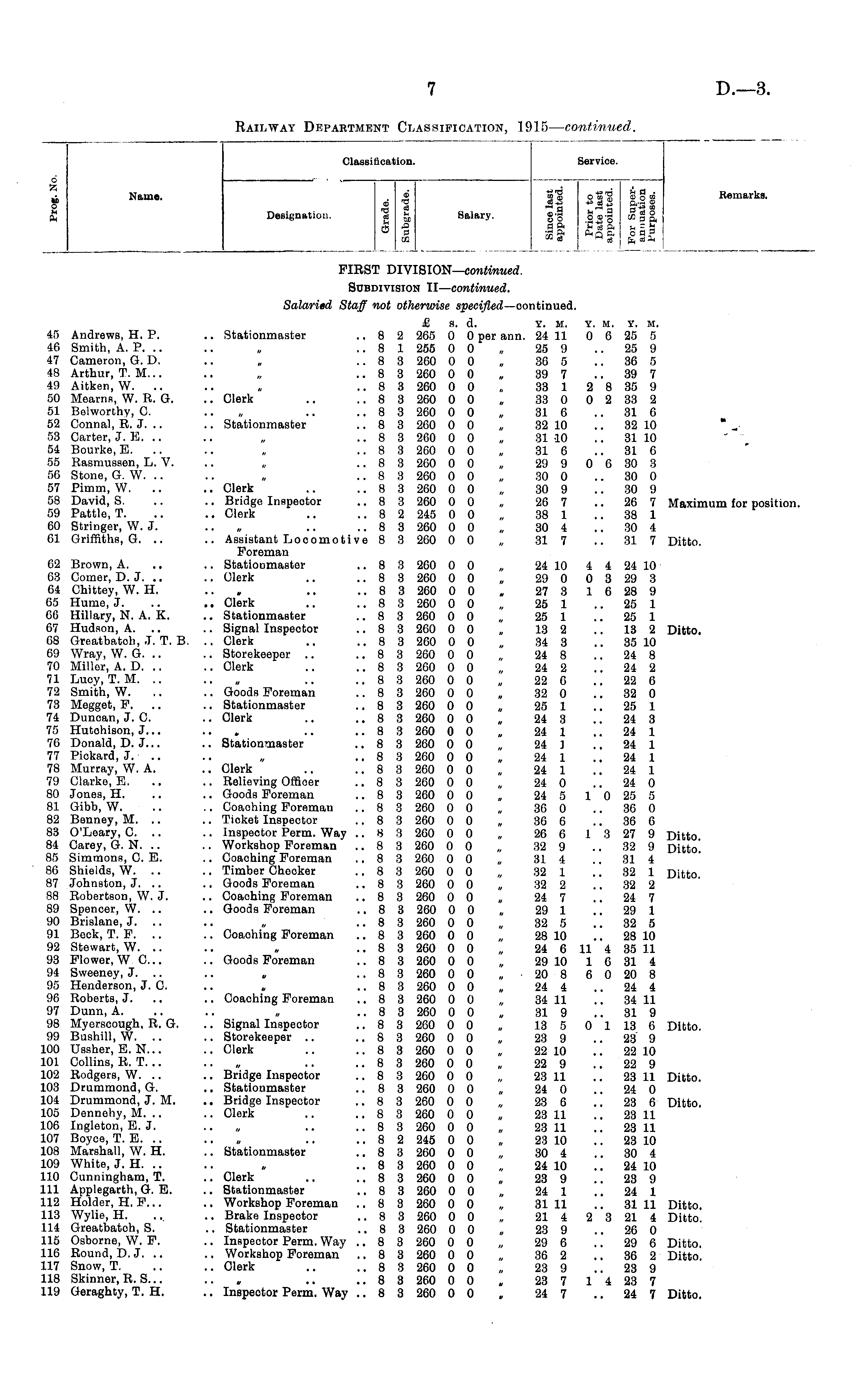 Classification. Service. o «- ■ Name. . ® §0 Remarks. o ® 1 .3-a WS £ Designation. a 51 Salary. g-g g o-g ce g g, s ■§ || 2/sa gas cc yj M ce «J3H FIRST DIVISION—continued. Subdivision II—continued. Salaried Staff not otherwise specified—continued. £ s. d. Y. M. Y. M. Y. M. 45 Andrews, H. P. .. Stationmaster ..8 2 265 0 0 per ann. 24 11 0 6 25 5 46 Smith, A. P. .. .. „ .. 8 1 255 0 0 „ 25 9 .. 25 9 47 Cameron, G. D. .. „ .. 8 3 260 0 0 „ 36 5 36 5 48 Arthur, T. M... .. „ .. 8 3 260 0 0 „ 39 7 39 7 49 Aitken, W. .. .. „ .. 8 3 260 0 0 33 1 2 8 35 9 50 Mearns, W. R. G. .. Clerk .. .. 8 3 260 0 0 „ 33 0 0 2 33 2 51 Belworthy, C. „ .. ..8 3 260 0 0 „ 316 31 6 52 Connal, R. J. .. .. Stationmaster ..8 3 260 0 0 „ 32 10 32 10 53 Carter, J. E. .. .. „ .. 8 3 260 0 0 31 10 .. 31 10 54 Bourke, E. .. .. „ .. 8 3 260 0 0 „ 31 6 31 6 55 Rasmussen, L. V. .. „ ..8 3 260 0 0 „ 29 9 0 6 30 3 56 Stone, G. W. .. .. „ .. 8 3 260 0 0 „ 30 0 .. 30 0 57 Pimm, W. .. .. Clerk .. .. 8 3 260 0 0 „ 30 9 .. 30 9 58 David, S. .. .. Bridge Inspeotor .. 8 3 260 0 0 „ 26 7 .. 26 7 Maximum for position. 59 Pattle, T. .. .. Clerk .. .. 8 2 245 0 0 „ 38 1 .. 38 1 60 Stringer, W. J. .. „ .. .. 8 3 260 0 0 30 4 .. 30 4 61 Griffiths, G. .. .. Assistant Loc omoti ve 8 3 260 0 0 „ 31 7 31 7 Ditto. Foreman 62 Brown, A. .. .. Stationmaster ..8 3 260 0 0 „ 24 10 4 4 24 10 63 Comer, D.J... .. Clerk .. .. 8 3 260 0 0 „ 29 0 0 3 29 3 64 Chittey, W. H. .. „ .. .. 8 3 260 0 0 . 27 3 1 6 28 9 65 Hume, J. .. .. Clerk .. ..8 3 260 0 0 „ 25 1 25 1 66 Hillary, N. A. K. .. Stationmaster ..8 3 260 0 0 „ 25 1 25 1 67 Hudson, A. .. .. Signal Inspector ..8 3 260 0 0 „ 13 2 13 2 Ditto. 68 Greatbatoh, J. T. B. .. Clerk .. ..8 3 260 0 0 „ 34 3 35 10 69 Wray, W. G. .. .. Storekeeper .. ..8 3 260 0 0 „ 24 8 24 8 70 Miller, A. D. .. .. Clerk .. .. 8 3 260 0 0 „ 24 2 ..24 2 71 Lucy, T. M. .. .. .. .. 8 3 260 0 0 22 6 .. 22 6 72 Smith, W. ,. .. Goods Foreman ..8 3 260 0 0 „ 32 0 32 0 73 Megget, F. .. Stationmaster ..8 3 260 0 0 „ 25 1 25 1 74 Duncan, J. C. .. Clerk .. .. 8 3 260 0 0 „ 24 3 24 3 75 Hutohison, J... .. „ .. ..8 3 260 0 0 „ 24 1 24 1 76 Donald, D. J... .. Stationmaster .. 8 3 260 0 0 „ 24 1 24 1 77 Pickard, J. .. „ .. 8 3 260 0 0 24 1 24 1 78 Murray, W. A. .. Clerk .. .. 8 3 260 0 0 „ 24 1 .. 24 1 79 Clarke, E. .. .. Relieving Officer .. 8 3 260 0 0 „ 24 0 24 0 80 Jones, H. .. .. Goods Foreman ..8 3 260 00 „ 24 5 10 25 5 81 Gibb, W. .. .. Coaohing Foreman ..8 3 260 0 0 „ 36 0 36 0 82 Benney, M. .. .. Tioket Inspector ..8 3 260 0 0 „ 36 6 36 6 83 O'Leary, C. .. .. Inspector Perm. Way ..8 3 260 0 0 „ 26 6 1 3 27 9 Ditto. 84 Carey, G. N. .. .. Workshop Foreman .. 8 3 260 0 0 „ 32 9 32 9 Ditto! 85 Simmons, C. E. .. Coaching Foreman ..8 3 260 0 0 „ 31 4 31 4 86 Shields, W. .. .. Timber Checker ..8 3 260 0 0 „ 32 1 32 1 Ditto. 87 Johnston, J. .. .. Goods Foreman ..8 3 260 0 0,, 32 2 32 2 88 Robertson, W. J. .. Coaching Foreman ..8 3 260 0 0 „ 24 7 24 7 89 Spencer, W. .. .. Goods Foreman ..8 3 260 0 0 „ 29 1 29 1 90 Brislane, J. .. .. „ .. 8 3 260 0 0 „ 32 5 32 5 91 Beck, T. F. .. .. Coaohing Foreman ..8 3 260 0 0 „ 28 10 28 10 92 Stewart, W. .. .. „ .. 8 3 260 0 0 24 6 11 4 35 11 93 Flower, W C... .. Goods Foreman ..8 3 260 0 0 „ 29 10 1 6 31 4 94 Sweeney, J. .. .. „ .. 8 3 260 0 0 „ ■ 20 8 6 0 20 8 95 Henderson, J. C. .. „ .. 8 3 260 0 0 „ 24 4 24 4 96 Roberts, J. .. .. Coaching Foreman ..8 3 260 0 0 „ 34 11 34 11 97 Dunn, A. .. .. „ .. 8 3 260 0 0 „ 31 9 .. 31 9 98 Myerscough, R. G. .. Signal Inspector .. 8 3 260 0 0 „ 13 5 0 1 13 6 Ditto. 99 Bushill, W. .. .. Storekeeper .. ..8 3 260 0 0 „ 23 9 .. 23 9 100 Ussher, E. N... .. Clerk .. .. 8 3 260 0 0 „ 22 10 .. 22 10 101 Collins, R. T. .. .. „ .. .. 8 3 260 0 0 „ 22 9 .. 22 9 102 Rodgers, W. .. .. Bridge Inspector .. 8 3 260 0 0 „ 23 11 .. 23 11 Ditto. 103 Drummond, G. .. Stationmaster ..8 3 260 0 0 „ 24 0 24 0 104 Drummond, J. M. .. Bridge Inspeotor .. 8 3 260 0 0 „ 23 6 .. 23 6 Ditto, 105 Dennehy, M. .. .. Clerk .. .. 8 3 260 0 0 „ 23 11 .. 23 11 106 Ingleton, E. J. .. „ .. .. 8 3 260 0 0 „ 23 11 .. 23 11 107 Boyce, T. E. .. .. „ .. .. 8 2 245 0 0 „ 23 10 ..23 10 108 Marshall, W. H. .. Stationmaster ..8 3 260 0 0 „ 30 4 30 4 109 White, J. H. .. .. „ .. 8 3 260 0 0 „ 24 10 24 10 110 Cunningham, T. .. Clerk .. .. 8 3 260 0 0 „ 23 9 .. 23 9 111 Applegarth, G. E. .. Stationmaster ..8 3 260 0 0 „ 24 1 24 1 112 Holder, H. F... .. Workshop Foreman .. 8 3 260 0 0 „ 3111 .. 3111 Ditto. 113 Wylie, H. ... .. Brake Inspeotor ..8 3 260 0 0 „ 21 4 2 3 21 4 Ditto. 114 Greatbatoh, S. .. Stationmaster ..8 3 260 0 0 „ 23 9 26 0 115 Osborne, W. F. .. Inspector Perm. Way .. 8 3 260 0 0 „ 29 6 .. 29 6 Ditto. 116 Round, D.J... .. Workshop Foreman' .. 8 3 260 0 0 „ 36 2 .. 36 2 Ditto. 117 Snow, T. .. .. Clerk .. .. 8 3 260 0 0 „ 23 9 .. 23 9 118 Skinner, R. S... .. „ .. .. 8 3 260 0 0 „ 23 7 1 4 23 7 119 Geraghty, T. H. .. Inspector Perm. Way .. 8 3 260 0 0 „ 24 7 .. 24 7 Ditto.