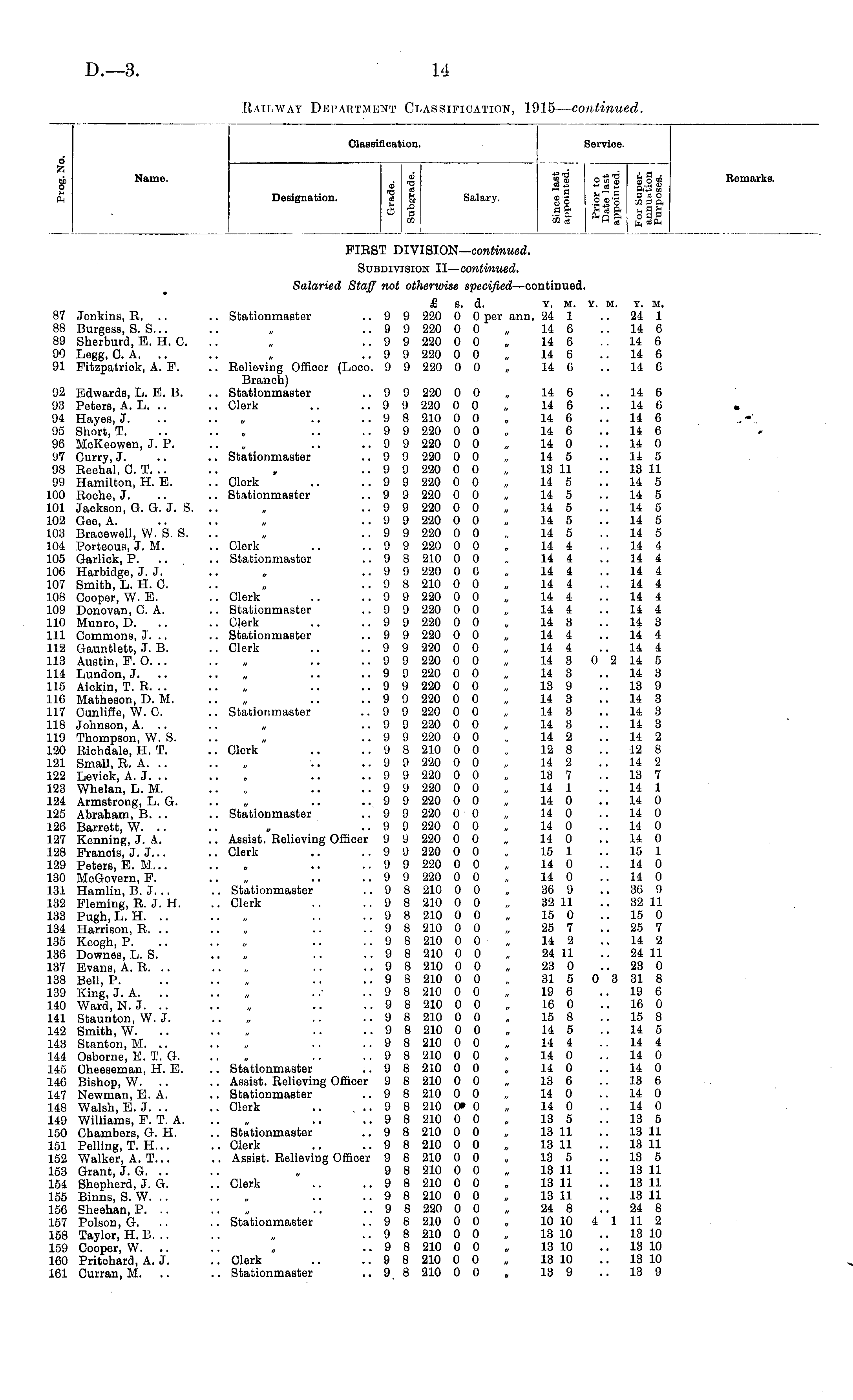 Classification. Service. o fc . • I . a ti Name. . ® Jo® Remarks. 2 r§ «a -S D-i Designation. a & Salary. © 5 o <d •§ 33 § 5 s .SSSIftgdP (E EE 3 FIRST DIVISION —continued. Subdivision II—continued. Salaried Staff not otherwise specified—continued. £ a. d. Y. M. Y. M. Y. M. 87 Jenkins, R. .. Stationmaster ..9 9 220 0 0 per ann. 24 1 .. 24 1 88 Burgess, S. S... .. „ .. 9 9 220 0 0 „ 14 6 ..146 89 Sherburd, E. H. 0. .. „ .. 9 9 220 0 0 . 14 6 .. 14 6 90 Legg, 0. A. .. .. „ .. 9 9 220 0 0 , 14 6 .. 14 6 91 Fitzpatriok, A. P. .. Believing Officer (Loco. 9 9 220 0 0 „ 14 6 14 6 Branch) 92 Edwards, L. E. B. .. Stationmaster ..9 9 220 0 0 „ 14 6 14 6 93 Peters, A. L. .. .. Clerk .. ..9 9 220 0 0 „ 14 6 14 6 • 94 Hayes, J. .. „ .. .. 9 8 210 0 0 „ 14 G .. 14 6 95 Short, T. .. .. „ .. .. 9 9 220 0 0 14 6 .. 14 0 96 McKeowen, J. P. .. .. .. 9 9 220 0 0 14 0 .. 14 0 97 Curry, J. .. .. Stationmaster ..9 9 220 0 0 „ 145 14 5 98 Reehal, C. T. .. .. , .. 9 9 220 0 0 „ 13 11 ..13 11 99 Hamilton, H. E. .. Clerk .. .. 9 9 220 0 0 „ 14 5 14 5 100 Roche, J. .. .. Stationmaster ..9 9 220 0 0 „ 14 5 .. 14 5 101 Jackson, G. G. J. S. .. , .. 9 9 220 0 0 „ 14 5 14 5 102 Gee, A. .. .. „ .. 9 9 220 0 0 14 5 .. 14 5 103 Bracewell, W. S. S. .. „ .. 9 9 220 0 0 „ 14 5 .. 14 5 104 Porteous, J. M. .. Clerk .. ..9 9 220 0 0 „ 14 4 14 4 105 Garlick, P. .. .. Stationmaster ..9 8 210 0 0 „ 14 4 14 4 106 Harbidge, J. J. .. „ .. 9 9 220 0 0 14 4 .. 14 4 107 Smith, L. H. C. .. „ .. 9 8 210 0 0 „ 14 4 14 4 108 Coopor, W. E. .. Clerk .. .. 9 9 220 0 0 „ 14 4 .. 14 4 109 Donovan, C. A. .. Stationmaster ..9 9 220 0 0 „ 14 4 14 4 110 Munro, D. .. .. Clerk .. .. 9 9 220 0 0 „ 14 3 .. 14 3 111 Commons, J. .. .. Stationmaster .. 9 9 220 0 0 „ 14 4 14 4 112 Gauntlett, J. B. .. Clerk .. .. 9 9 220 0 0 „ 14 4 .. 14 4 113 Austin, F. O. .. .. „ .. .. 9 9 220 0 0 „ 14 3 0 2 14 5 114 Lundon, J. .. .. „ .. .. 9 9 220 0 0 „ 14 3 .. 14 3 115 Aiokin, T. R. .. .. „ .. .. 9 9 220 0 0 „ 13 9 13 9 116 Matbeson, D. M. .. „ .. .. 9 9 220 0 0 „ 14 3 14 3 117 Cunliffe, W. C. .. Stationmaster .. 9 9 220 0 0 „ 14 3 .. 14 3 118 Johnson, A. .. „ ..9 9 220 0 0 „ 14 3 ..143 119 Thompson, W. S. .. „ .. 9 9 220 0 0 „ 14 2 .. 14 2 120 Richdale, H. T. .. Clerk .. .. 9 8 210 0 0 „ 12 8 .. 12 8 121 Small, R. A. .. .. „ .. .. 9 9 220 0 0 „ 14 2 .. 14 2 122 Leviok, A. J. .. .. „ .. .. 9 9 220 0 0 „ 13 7 13 7 123 Whelan, L. M. .. „ .. .. 9 9 220 0 0 „ 14 1 .. 14 1 124 Armstrong, L. G. .. „ .. ..9 9 220 0 0 „ 14 0 14 0 125 Abraham, B. .. .. Stationmaster ..9 9 220 0 0 „ 14 0 14 0 126 Barrett, W. .. .. „ .. 9 9 220 0 0 „ 14 0 14 0 127 Kenning, J. A. .. Assist. Relieving Officer 9 9 220 0 0 „ 14 0 14 0 128 Franois, J. J... .. Clerk .. .. 9 9 220 0 0 „ 15 1 .. 15 1 129 Peters, E. M... .. „ .. .. 9 9 220 0 0 „ 14 0 14 0 130 MoGovern, F. .. „ .. ..9 9 220 0 0 „ 14 0 .. 14 0 131 Hamlin, B. J. .. .. Stationmaster ..9 8 210 0 0 „ 36 9 36 9 132 Fleming, R. J. H. .. Clerk .. .. 9 8 210 0 0 „ 32 11 .. 32 11 133 Pugh, L. H. .. ... „ .. .. 9 8 210 0 0 „ 15 0 15 0 134 Harrison, R. .. .. „ .. .. 9 8 210 0 0 „ 25 7 .. 25 7 135 Keogh, P. .. „ .. .. 9 8 210 0 0 14 2 .. 14 2 136 Downes, L. S. .. „ .. .. 9 8 210 0 0 „ 24 11 .. 24 11 137 Evans, A. R. .. ... .. .. 9 8 210 0 0 23 0 .. 23 0 138 Bell, P. .. .. „ .. .. 9 8 210 0 0 „ 31 5 0 3 31 8 139 King, J. A. .. .. „ .. .. 9 8 210 0 0 „ 19 6 .. 19 6 140 Ward, N.J. .. .. „ .. .. 9 8 210 0 0 , 16 0 .. 16 0 141 Staunton, W. J. .. „ .. .. 9 8 210 0 0 „ 15 8 .. 15 8 142 Smith, W. .. .. » .. .. 9 8 210 0 0 „ 14 5 14 5 143 Stanton, M. ... .. „ .. ..9 8 210 0 0 „ 14 4 .. 14 4 144 Osborne, E. T. G. .. . .. .. 9 8 210 0 0 „ 14 0 .. 14 0 145 Cheeseman, H. E. .. Stationmaster ..9 8 210 0 0 „ 14 0 14 0 146 Bishop, W. .. Assist. Relieving Officer 9 8 210 0 0 „ 13 6 13 6 147 Newman, E. A. .. Stationmaster ..9 8 210 0 0 „ 14 0 .. 14 0 148 Walsh, E.J... .. Clerk .. .. 9 8 210 0» 0 „ 14 0 .. 14 0 149 Williams, F. T. A. .. „ .. .. 9 8 210 0 0 „ 13 5 .. 13 5 150 Chambers, G. H. .. Stationmaster ..9 8 210 0 0 „ 13 11 ..13 11 151 Felling, T. H... .. Clerk .. .. 9 8 210 0 0 „ 13 11 .. 13 11 152 Walker, A. T... .. Assist. Relieving Officer 9 8 210 0 0 „ 13 5 13 5 153 Grant, J. G. .. .. , 9 8 210 0 0 13 11 .. 13 11 154 Shepherd, J. G. .. Clerk .. .. 9 8 210 0 0 „ 13 11 .. 13 11 155 Binns, S. W. .. .. „ .. .. 9 8 210 0 0 „ 13 11 13 11 156 Sheehan, P. .. .. , .. .. 9 8 220 0 0 , 24 8 24 8 157 Poison, G. .. • • Stationmaster ..9 8 210 0 0 „ 10 10 4 1 11 2 158 Taylor, H. B. .. .. „ .. 9 8 210 0 0 „ 13 10 13 10 159 Cooper, W. .. .. „ .. 9 8 210 0 0 „ 13 10 13 10 160 Pritohard, A. J. .. Clerk .. ..9 8 210 0 0 „ 13 10 ..13 10 161 Curran, M. .. Stationmaster ..9 8 210 0 0 „ 13 9 13 9