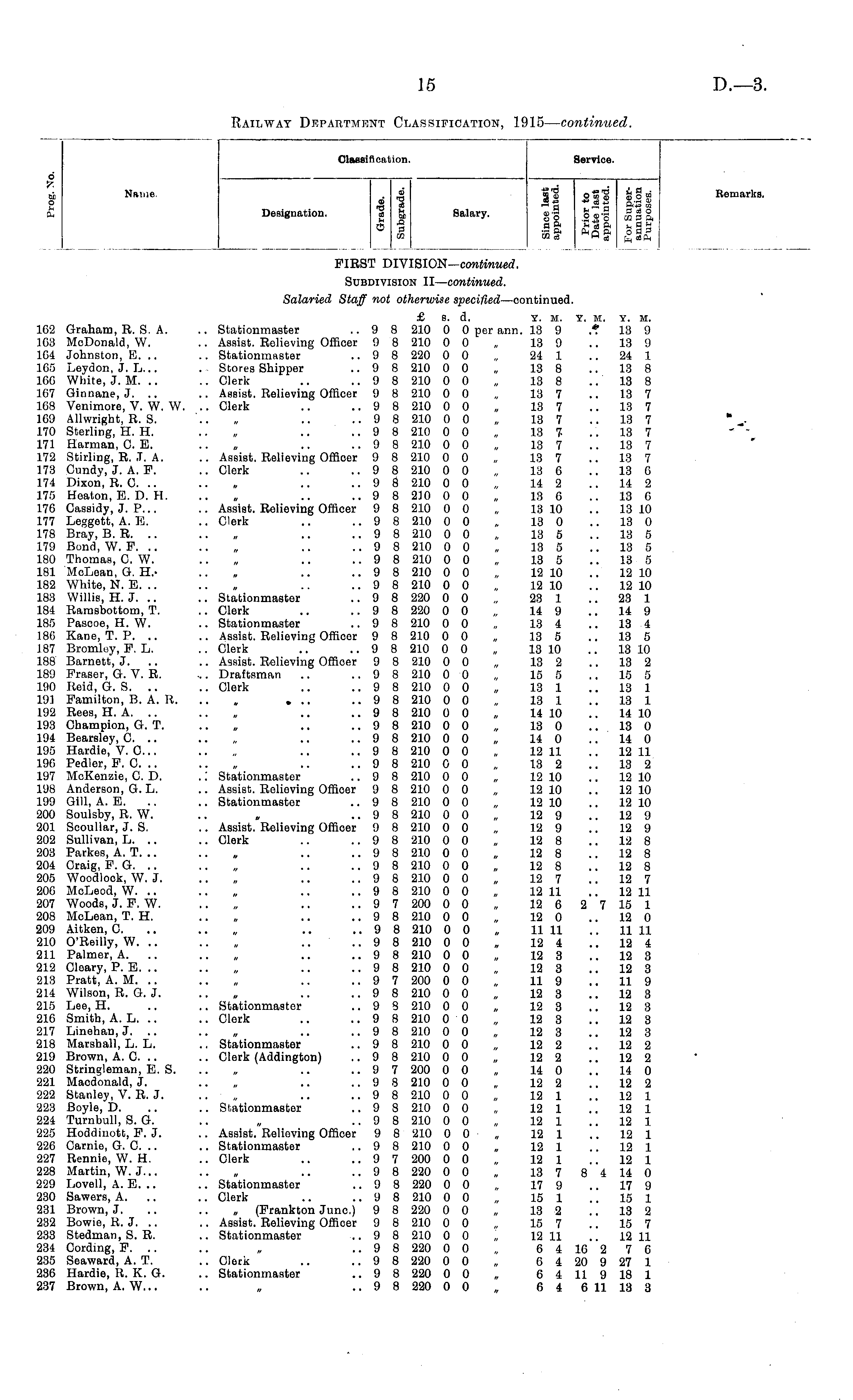 Olassi ft cation. Service. o 7T , ab Nftine, . ® o'S'g &§? Remarks. 2 5 - &4 Designation. a & Salary. ®-g 5 § a I ffig- gSS FIRST DIVISION—coraiinttetf. Subdivision II—continued. Salaried Staff not otherwise specified—continued. £ 8. d. Y. M. Y. M. Y. M. 162 Graham, R. S. A. .. Stationmaster ..9 8 210 0 0 per ann. 13 9 * 13 9 163 McDonald, W. .. Assist. Relieving Officer 9 8 210 0 0 „ 13 9 13 9 164 Johnston, E. .. .. Stationmaster .. 9 8 220 0 0 „ 24 1 24 1 165 Leydon, J. L... . Stores Shipper ..9 8 210 0 0 „ 13 8 13 8 166 White, J. M. .. .. Clerk .. .. 9 8 210 0 0 „ 13 8 .. 13 8 167 Ginnane, J. .. .. Assist. Relieving Officer 9 8 210 0 0 „ 13 7 .. 13 7 168 Venimore, V. W. W. .. Clerk .. ..9 8 210 0 0 „ 13 7 ..137 169 Allwright, R. S. .. „ .. .. 9 8 210 0 0 „ 13 7 13 7 170 Sterling, H. H. .. „ .. .. 9 8 210 0 0 „ 13 7- ..137 171 Harman, C. E. .. „ .. ..9 8 210 0 0 „ 13 7 13 7 172 Stirling, R. J. A. .. Assist. Relieving Offioer 9 8 210 0 0 „ 13 7 13 7 173 Cundy, J. A. F. .. Clerk .. .. 9 8 210 0 0 „ 13 6 .. 13 6 174 Dixon, R. 0. .. .. „ .. .. 9 6 210 0 0 „ 14 2 14 2 175 Hoaton, E. D. H. .. „ .. .. 9 8 230 0 0 „ 13 6 13 6 176 Cassidy, J. P... .. Assist. Relieving Offioer 9 8 210 0 0 „ 13 10 13 10 177 Leggett, A. E. .. Clerk .. .. 9 8 210 0 0 „ 13 0 .. 13 0 178 Bray, B. R. .. .. „ .. .. 9 8 210 0 0 „ 13 5 13 5 179 Bond, W. F. .. .. „ .. .. 9 8 210 0 0 „ 13 5 .. 13 5 180 Thomas, C. W. .. „ .. .. 9 8 210 0 0 „ 13 5 13 5 181 McLean, G. H.- .. „ .. .. 9 8 210 0 0 „ 12 10 12 10 182 White, N. E. .. .. „ .. .. 9 8 210 0 0 „ 12 10 12 10 183 Willis, H. J. .. .. Stationmaster ..9 8 220 0 0 „ 23 1 23 1 184 Ramsbottom, T. .. Clerk .. ..9 8 220 0 0 „ 14 9 14 9 185 Pascoe, H. W. .. Stationmaster -.9 8 210 0 0 „ 13 4 13 4 186 Kane, T. P. .. .. Assist. Relieving Officer 9 8 210 0 0 „ 13 5 13 5 187 Bromley, F. L. .. Clerk .. .. 9 8 210 0 0 „ 13 10 .. 13 10 188 Barnett, J. .. Assist. Rolieving Officer 9 8 210 0 0 „ 13 2 13 2 189 Fraser, G. V. R. ... Draftsman .. ..9 8 210 0 0 „ 15 5 .. 15 5 190 Reid, G. S. .. .. Clork .. .. 9 8 210 0 0 „ 13 1 13 1 191 Familton, B. A. R. .. . ... .. 9 8 210 0 0 „ 13 1 .. 13 1 192 Rees, H. A. .. .. „ .. .. 9 8 210 0 0 „ 14 10 14 10 193 Champion, G. T. .. „ .. ..9 8 210 0 0 „ 130 ..130 194 Bearsley, C. .. .. „ .. .. 9 8 210 0 0 „ 14 0 14 0 195 Hardie, V. C... .. „ .. ..9 8 210 0 0 „ 12 11 12 11 196 Pedler, F. C. .. .. „ .. .. 9 8 210 0 0 „ 13 2 13 2 197 McKenzie, C. I). . I Stationmaster ..9 8 210 0 0 „ 12 10 12 10 198 Anderson, G. L. .. Assist. Relieving Offioer 9 8 210 0 0 „ 12 10 .. 12 10 199 Gill, A. E. .. .. Stationmaster ..9 8 210 0 0 „ 12 10 12 10 200 Soulsby, R. W. .. „ .. 9 8 210 0 0 „ 12 9 12 9 201 Scoullar, J. S. .. Assist. Relieving Offioer 9 8 210 0 0 „ 12 9 12 9 202 Sullivan, L. .. .. Clerk .. ..9 8 210 0 0 „ 12 8 12 8 203 Parkes, A. T. .. .. „ .. .. 9 8 210 0 0 „ 12 8 12 8 204 Craig, F. G. .. .. „ .. .. 9 8 210 0 0 „ 12 8 12 8 205 Woodlock, W. J. .. „ .. .. 9 8 210 0 0 „ 12 7 12 7 206 McLeod, W. .. .. „ .. .. 9 8 210 0 0 „ 12 11 12 11 207 Woods, J. F. W. .. „ .. .. 9 7 200 0 0 „ 12 6 2 7 15 1 208 McLean, T. H. .. „ .. .. 9 8 210 0 0 „ 12 0 12 0 209 Aitken, C. .. .. „ .. .. 9 8 210 0 0 „ 11 11 11 11 210 O'Reilly, W. .. .. , .. .. 9 8 210 0 0 „ 12 4 12 4 211 Palmor, A. .. „ .. .. 9 8 210 0 0 „ 12 3 12 3 212 Cleary, P. E. .. .. „ .. .. 9 8 210 0 0 „ 12 3 12 3 213 Pratt, A.M... .. „ .. .. 9 7 200 0 0 „ 11 9 .. 11 9 214 Wilson, R. G. J. .. „ .. .. 9 8 210 0 0 „ 12 3 12 3 215 Lee, H. .. .. Stationmaster ..9 8 210 0 0 „ 12 3 ..123 216 Smith, A. L. .. .. Clork .. .. 9 8 210 0 0 , 12 3 .. 12 3 217 Linehan, J. .. .. „ .. .. 9 8 210 0 0 „ 12 3 12 3 218 Marshall, L. L. .. Stationmaster ..9 8 210 0 0 „ 12 2 12 2 219 Brown, A. C. .. .. Clerk (Addington) ..9 8 210 0 0 „ 12 2 12 2 220 Stringleman, E. S. .. „ .. ..9 7 200 0 0 „ 14 0 14 0 221 Macdonald, J. .. „ .. .. 9 8 210 0 0 „ 12 2 12 2 222 Stanley, V. R. J. „ .. ..9 8 210 0 0 „ 12 1 12 1 223 Boyle, D. .. .. Stationmaster ..9 8 210 0 0 „ 12 1 12 1 224 Turnbull, S. G. .. „ .. 9 8 210 0 0 „ 12 1 12 1 225 Hoddinott, F. J. .. Assist. Relieving Offioer 9 8 210 0 0 „ 12 1 12 1 226 Carnie, G. C. .. .. Stationmaster ..9 8 210 0 0 „ 12 1 12 1 227 Rennie, W. H. .. Clerk .. ..9 7 200 0 0 „ 12 1 12 1 228 Martin, W. J... .. „ .. ..9 8 220 0 0 „ 13 7 8 4 14 0 229 Lovell, A. E. .. .. Stationmastor ..9 8 220 0 0 „ 17 9 17 9 230 Sawers, A. .. .. Clerk .. ..9 8 210 0 0 „ 15 1 15 1 231 Brown, J. .. .. „ (Frankton June.) 9 8 220 0 0 „ 13 2 13 2 232 Bowie, R. J. .. .. Assist. Relieving Offioer 9 8 210 0 0 „ 15 7 15 7 233 Stedman, S. R. .. Stationmaster ..9 8 210 0 0 „ 12 11 ..12 11 234 Cording, F. .. .. „ .. 9 8 220 0 0 „ 6 4 16 2 7 6 235 Seaward, A. T. .. Clerk .. ..9 8 220 00 „ 64 20 9 27 1 236 Hardie, R. K. G. .. Stationmaster ..9 8 220 0 0 „ 64 11 9 18 1 237 Brown, A. W... .. „ .. 9 8 220 0 0 „ 6 4 6 11 13 3