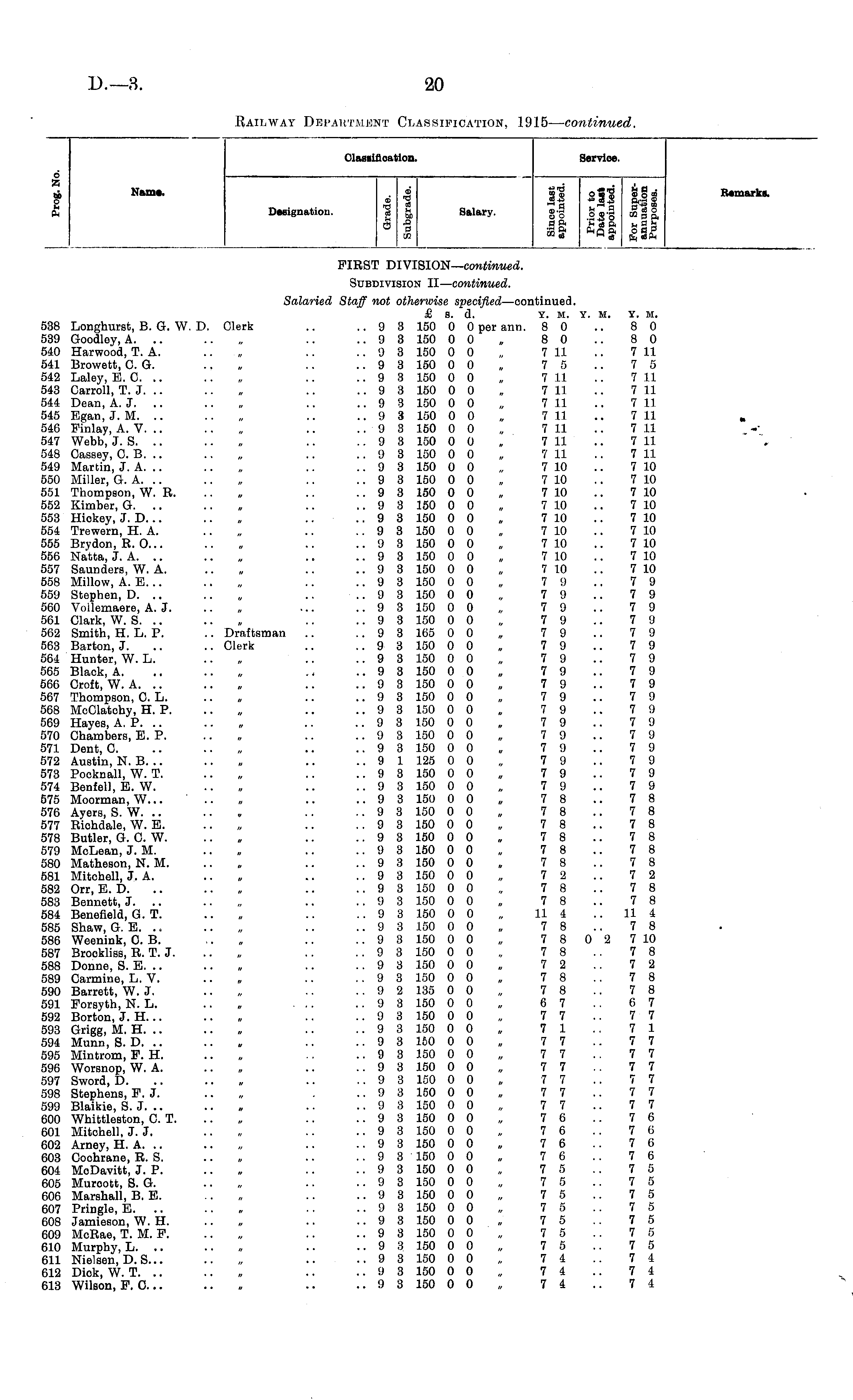 Classification. Service. o 55 . • Name. . ®" © o ® Remarks. 2 ,§ « ~s g®" PL, Designation. « g, Salary. g'g g «.§ £ g ° O "S So ?' fl cc U1 <6 w <a [i, «a P* FIRST DIVISION—continued. Subdivision II —continued. Salaried Staff not otherwise specified—continued. £ s. d. Y. M. Y. M. Y. M. 538 Longhurst, B. G. W. D. Clerk .. ..9 3 150 0 0 per ann. 8 0 .. 8 0 539 Goodley, A. .. .. „ .. .. 9 3 150 0 0 „ 8 0 .. 8 0 540 Harwood, T. A. .. „ .. .. 9 3 150 0 0 „ 7 11 .. 7 11 541 Browett, 0. G. ., „ .. .. 9 3 150 0 0 „ 7 5 .. 7 5 542 Laley, B.C... .. , .. .. 9 3 150 0 0 „ 7 11 .. 7 11 543 Carroll, T. J. .. .. „ .. .. 9 3 150 0 0 „ 7 11 .. 7 11 544 Dean, A. J. .. .. „ .. .. 9 8 150 0 0 „ 7 11 .. 7 11 545 Egan, J. M. .. .. „ .. ..9 3 150 0 0 7 11 .. 7 11 546 Finlay, A. V. .. .. „ .. .. 9 3 160 0 0 „ 7 11 .. 7 11 547 Webb, J. S. .. .. .. .. 9 3 150 0 0 7 11 .. 7 11 548 Cassey, C. B. .. .. „ .. .. 9 3 150 0 0 „ 7 11 .. 7 11 549 Martin, J. A. .. .. „ .. .. 9 3 150 0 0 „ 7 10 .. 7 10 550 Miller, G. A. .. .. „ .. .. 9 3 150 0 0 „ 7 10 .. 7 10 551 Thompson, W. R. .. „ .. .. 9 3 150 0 0 „ 7 10 .. 7 10 552 Kirnber, G. .. .. „ .. .. 9 3 150 0 0 „ 7 10 .. 7 10 553 Hiokey, J. D... .. „ .. .. 9 3 150 0 0 „ 7 10 .. 7 10 554 Trewern, H. A. .. „ .. .. 9 3 150 0 0 „ 7 10 .. 7 10 555 Brydon, R. 0... .. „ .. .. 9 3 150 0 0 „ 7 10 .. 7 10 556 Natta, J. A. .. .. „ .. .. 9 3 150 0 0 „ 7 10 .. 7 10 557 Saunders, W. A. .. „ .. .. 9 3 150 0 0 „ 7 10 .. 7 10 558 Millow, A. B... .. „ .. .. 9 3 150 0 0 „ 7 9 .. 7 9 559 Stephen, D. .. .. „ .. .. 9 3 150 0 0 „ 7 9 .. 7 9 560 Vollemaere, A. J. .. „ .. .. 9 3 150 0 0 „ 7 9 .. 7 9 561 Clark, W. S. .. .. „ .. .. 9 3 150 0 0 „ 7 9 .. 7 9 562 Smith, H. L. P. .. Draftsman .. .. 9 3 165 0 0 „ 7 9 .. 7 9 563 Barton, J. .. .. Clerk .. .. 9 3 150 0 0 „ 7 9 .. 7 9 564 Hunter, W. L. .. „ .. .. 9 3 150 0 0 „ 7 9 .. 7 9 565 Black, A. .. .. „ .. .. 9 3 150 0 0 „ 7 9 .. 7 9 566 Croft, W. A. .. .. „ .. .. 9 3 150 0 0 „ 7 9 .. 7 9 567 Thompson, C. L. .. „ .. .. 9 3 150 0 0 „ 7 9 .. 7 9 568 McClatchy, H. P. .. „ .. .. 9 3 150 0 0 „ 7 9 .. 7 9 569 Hayes, A. P. .. .. „ .. .. 9 3 150 0 0 „ 7 9 .. 7 9 570 Chambers, B. P. .. „ .. .. 9 3 150 0 0 „ 7 9 .. 7 9 571 Dent, C. .. .. „ .. .. 9 3 150 0 0 „ 7 9 .. 7 9 572 Austin, N. B. .. .. „ .. .. 9 1 125 0 0 „ 7 9 .. 7 9 573 Pocknall, W. T. .. „ .. .. 9 3 150 0 0 „ 7 9 .. 7 9 574 Benfell, B. W. .. „ .. .. 9 3 150 0 0 „ 7 9 .. 7 9 575 Moorman, W... .. „ .. ..9 3 150 0 0 „ 7 8 .. 7 8 576 Ayers, S. W. .. .. „ .. .. 9 3 150 0 0 „ 7 8 .. 7 8 577 Richdale, W. B. .. „ .. .. 9 3 150 0 0 „ 7 8 .. 7 8 578 Butler, G. C. W. .. „ .. .. 9 3 150 0 0 „ 7 8 .. 7 8 579 McLean, J. M. .. „ .. .. 9 3 150 0 0 „ 7 8 .. 7 8 580 Matheson, N. M. .. „ .. .. 9 3 150 0 0 „ 7 8 .. 7 8 581 Mitchell, J. A. .. „ .. .. 9 3 150 0 0 „ 7 2 .. 7 2 582 Orr, E. D. .. .. „ .. .. 9 3 150 0 0 „ 7 8 .. 7 8 583 Bennett, J. .. „ .. .. 9 3 150 0 0 „ 7 8 .. 7 8 584 Benefield, G. T. .. „ .. .. 9 3 150 0 0 , 11 4 .. 11 4 585 Shaw, G. B .. .. 9 3 150 0 0 „ 7 8 .. 7 8 586 Weenink, C. B. ,. „ .. .. 9 3 150 0 0 „ 7 8 0 2 7 10 587 Brookliss, R. T. J. .. „ .. .. 9 3 150 0 0 „ 7 8 .. 7 8 588 Donne, S. E. .. .. „ .. .. 9 3 150 0 0 „ 7 2 .. 7 2 589 Carmine, L. V. .. „ .. .. 9 3 150 0 0 , 7 8 .. 7 8 590 Barrett, W.J. .. „ .. .. 9 2 135 0 0 „ 7 8 .. 7 8 591 Forsyth, N. L. .. , ... .. 9 3 150 0 0 „ 6 7 .. 6 7 592 Borton, J. H... .. „ .. .. 9 3 150 0 0 „ 7 7 .. 7 7 593 Grigg, M. H „ .. .. 9 3 150 0 0 „ 7 1 .. 7 1 594 Munn, S. D. .. .. „ .. .. 9 3 150 0 0 „ 7 7 .. 7 7 595 Mintrom, F. H. .. „ .. ..9 3 150 0 0 „ 77 .. 77 596 Worsnop, W. A. .. „ .. ..9 3 150 0 0 „ 7 7 7 7 597 Sword, D. .. .. „ .. ..9 3 150 0 0 „ 77 .. 77 598 Stephens, F.J. „ . ..9 3 150 0 0 „ 77 .. 77 599 Blaikie, S. J. .. .. „ .. .. 9 3 150 0 0 „ 7 7 .. 7 7 600 Whittleston, C. T. .. „ .. .. 9 3 150 0 0 , 7 6 .. 7 6 601 Mitchell, J. J. .. „ .. .. 9 3 150 0 0 „ 7 6 .. 7 6 602 Arney, H. A. .. .. „ .. ..9 3 150 0 0 „ 76 .. 76 603 Cochrane, R. S. .. „ ■ ■ ..9 3 150 0 0 „ 76 .. 76 604 MoDavitt, J. P. .. „ .. .. 9 3 150 0 0 „ 7 5 .. 7 5 605 Muroott, 8. G. .. „ ■. ..9 3 150 0 0 „ 75 .. 75 606 Marshall, B. E. .. „ .. .. 9 3 150 0 0 „ 7 5 .. 7 5 607 Pringle, E. .. .. . .. .. 9 3 150 0 0 „ 7 5 .. 7 5 608 Jamieson, W. H. .. „ .. ..9 3 150 0 0 „ 75 .. 75 609 McRae, T. M. F. .. „ .. .. 9 3 150 0 0 „ 7 5 .. 7 5 610 Murphy, L. .. „ .. ..9 3 150 0 0 „ 75 .. 75 611 Nielsen, D. S... .. „ .. .. 9 3 150 0 0 „ 7 4 .. 7 4 612 Dick, W. T. .. .. „ .. .. 9 3 150 0 0 „ 7 4 .. 7 4 613 Wilson, F. C „ .. .. 9 3 150 0 0 „ 7 4 .. 7 4