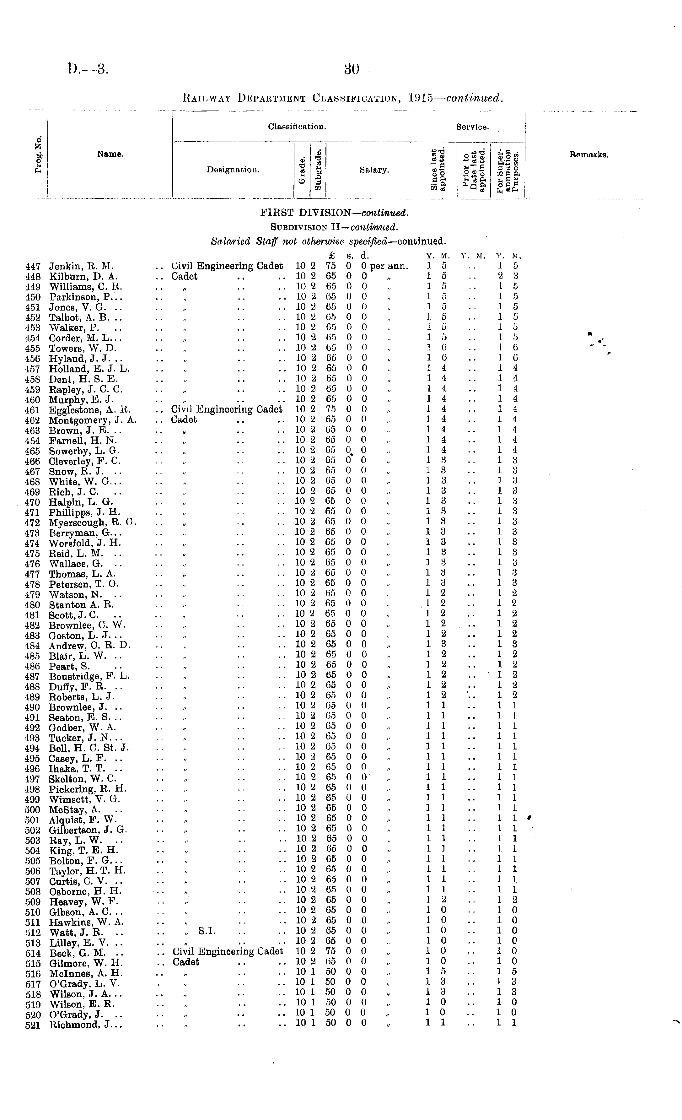 Classification. Service. o ¥\ tj, Name. . ® Remarks. £ T5 '— 1 J3 . r2 »■*» W ti .Designation. a a Salary. g' S S <c -g £ g ° <S "§ «S'?'8S'KSS co B «, "P §■ g FIRST DIVISION —continued. Subdivision II—continued. Salaried Staff not otherwise specified—continued. £ s. d. Y. M. Y. M. Y. M. 447 Jenkin, R. M. .. Civil Engineering Cadet 10 2 75 0 0 per ann. 15 .. 15 448 Kilburn, D. A. .. Cadet .. .. 10 2 65 0 0 „ 15 .. 2 3 449 Williams, C. B. .. „ .. .. 10 2 65 0 0 „ 15 .. 15 450 Parkinson, P. .. .. „ .. .. 10 2 65 0 0 „ 15 .. 15 451 Jones, V. G. .. .. . .. .. 10 2 65 0 0 „ 15 .. 15 452 Talbot, A. B. .. .. „ .. .. 10 2 65 0 0 ,, 1 5 .. 1 5 453 Walker, P. .. .. „ .. .. 10 2 65 0 0 „ 15 .. 15 454 Corder, M. L... .. „ .. .. 10 2 65 0 0 „ 15 .. 15 455 Towers, W. D. .. „ .. .. 10 2 65 0 0 „ 16 .. 16 456 Hyland, J. J. .. .. „ .. .. 10 2 65 0 0 „ 16 .. 16 457 Holland, E. J. L. .. „ .. .. 10 2 65 0 0 ,. 1 4 .. 1 4 458 Dent, H. S. E. .. „ .. .. 10 2 65 0 0 „ 14 .. 14 459 Rapley, J. C. C .. .. 10 2 65 0 0 „ 14 .. 14 460 Murphy, E. J. .. „ .. .. 10 2 65 0 0 1 4 .. 1 4 461 Egglestone, A. R. .. Civil Engineering Cadot 10 2 75 0 0 1 4 .. 1 4 462 Montgomery, J. A. .. Cadet .. .. 10 2 65 0 0 1 4 .. 1 4 463 Brown, J. E. .. .. . .. .. 10 2 65 0 0 ,. 1 4 .. 1 4 464 Farnell, H. N. .. „ .. .. 10 2 65 0 0 „ 14 .. 14 465 Sowerby, L. G. .. „ .. .. 10 2 65 0 0 „ 14 .. 14 466 Cleverley, F. C. .. „ .. .. 10 2 65 0 0 „ 13 .. 13 467 Snow, R. J. • • » .. 10 2 65 0 0 „ 13 .. 13 468 White, W. G... .. ,, .. .. 10 2 65 0 0 1 3 .. 1 3 469 Rich, J. C. .. .. „ .. .. 10 2 65 0 0 „ 13 .. 13 470 Halpin, L. G. .. „ .. .. 10 2 65 0 0 „ 13 .. 1 3 471 Phillipps, J. H. .. .. 10 2 65 0 0 „ 13 .. 13 472 Myerscough, R. G. .. ,, . .. 10 2 65 0 0 ,. 1 3 .. 1 3 473 Berryman, G... .. „ .. 10 2 65 0 0 „ 18 .. 13 474 Worsfold, J. H. .. „ .. 10 2 65 0 0 „ 13 .. 13 475 Reid, L. M. .. .. „ .. .. 10 2 65 0 0 „ 13 .. 13 476 Wallaoe, G. .. . • , • • .. 10 2 65 0 0 „ 13 .. 13 477 Thomas, L. A. .. « .. 10 2 65 0 0 „ 13 .. 13 478 Petersen, T. O. ■. „ ■ - 10 2 65 0 0 „ 13 .. 13 479 Watson, N. .. .. „ .. 10 2 65 0 0 „ 12 .. 12 480 Stanton A. R. .. „ ■■ .. 10 2 65 0 0 „ .12 .. 12 481 Scott, J. C •• .. 10 2 65 0 0 „ 12 .. 12 182 Brownlee, C. W. .. •. .. 10 2 65 0 0 „ 12 .. 12 483 Goston, L. J. .. • ■ » • • .. 10 2 65 0 0 „ 12 .. 12 484 Andrew, C. R. D. .. „ .. 10 2 65 0 0 „ 13 .. 13 485 Blair, L. W. .. - • • 10 2 65 0 0 1 2 .. 1 2 486 Peart, S. . • ■ • • • .. 10 2 65 0 0 „ 12 .. 12 487 Boustridge, F. L. .. „ • • .. 10 2 65 0 0 „ 12 .. 12 488 Duffy, F. R. .. .. „ ■■ .. 10 2 65 0 0 „ 12 .. 12 489 Roberts, L. J. .. ■■ .. 10 2 65 0 0 ,. 1 2 . 12 490 Brownlee, J. .. . • „ • ■ 10 2 65 0 0 „ 11 .. 11 491 Seaton, E. S. .. .. ,> • • 10 2 65 0 0 „ 11 .. 11 492 Godber, W. A. .. „ .. .. 10 2 65 0 0 „ 11 .. 11 493 Tucker, J. N. .. . . „ ■ ■ .. 10 2 65 0 0 „ 11 .. 11 494 Bell, H. C. St. J • • .. 10 2 65 0 0 „ 11 .. 11 495 Casey, L. F. • ■ • • » • • .. 10 2 65 0 0 „ 11 .. 11 496 Ihaka, T. T. .. .. » • • .. 10 2 65 0 0 „ 11 .. 11 497 Skelton, W. C. .. „ • • .. 10 2 65 0 0 „ 11 .. 11 498 Pickering, R. H. .. „ ■ - 10 2 65 0 0 „ 11 .. 11 499 Wimsett, V. G. .. „ • • 10 2 65 0 0 „ 11 .. 11 500 McStay, A. .. . • . • ■ .. 10 2 65 0 0 „ 11 .. 11 501 Alquist, F. W. •• „ • • .. 10 2 65 0 0 „ 11 .. 1 1 ' 502 Gilbertson, J. G. ■ • « ■ • 10 2 65 0 0 „ 11 .. 11 503 Ray, L. W. .. • • >• • • 10 2 65 0 0 „ 11 .. 11 504 King, T. E. H. .. „ ■■ .. 10 2 65 0 0 „ 11 .. 11 505 Bolton, F. G... .. „ • • .. 10 2 65 0 0 „ 11 .. 11 506 Taylor, H. T. H. .. „ ■ ■ 10 2 65 0 0 „ 11 11 507 Curtis, C. V. .. • • - • ■ .. 10 2 65 0 0 „ 11 .. 11 508 Osborne, H. H. „ • ■ • • '0 2 65 0 0 „ 11 .. 1 1 509 Heavey, W. F. .. • • .. 10 2 65 0 0 „ 12 .. 12 510 Gibson, A. C. .. .. „ ■ • .. 10 2 65 0 0 „ 10 .. 10 511 Hawkins, W. A. .. » • .. 10 2 65 0 0 „ 10 .. 10 512 Watt, J. R S.I 10 2 65 0 0 „ 10 .. 10 513 Lilley, E. V. .. .. „ ■■ .. 10 2 65 0 0 „ 10 .. 10 514 Beok, G. M. .. .. Civil Engineering Cadet 10 2 75 0 0 „ 10 .. 1 0 515 Gilmore, W. H. .. Cadet .. 10 2 65 0 0 „ 10 .. 10 516 Mclnnes, A. H. .. „ .. .. 10 1 50 0 0 „ 15 .. 15 517 O'Grady, L. V. ■ • .. 10 1 50 0 0 „ 13 .. 13 518 Wilson, J. A. .. .. „ .. 10 1 50 0 0 w 13 .. 13 519 Wilson, E. R. • • „ .. .. 10 1 50 0 0 „ 10 .. 10 520 O'Grady, J •• .. 10 1 50 0 0 „ 1 0 .. 1 0 521 Richmond, J... ■■ » •• .. 10 1 50 0 0 „ 11 .. 11